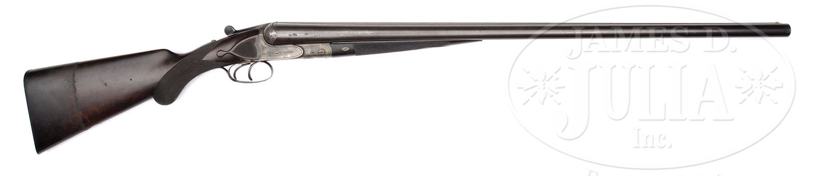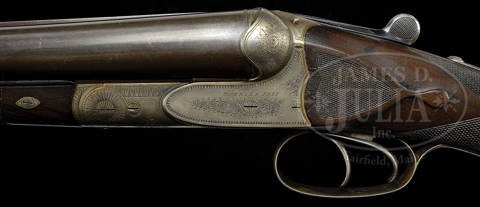 Please Note: Pre-ban ivory bead sight. Special Note: This item contains or is made of ivory. Do not bid on this lot unless you have read and agreed to our “Ivory Position Statement” and the “Waiver of Legal and Financial Risk to James D. Julia in regards to your Purchase of an Ivory Object“. This information is located in our catalog on pages 30 and 31. AS FOUND CHARLES DALY BOXLOCK EJECTOR TEN BORE GAME GUN BY LINDNER.SN 1679. Cal. 10 ga. 2-7/8″ Chambers. 32″ Dovetailed steel bbls are engraved “Charles Daly Krupp Fluid Steel Barrels” in milled out portion of matted, concave, game rib mounted with two certifiable antique ivory beads. Bbl flats are stamped with German imperial black powder proofs, bottoms of bbls with “S” and HAL crossed pistol logos. Robust boxlock action with long bar, features automatic safety (SAFE inlaid in gold), pin type cocking indicators, square crossbolt third fastener, side clips, intercepting sears, and checkered double triggers. Action is engraved with geometric borders and about 30% coverage of scroll. “Charles Daly” is on each side. Dense, well figured and streaked European walnut semi-pistol grip buttstock measures 14-1/4″ over orig ribbed horn buttplate, and features checkered side panels with long teardrop points, point pattern checkering at grip, and vacant silver oval on toe line. Matching splinter ejector forend has Deeley release. (Horn tip insert missing) Bore diameter: left-.755, right -.755. Bore restrictions: left -.025 (Mod), right -.025 (Mod). Wall thickness: left -.051, right -.058. Drop at heel: 1-7/8″, drop at comb: 1-9/16″. Weight: 10 lbs. 4 oz. LOP: 14-1/4″. Special Note: This item contains or is made of ivory. Do not bid on this lot unless you have read and agreed to our“Ivory Position Statement”and the “Waiver of Legal and Financial Risk to James D. Julia in regards to your Purchase of an Ivory Object”. This information is located in our catalog on pages 30 and 31. CONDITION: Very fine, as found. Bbls retain approx 80% orig blue, thinned considerably from normal handling wear. Action retains most of its orig case hardening color, under a layer of grime, so difficult to determine exact percentage. Stocks retain nearly all their orig rubbed oil finish, dry with open grain, and slight discoloration around butt where rubber slip-on pad was removed. Checkering slightly worn and dirty. There is a fairly deep ding at grip and horn forend tip missing (as previously stated). There is an incipient crack on left side behind action running from apex of action scallop for about 1″ through side panel. Bores are excellent, shiny, but show some slight frosting throughout. Action is tight. Bbls are on face. Right ejector won’t fire. This gun has been in storage for a long time, and is in need of a good cleaning. These big tens have been given a new lease on life with the excellent non-tox ammunition available from RST. 4-49580 (1,500-2,500) – Lot 2363