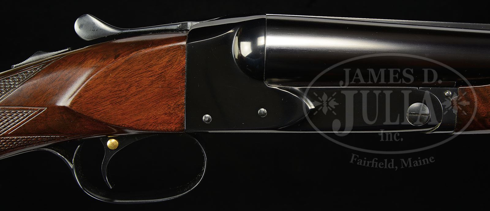 *WINCHESTER MODEL 21 TRAP GRADE WITH BRILEY CHOKES.SN 19692. Cal. 12 ga. 2-3/4″ Chambers. 30″ Bbls marked Full and Full, have Winchester markings on side of left bbl, and all correct markings on bbl flats and water table. Briley thin wall chokes have been installed. Standard action has polished water table, and features non-automatic safety and selective single blued trigger. Trigger plate is marked “TRAP”. Nicely crotch figured American walnut straight grip buttstock measures 14-1/4″ over black KICKEEZ pad, and features standard checkering. Matching beavertail ejector forend has reinforcing brace. Bore diameter: left-.736, right -.735. Bore restrictions: Screw chokes. Drop at heel: 1-3/4″, drop at comb: 1-3/8″. Weight: 7 lbs. 8 oz. LOP: 14-1/4″. Gun is accompanied by three Briley thin wall tubes (two others are installed in gun) with wrench. CONDITION: Excellent, as exceptionally well refinished, retaining essentially all finishes on wood and metal with a few light handling marks. Bores are excellent. Action is tight. Mechanically crisp. Briley tubes are fine, wrench shows considerable use. 4-51286 MGM137 (4,000-6,000) – Lot 2364