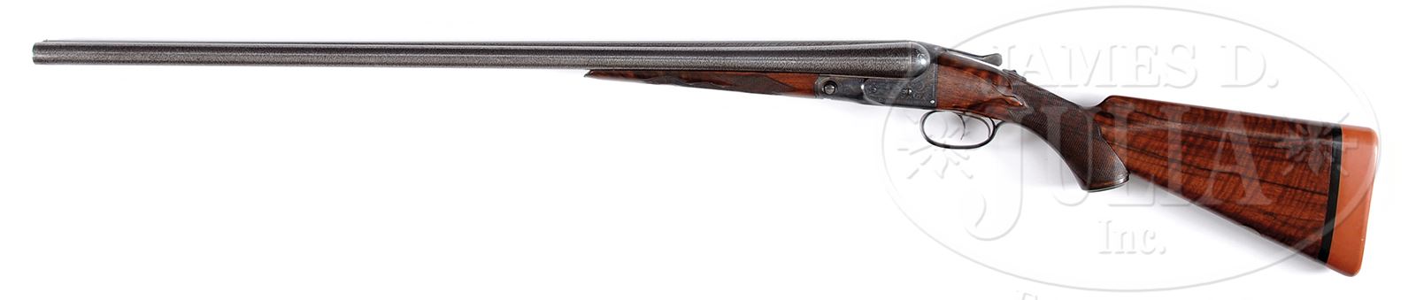 *FINELY RESTORED PARKER CHE WITH BERNARD BARRELS.SN 95372. Cal. 12 Ga. 30″ Bernard steel bbls. 2-5/8″ chambers. Steel front bead. Parker matted rib with rib marking “PARKER BROS. MAKERS, MERIDEN, CONN BERNARD STEEL”. Double triggers, auto ejectors and auto safety, # 2 frame size. Pistol grip buttstock and splinter forearm checkered in traditional CHE pattern. LOP 14-1/4″ with 1-1/4″ Red Silvers pad. Un-engraved gold name shield in stock. Receiver with Pointer on left, Setter on right. Deer in game scene on bottom, all surrounded with Parker scroll. Weight 7 lbs. 12 oz. According to The Parker Story one of 250 made in this configuration. This gun originally shipped without ejectors, but was likely returned to Parker Bros. to have the ejectors added. CONDITION: Excellent as restored. Retains virtually all finish to metal and wood as restored by Brad Bachelder. Forearm wood shows repair. Mechanics excellent. Quiet an eye catching Bernard barreled Parker. 49326-2 JSL11 (7,000-11,500) – Lot 2364