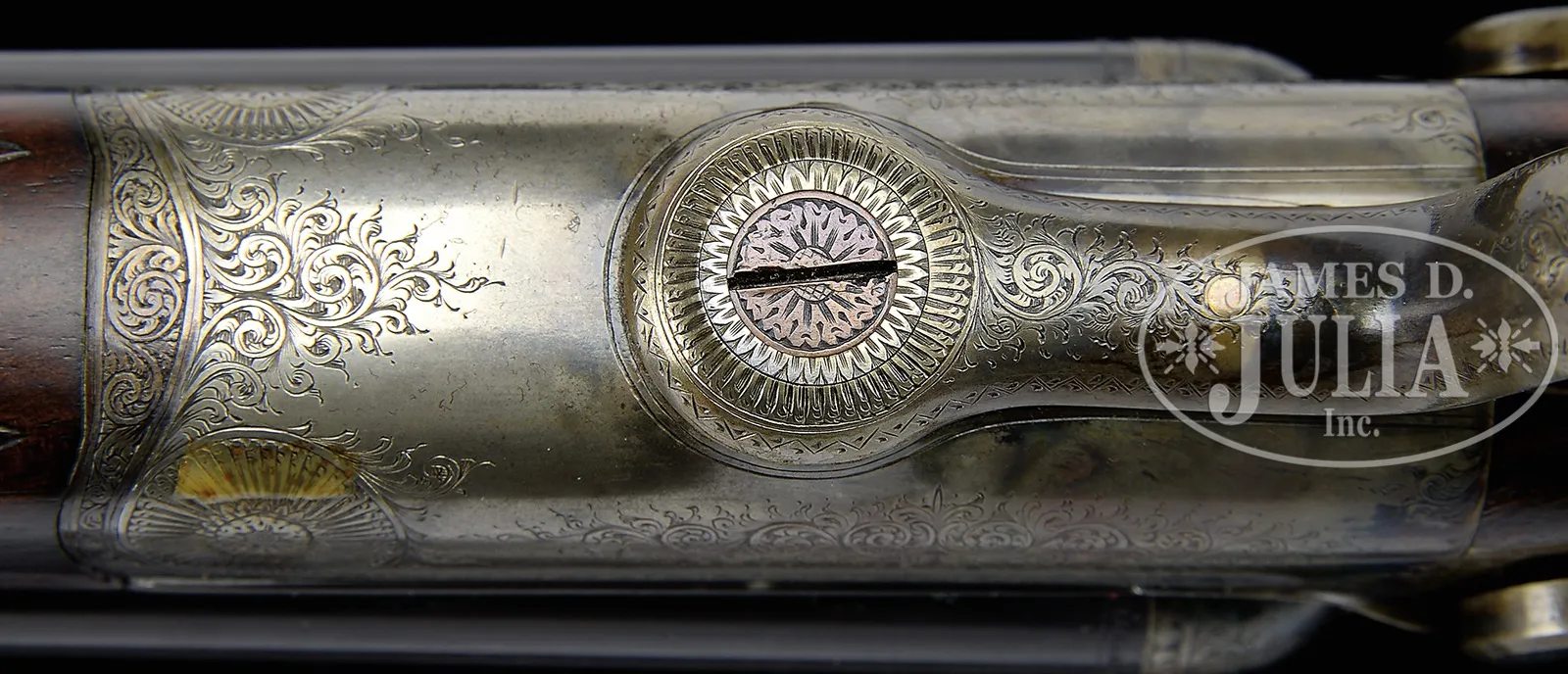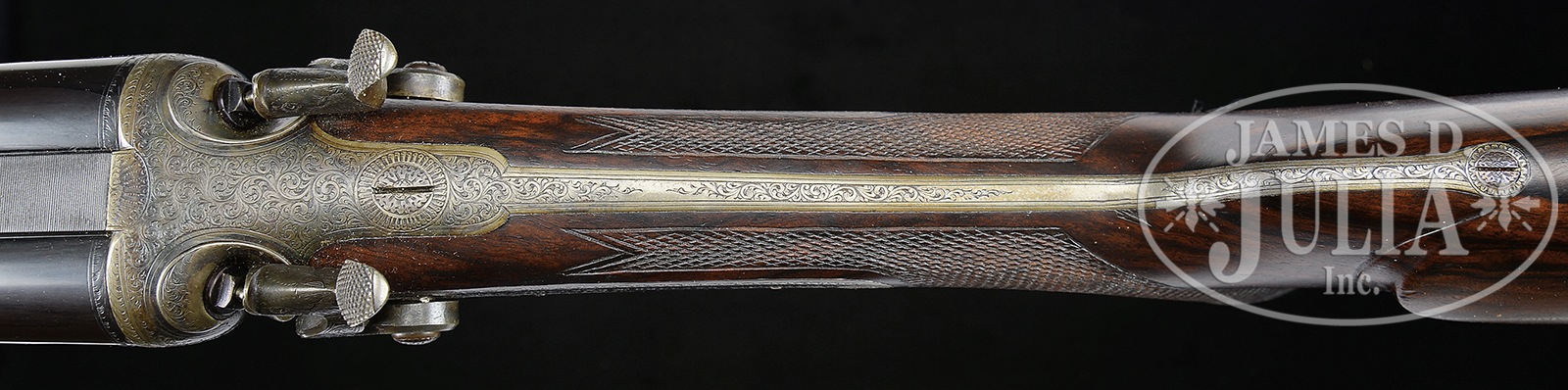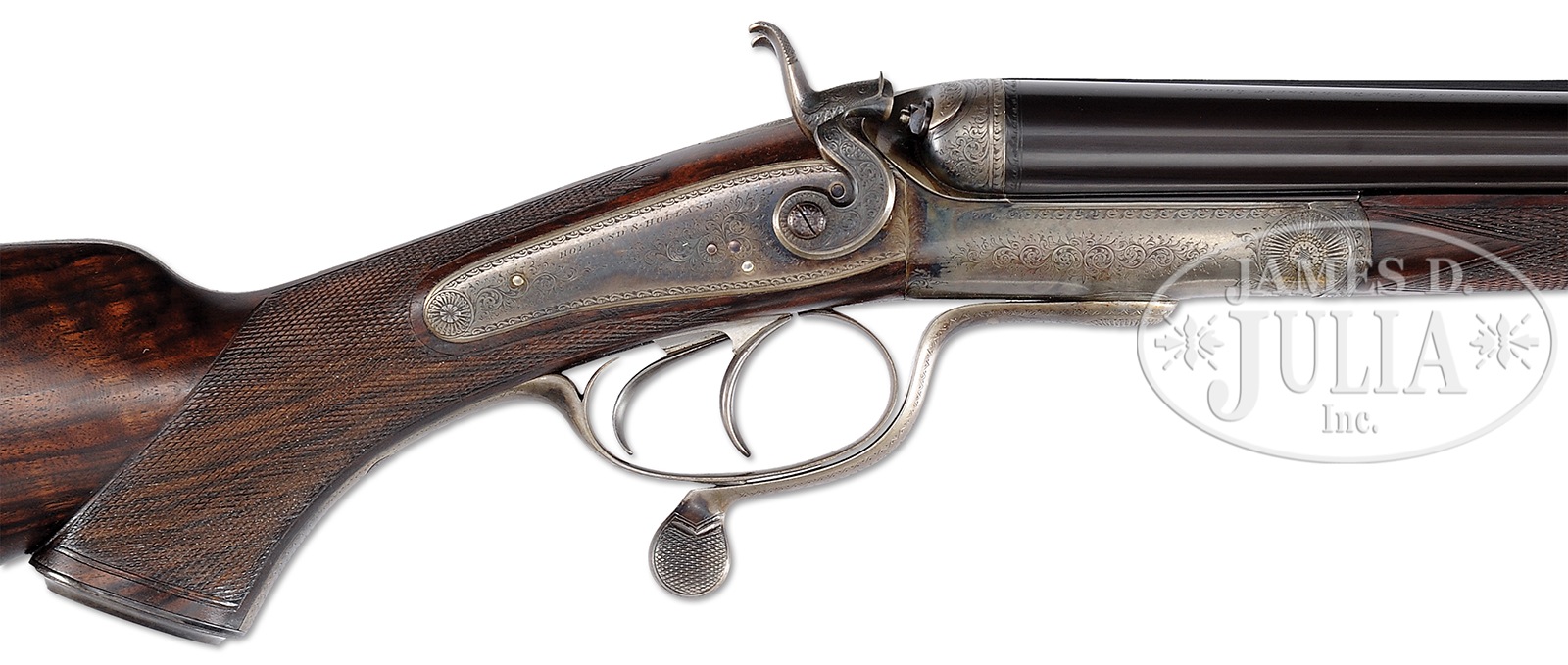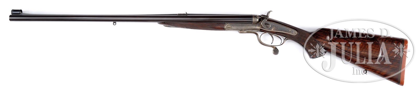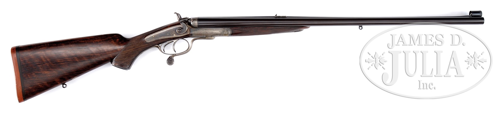 ANTIQUE HOLLAND & HOLLAND HAMMER DOUBLE RIFLE WITH CASE AND ACCESSORIES.SN 19024. (1898) Cal. .500 BPE. 26″ Dovetailed steel bbls are fitted with full length rib, rear portion is matted, behind one standing, two folding leaf express rear sight. Unmatted rib section is swamped and gradually rises and transitions again to matting, in front of slight ramp for silver bead with flip-up moon bead front sights. Orig sight protector is present. Bbl flats are stamped with London black powder proofs for .500 EX. Bottoms of bbls are stamped with SNs. A sling eye is soldered to bottom rib. Round bodied, Jones underlever action has long top strap which extends over comb in typical H&H style. Action is fitted with rebounding back locks sporting flat faced serpentine hammers with stylized dolphin heads and tall spurs. Action and locks are engraved with approx 60% coverage well cut scroll. “Holland & Holland” is at the top of each lockplate. Left side of action bar is engraved “Charge 5 Drams Case 3-1/4 Inches”. Case hardened trigger guard has SN on tang which extends to engraved steel grip cap. Very fine, closely streaked, and nicely fiddle figured European walnut capped pistol grip buttstock measures 14-1/2″ over what may be orig Silver pad. Stock features right hand shadow line cheekpiece, point pattern checkering, and a vacant silver oval and sling eye on toe line. Matching splinter forend has forward pivoting bolt release. Drop at heel: approx 2-7/8″, drop at comb: approx 1-3/4″. Weight: 9 lbs. 9 oz. LOP: 14-1/2″. High quality, newly made, oak and leather case with shaped brass corners and circular central medallion is lined in deep burgundy velvet, and has reproduction early paper H&H label in lid. Case is semi french fitted for an array of finely crafted ivory handled accessories. Ivory was sourced from a large legally hunted tusk supplied by consignor. “Certifiable pre-ban elephant ivory” accessories include shot dipper, turnscrew, striker key, bullet fixer, dusting brush, striker bottle, and handle of 3-pc brass cleaning rod. Other accessories include Davis type front pour bullet mold marked “500” casting a conical bullet, three square oil bottles, pair of snap caps, “.500” marked broken case extractor, and a Hawksley capper and recapper. PROVENANCE: Invoice for purchase of this rifle, and copy of ledger page indicating rifle was made for “Mr. Watson” and confirming other specifications including “recoil, heel plate”. Special Note: This item contains or is made of ivory. Do not bid on this lot unless you have read and agreed to our "Ivory Position Statement" and the "Waiver of Legal and Financial Risk to James D. Julia in regards to your Purchase of an Ivory Object." This information is located in the front section of our catalog. CONDITION: Excellent, as refinished, possibly by factory, and retaining nearly all of a fine bbl blue, engraving slightly softened. Action and locks retain 70% new color, subsequently silvered on bottom, fences, and tangs. Stocks retain nearly all of a renewed hand rubbed oil finish over some light marks. Checkering re-cut. Bores are very good with strong rifling throughout, shiny but with scattered pitting, mostly toward breech ends. Action is tight. Bbls are on face. Locks are crisp. Case leather is excellent with a few light marks and scuffs. Straps and handle are excellent. Interior cloth shows some compressions. Label is excellent. Metal parts of accessories are considerably tarnished and need polishing. Ivory handle of striker key is checked. 49958-9 MGM84 IVORY (8,000-12,000) – Lot 2365 Click here to view provenance