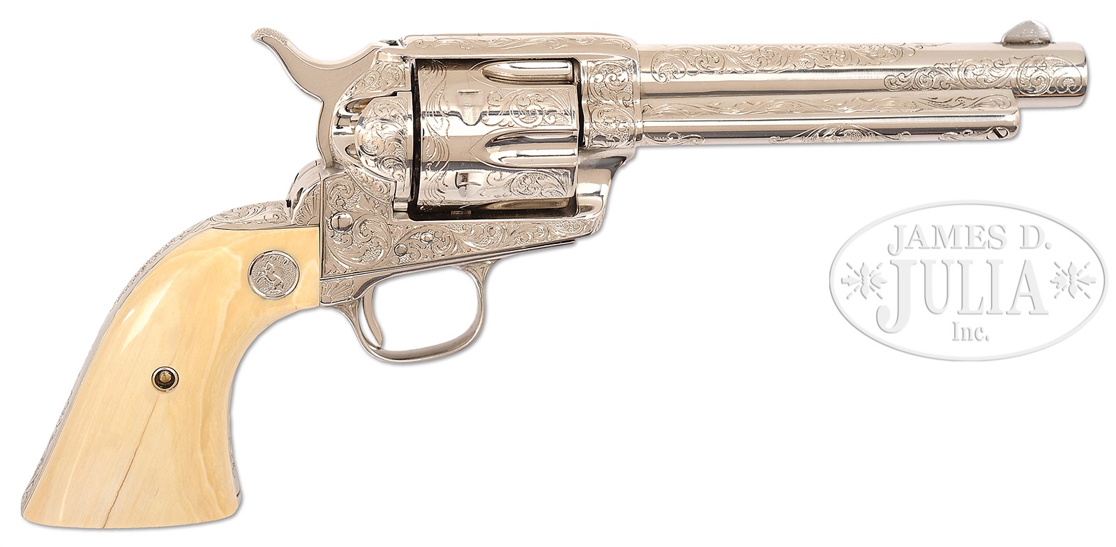 ENGRAVED COLT SAA REVOLVER WITH TWO PIECE IVORY GRIPS.