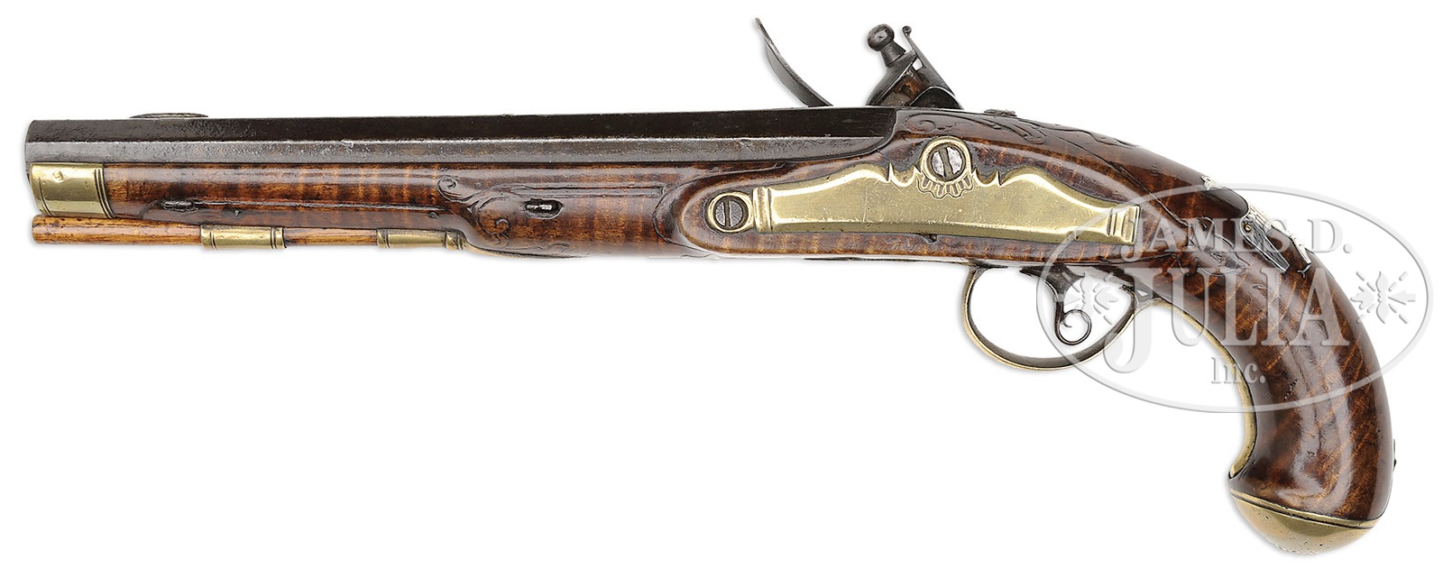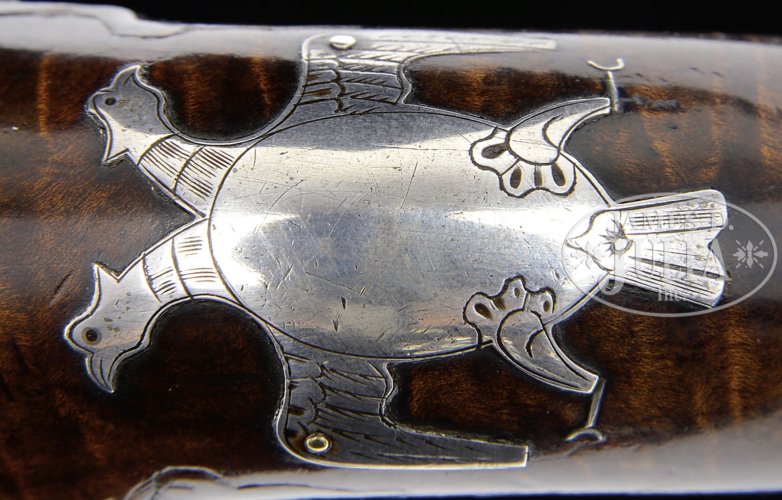 EXCEEDINGLY RARE AND DESIRABLE BUCKS COUNTY RELIEF CARVED FLINTLOCK BY ANDREW VERNER.SN NSN. This pistol is a Bucks County masterpiece. Andrew Verner is recognized as one of the finest, if not the finest gunsmith of Bucks County, PA. Pictures of one of Verner’s finest rifles are on pp. 38-42 of David Hansen’s new book An Intimate Look at The American Longrifle its Art and Evolution. This pistol has a 9-1/8″ full oct unmarked iron 57 Cal. smooth bbl. Overall 14-1/2″. Flintlock plate is marked “Ketland”. Beautiful curly maple stock is incised carved behind bbl tang, behind lock and sideplate and around rear entrance furrule. Intricate designs of delicate incised carving create a unique effect using single incise lines rather than usual raised carvings. Heavy beveled brass sideplate is nearly identical to the sideplate on Verner rifle pictured in Hanson’s book but has a scallop design under the top screw which is also present around the screw on the buttcap. Brass trigger guard ends in an arrow head finial and has a 4 petaled flower engraved on bow. 8 pointed silver star inlay attractively placed between trigger guard and rear ramrod pipe. A silver double headed eagle inlay, a heraldic symbol of great power and influence reaching back to great Roman empire and German Emperor, is located on top of pistol grip. Identical inlay is also found on magnificent Verner rifle pictured in Hanson’s book. 3/4″ brass nosecap notched for ramrod is typical of those used on rifles of Bucks County area. Very intricate beautifully scrolled trigger is similar to Verner rifle in Hanson’s classic book. Classic Bucks County incised carved fleur-de-lis design to rear of lockplate and sideplate is similar to design shown on Verner rifle in Hanson’s book executed in silver wire inlay. This pistol probably dates as early as 1790. This pistol was awarded the National Rifle Associations silver metal as one of the 10 best exhibited at NRA annual meetings. PROVENANCE: Ex Dave Hanson and Thomas Wilson Collections. Frank Sujansky Collection. CONDITION: Remarkable original condition. Pistol is in overall exceedingly fine condition. 4-49463 RG26 (65,000-85,000) – Lot 2367