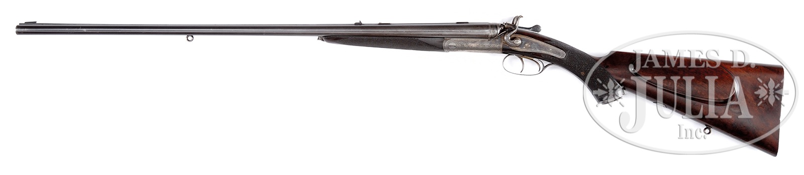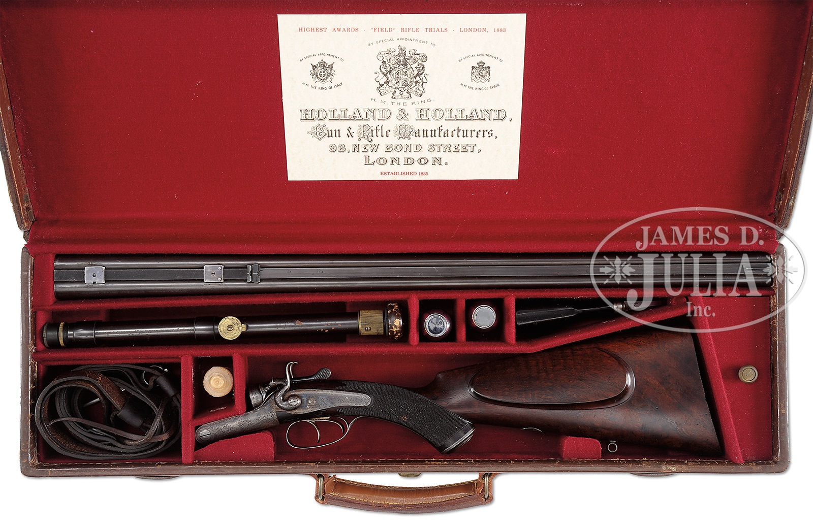 VERY FINE HOLLAND & HOLLAND TOP LEVER HAMMER RIFLE WITH ORIGINAL HOLLAND PATENT SCOPE AND CASE.SN 12275. (ca 1890) Cal. .360 BPE 2-1/4. 26″ Dovetailed steel bbls have full length rib mounted with one standing, two nested leaf express rear sight with platinum lines, with standing leaf marked for 50 and 150 yards, and nested leaves marked for 200 and 250 yards. Central portion of rib is slightly swamped, and rises toward muzzle forming ramp for silver bead front sight. Portion behind express sight is file cut, and fitted with Holland patent scope bases. Tops of bbls are engraved with H&H New Bond Street London address on right, and “Field” rifle trial information on left. Bbl engraving is offset to sides making it legible with scope installed. Bbl flats are stamped with London black powder proofs for .350. Bottoms of bbls are stamped with SN, and a sling eye is soldered to bottom rib. Small sized, round bodied, case hardened, top lever action is fitted with rebounding peninsula back locks mounted with round bodied serpentine hammers with stylized dolphin heads. Action and locks are engraved with approx 70% coverage well cut scroll with some rose bouquet highlights. “Holland & Holland” is at the top of each lockplate. Blued trigger guard with scroll on bow, has SN on tang which extends to steel grip cap. Nicely fiddle figured and lightly marbled European walnut capped pistol grip buttstock measures 14-1/2″ over serrated wood butt, and features classic right hand shadow line cheekpiece, point pattern checkering which wraps over top of grip, and a sling eye matching that on bbl, and a silver oval engraved with monogram “GLG” (?) on toe line. Matching splinter forend has Anson release. Rifle is accompanied by its orig H. Holland patent 2 X (?) scope with soldered on rings. This scope is similar to a scope designed by Col. Davidson and used in American Civil War. H. Holland patented his improvements in 1887 with adjustable crosshairs and focus, and spring loaded ocular lens with leather padded boss. This particular scope is marked with Holland & Holland name and address over “PATENT”. Drop at heel: approx 2-5/8″, drop at comb: approx 1-3/4″. Weight with scope: 8 lbs. 1 oz. LOP: 14-1/2″. Old leather case with riveted on brass corners is embossed with Old English style “S” at top center, and “30 SUPER” at right front. Case is lined in burgundy cloth and has large reproduction H&H paper label in lid. Case contains H&H marked horn handled turnscrew, two modern pewter oil bottles, case straps, broken case extractor, and a bone striker case containing scope mount parts. CONDITION: Very fine, original, as found. Bbls retain approx 60% orig blue, considerably thinned and silvered from normal hand wear on sides. Action and lockplates retain 50 – 60% of their orig case hardening color. Top lever is only slightly silvered on thumbpiece. Trigger guard retains approx 40% of its orig blue, with considerable loss due to flaking. Stocks retain most of their orig hand rubbed oil finish, with numerous light marks, and a few very deep scratches on either side toward butt. Checkering is slightly worn and grimy. Remainder of rifle has considerable congealed oil, and is in need of a good cleaning. Bores are excellent. Action is tight. Bbls are on face. Locks are crisp. Scope is very fine, with some flecking and rust spots on its orig blue, considerable orig lacquer remains on brass parts. Leather padding of ocular has numerous scuffs. Detent for rear scope mount is disassembled, with rod and spring in striker bottle, retaining wheel is missing, but would not be difficult to fabricate. Optics are clouded and spotted, but crosshair still visible. Case leather is dark, and has a number of scuffs. Renewed interior cloth is excellent, as is reproduction label. Accessories are good. A good handling small rifle with exceptionally early use of telescopic sight. 49958-7 MGM77 (7,000-10,000) – Lot 2368