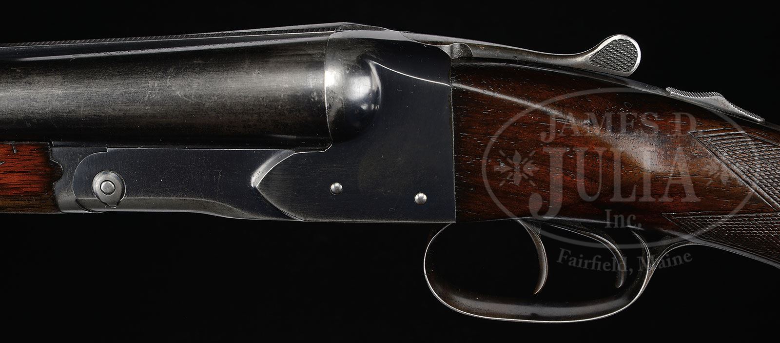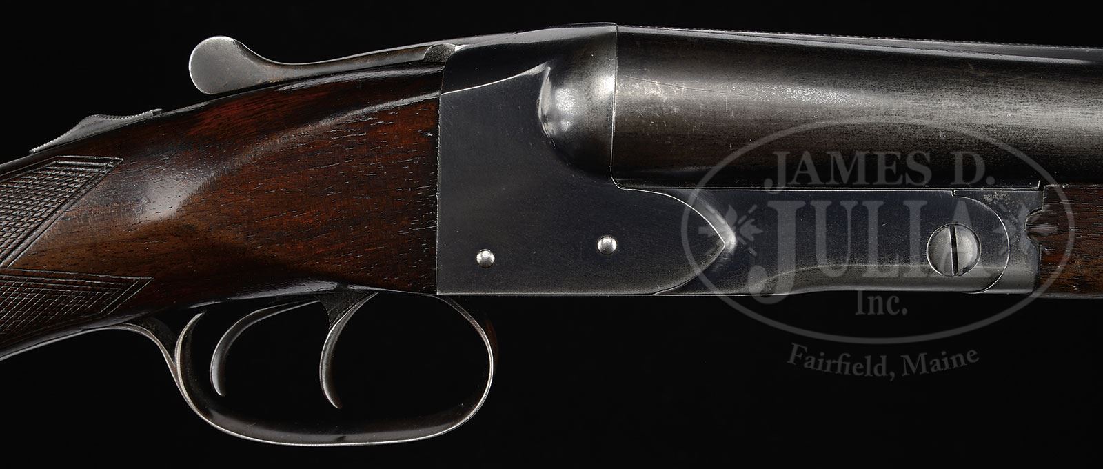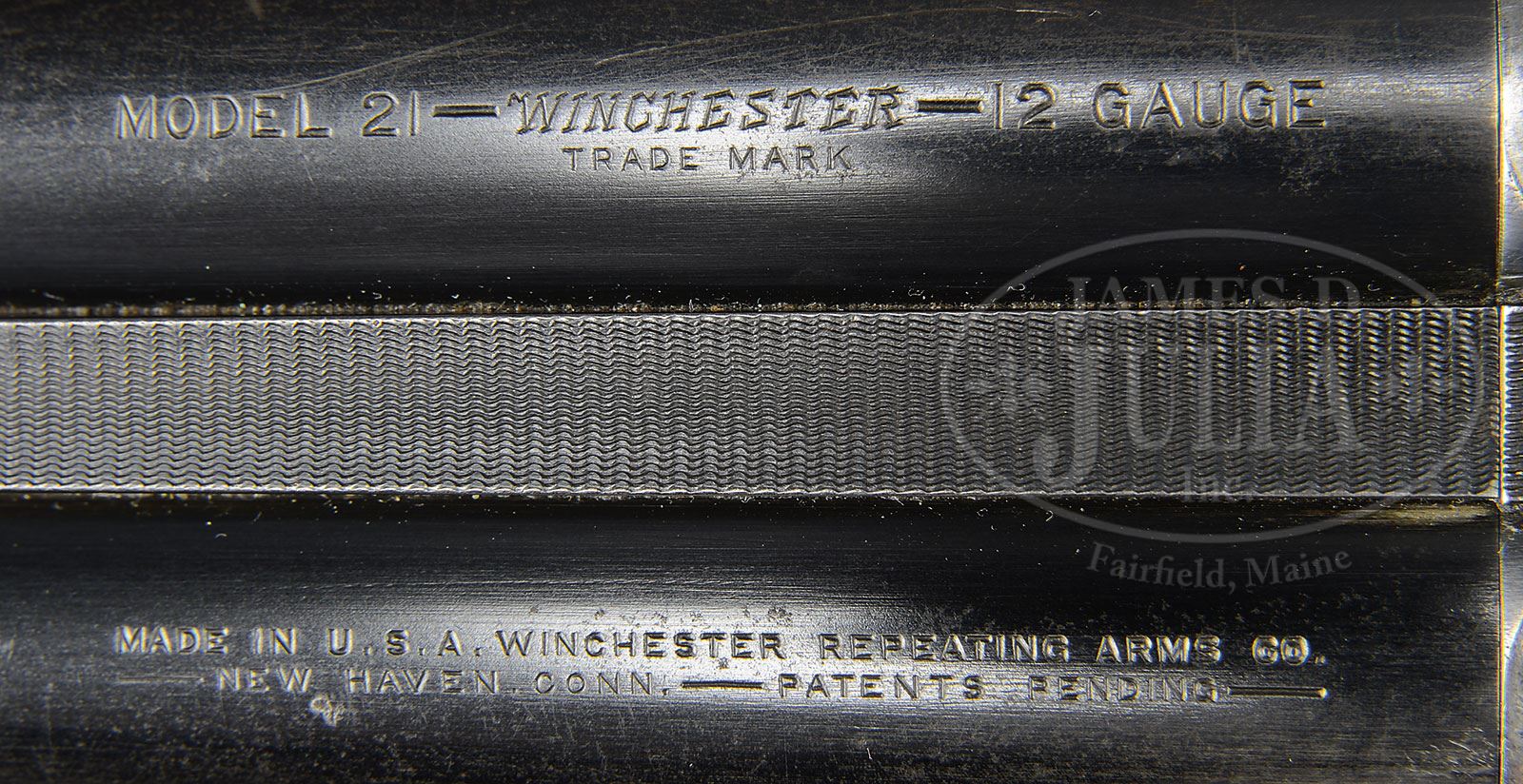 *EARLY WINCHESTER MODEL 21 STANDARD GRADE.SN 1442. Cal. 12 ga. 2-3/4″ Chambers. 28″ Bbls are marked “cyl” and “mod, and are marked with Winchester and gauge information on tops. All correct markings are on bbl flats. Blued water table is only marked with Winchester proof. Standard step side action features automatic safety and double triggers. Plain American walnut long pistol grip buttstock measures 14″ over Winchester composition buttplate and features standard checkering. Matching splinter forend has typical J-spring and early knurled button secondary release. Bore diameter: left-.729, right -.728. Bore restrictions: left -.012 (lt mod), right -.000 (cyl). Minimum wall thickness: left: .038, right: .035. Drop at heel: 2-1/2″, drop at comb: 1-1/2″. Weight: 7 lbs. 4 oz. LOP: 14”. PROVENANCE: Ed Johnston Estate Collection. CONDITION: Fine. Bbls retain approx 60% orig blue, considerably thinned and silvered at normal wear points with a few minor marks overall. Action retains 60 – 70% orig blue, silvered and slightly browned around bottom and on fences. Trigger guard is almost completely flaked to silver brown. Stocks retain most of what appears to be their orig finish with a number of minor marks and patches worn through, especially at grip and forend. Bores are excellent with a hint of frosting. Action is tight. 4-51375 MGM140 (3,000-5,000) – Lot 2369