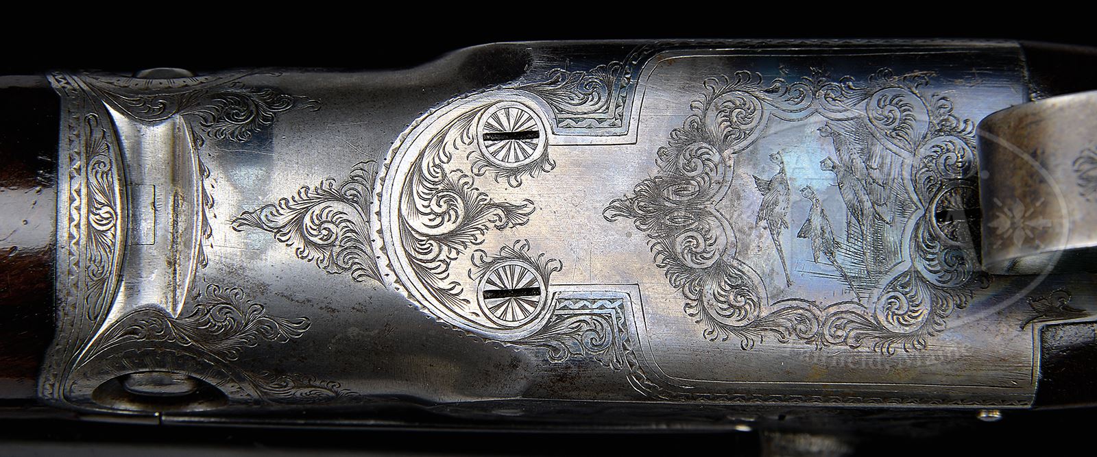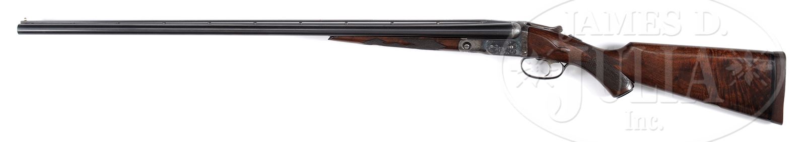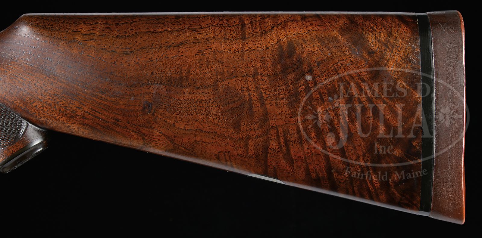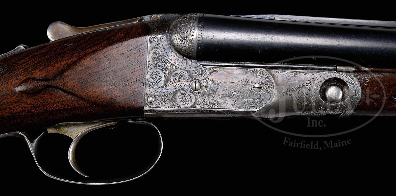 *HIGH ORIGINAL METAL CONDITION PARKER DHE WITH 30″ VENTILATED RIB BARRELS AND SINGLE TRIGGER.SN 216863. Cal. 20 ga. 2-3/4″ Chambers. 0 Frame. 30″ Bbls have raised, ventilated rib engraved with Parker’s Meriden CT address and “TITANIC STEEL”. Bbl flats are stamped with steel type, Parker overload proofs, and weight. Left side of lump is stamped with SN. Typical Parker action has all correct numbers and marks on water table. Action features automatic safety and Parker sgl selective trigger. Action is engraved with 60 – 70% coverage scroll within geometric borders, surrounding vignettes of single dogs and game; A pointer on left, and a pointing setter on right side. “PARKER BROS” is engraved on scrolled band on rear of both sides. Four pheasant are on trigger plate. Trigger guard bow is scroll engraved. SN is at grip. Nicely flame figured American walnut Parker capped pistol grip buttstock measures 14″ over NOSHOC pad. Stock is embellished in typical “D” grade style with lozenge shaped drop points and point pattern checkering with mullered borders. A vacant silver oval is on toe line. Matching splinter ejector forend has typical steel tip and Parker release. Ejector patent date is on iron. Bore diameter: left -.617, right -.617. Bore restrictions: left -.024 (Imod), right -.015 (mod). Wall thickness: left -.034, right -.032. Drop at heel: 2″, drop at comb: 1-3/8″. Weight: 7 lbs 0 oz. LOP: 14″. This gun matches PARKER GUN IDENTIFICATION AND SERIALIZATION LEDGER except it is shown as having extra bbls, not listed as having vent rib. Special Note: This item contains or is made of ivory. Do not bid on this lot unless you have read and agreed to our "Ivory Position Statement" and the "Waiver of Legal and Financial Risk to James D. Julia in regards to your Purchase of an Ivory Object." This information is located in the front section of our catalog. CONDITION: Excellent. Bbls retain approx 95% orig blue. Action retains approx 80% orig case hardening colors, silvered on bottom, and fences, from normal hand wear. Trigger guard retains approx 20% orig blue, most loss due to flaking. Buttstock retains over 90% of an old oil refinish, mullering of checkered borders somewhat filled, sharp edges a bit rounded. Forend retains over 90% of its orig finish. Action has just a hint of looseness. Bores are excellent. Ejectors are strong and in time. Trigger works. THE PARKER STORY estimates 330 20 bores were made with 30″ Titanic Steel bbls. A very fine long barreled small bore Parker. Bead sights are “certifiable pre-ban ivory”. 49450-25 MGM390 IVORY (12,500-22,500) – Lot 2369