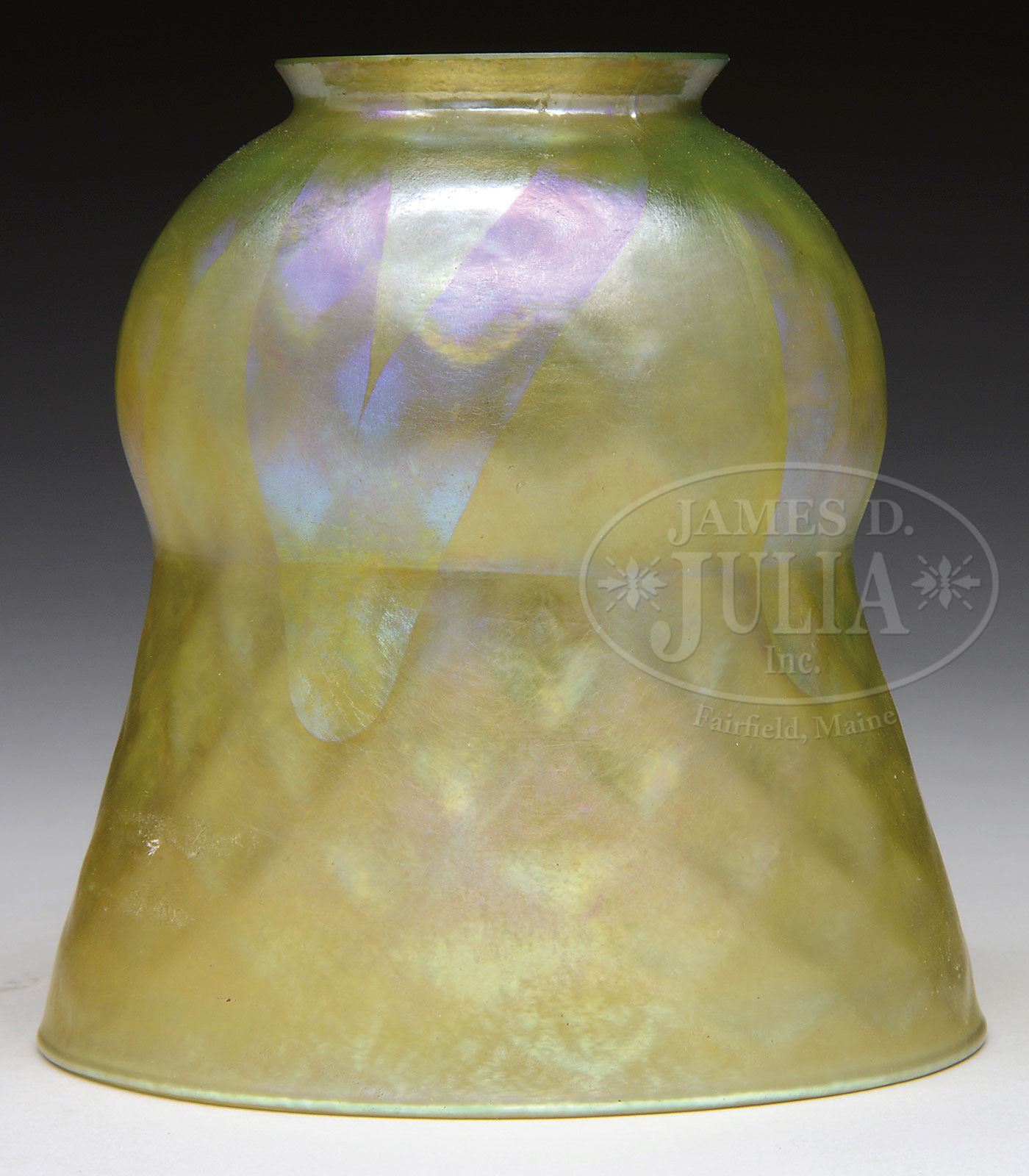 TIFFANY FAVRILE ART GLASS SHADE.Tiffany gold favrile art glass shade has diamond quilted body with a gold iridescent pulled design descending from the fitter. The pulled design shows nice purple and pink highlights set against the rich gold iridescent background. Signed in the fitter “L.C.T.”. SIZE: 4-5/8″ t. CONDITION: Very good to excellent with four tiny, tiny flea bites to the fitter rim. 5-69401 (800-1,000) – Lot 2370