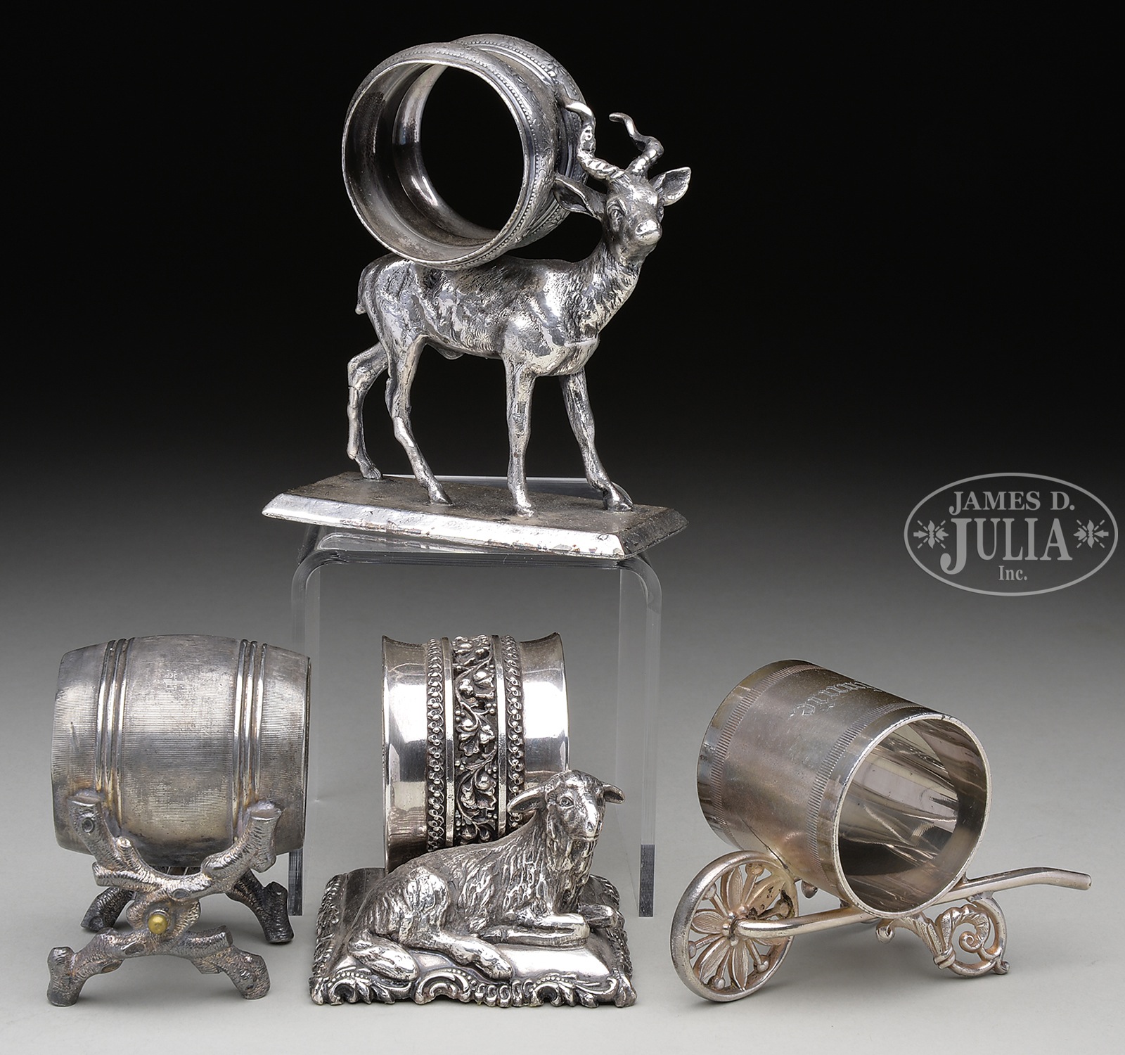 LOT OF 4 FIGURAL NAPKIN RINGS.1) A handsome deer, carrying a napkin holder on his back, stands on a flat, rectangular base. Marked “Rogers & Bro. #204”. Plate 107. CONDITION: Silver is good. 2) A sheep reclines on a scroll-edged base. The napkin holder has an applied, decorative center band. Marked “Meriden Silver Plate Co. #0279”. Plate 96. CONDITION: Silver is excellent. 3) A napkin holder is mounted on a fanciful wheelbarrow, which has a pretty flower design in the wheel. Marked with a “P” for Pairpoint Manufacturing Co. “#40”. Engraved “Minnie”. Plate 620. CONDITION: Silver is very good. 4) A barrel-shaped napkin holder rests on crossed branches, with a bar through the center of them. No manufacturer’s mark or number. CONDITION: Silver is fair. CONDITION: As noted. 49090-3 (500-700) – Lot 2371 Auction: Advertising, Toy & Doll - Spring 2015 Please Note: All prices include the hammer price plus the buyer’s premium, which is paid by the buyer as part of the purchase price. The prices noted here after the auction are considered unofficial and do not become official until after the 46th day. |