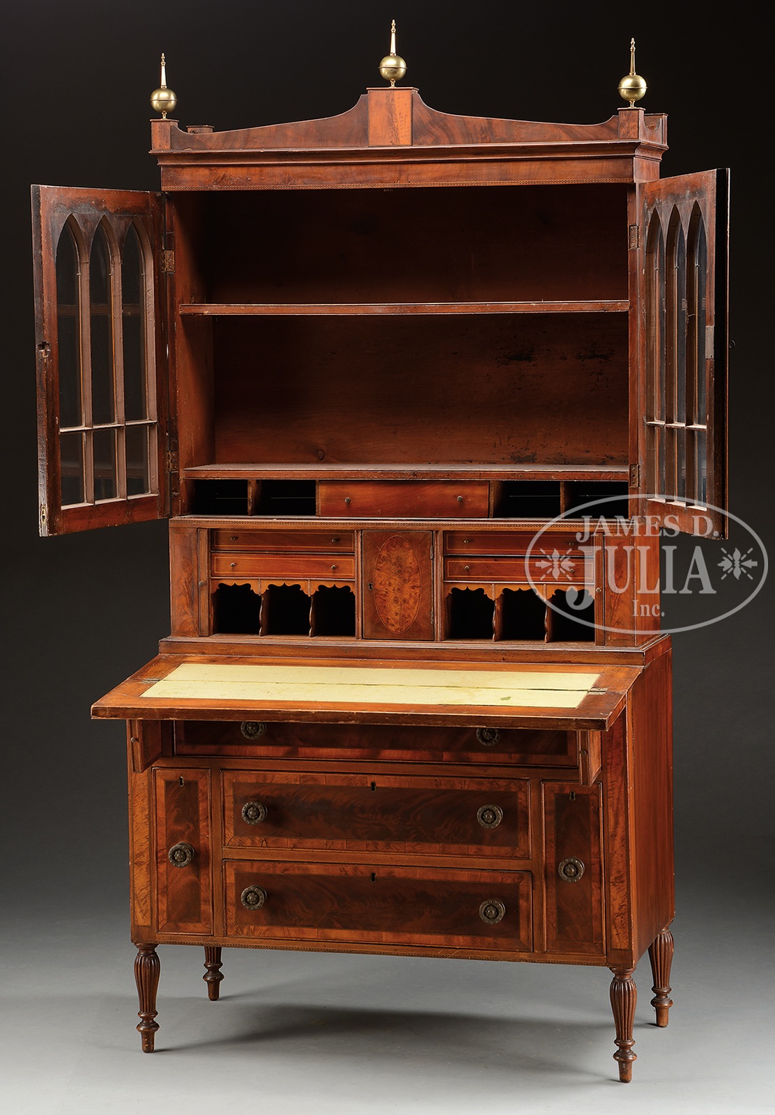 Probably Massachusetts circa late 19th early 20th century. Composed largely of older period parts. The galleried top with inlaid panels and brass finials above a pair of glazed Gothic arched doors. Below,the tambour conceals a fitted interior consisting of drawers and valanced letter slots. The lower section has fold down writing board and 3 graduated drawers flanked by bottle drawers and lopers. The turned reeded legs terminate in spike feet with the upper portions squared and inlaid with contrasting panels of burl wood. SIZE: 84″ h x 42″ w x 19″ d. CONDITION: Good with old restoration with mostly original surface. Brass finials of a later date. 49191-43 (1,500-2,500) – Lot 2371