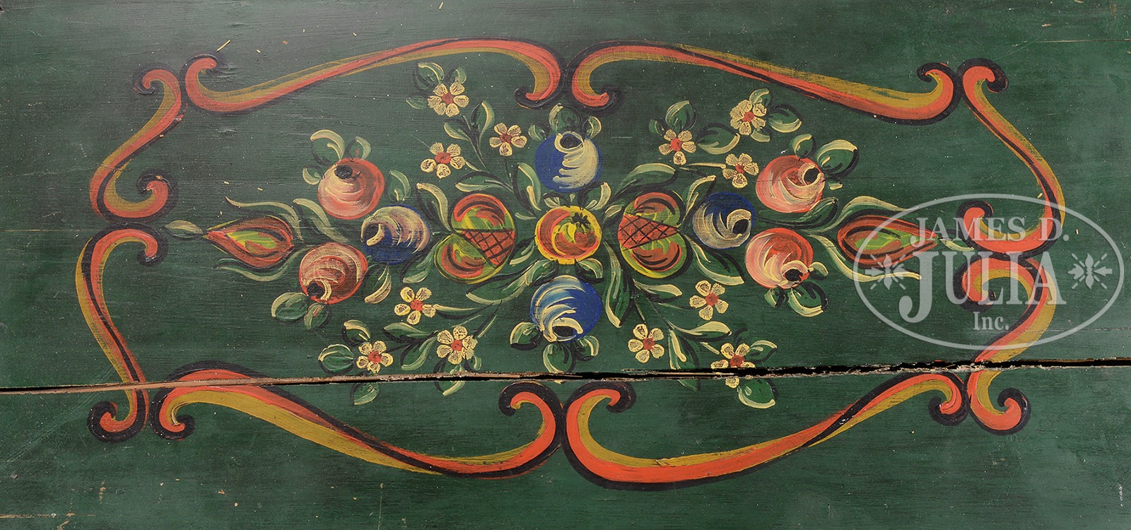 FLORAL DECORATED PINE BLANKET CHEST.Early 19th century, possibly Pennsylvania. The rectangular hinged lid painted with a polychrome floral spray within a scrolled cartouche opening to the interior fitted with open till, the lid mounted on long wrought-iron hinges and with applied molded edge. The dovetailed case with pair of stylized polychrome painted flower filled vases centering a fruit cluster, on a half round molded base raised on simple square cut legs. The blanket chest in green paint with red trim and fitted with wrought-iron carrying handles. SIZE: 22″ t x 45″ w x 42″ d. CONDITION: Three board lid with shrinkage crack separation running full length of chest, palette remains vibrant. Normal and expected abrasion to painted surface primarily on edges. Carrying handles original, lock intact and functional with working key. Good overall. 51322-2 (800-1,000) – Lot 2371