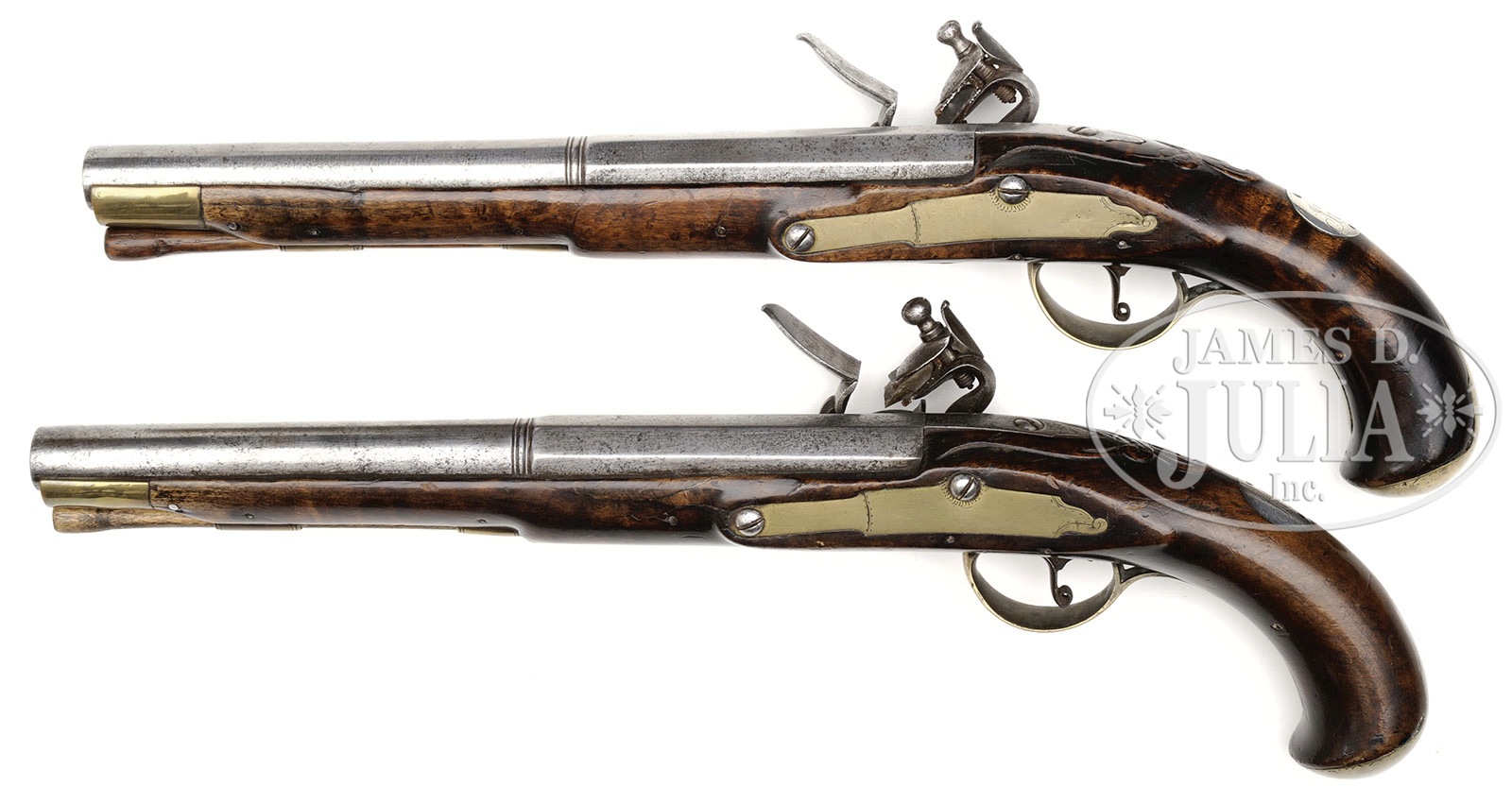 PAIR OF REVOLUTIONARY WAR PERIOD RELIEF CARVED FLINTLOCK PISTOLS ATTRIBUTED TO WILLIAM SHENNER OF READING, PA, POSSIBLY OWNED BY REVOLUTIONARY WAR ERA CAPTAIN REYNOLDS.SN NSN. 10″ oct to rnd .56 Cal smooth unmarked bbls. Overall 15-1/2″. Flintlocks are marked “T/KETTLAND/&Co.”. Curly maple stocks are carved with Shenner’s style relief carving behind bbl tangs. Each pistol has a silver circular thumb piece inlay marked “J.E.R.”. A great deal of research has been performed which suggests these initials represent John E. Reynolds who was a captain in the Second Battalion of Philadelphia County Militia commanded by Col. Moore during the Revolution. These pistols have brass sideplates ending in an unusual design identical to the only existing Shenner signed pistols, part of a pair from the Revolutionary period. William Shenner paid taxes as a gunsmith in Reading borough from 1773-1805. These pistols being offered are pictured on ppgs 14 and 15 in The Samuel E. Dyke Collection of Kentucky Pistols. This is an exquisite pair of Revolutionary War pistols that are unusually long making them a very handsome pair of holster pistols. Pictured on plate number 158 of the Sam Dyke Collection in the fourth edition of The Kentucky Rifle by Dillin. Pictured on p. 243 of Kentucky Rifles & Pistols 1750-1850 published by The Kentucky Rifle Association as well as in S.E. Dyke’s Thoughts on the American Flintlock Pistol plate no.158. PROVENANCE: Ex Herman P. Dean, George N. Hyatt, Sam E. Dyke and Tom Seymour Collections. Frank Sujansky Collection. CONDITION: Good. One pistol has a old in-period crack repair forward of sideplate. Second pistol has a little wood missing forward of lock. Both pistols have an encircled pin hole to right of front tang of trigger guard indicating they were each in the Famous Herman Dean Collection. Dean used brass numbered tacks to identify his guns. 4-49453 RG2 (25,000-55,000) – Lot 2372