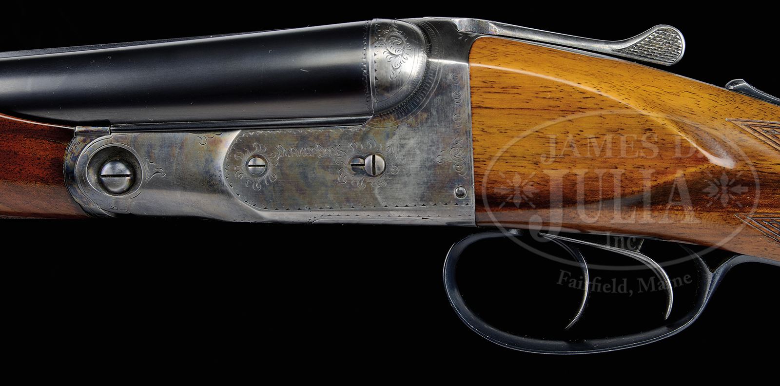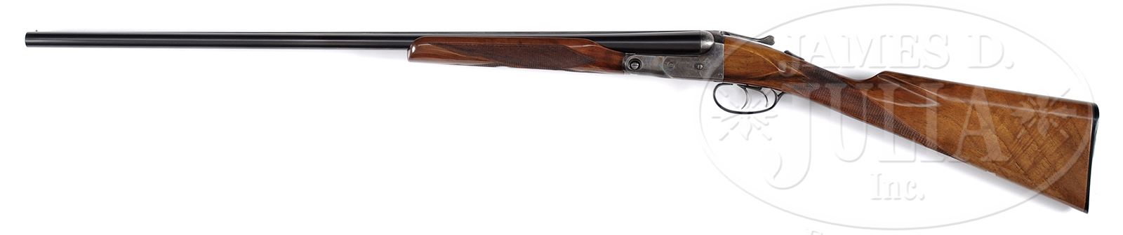 SN 219182. Cal. 20 ga. 2-1/2″ Chambers. 0 Frame. 28″ Bbls have concave, matted rib marked with Parker’s Meriden CT address and “PARKER STEEL”. Bbl flats are stamped with steel type, Parker proofs, and weight. Left side of lump is stamped with SN. Typical Parker action has all correct numbers and marks on water table. Action features automatic safety and dbl triggers. Action is engraved in typical “P” style with sprays of scroll engraving and simple geometric borders. “Parker Bros” is on each side. Trigger guard bow has geometric border engraving. SN is at grip. Lightly figured American walnut straight grip buttstock measures 14-3/8″ over Parker dogs head buttplate without spur. Stock has point pattern checkering with line borders at grip. Vacant silver shield is on toe line. Matching beavertail ejector forend has reinforcing bolt and typical Parker release. Ejector patent date is on iron. Bore diameter: left -.621, right -.625. Bore restrictions: left -.025 (full), right -.022 (Imod). Wall thickness: left -.022, right -.023. Drop at heel: 3″, drop at comb: 1-5/8″. Weight: 6 lbs 2 oz. LOP: 14-3/8″. This gun is listed in the PARKER GUN IDENTIFICATION AND SERIALIZATION LEDGER and all specifications match, except it is listed as a capped pistol grip buttstock. CONDITION: Excellent, as refinished, retaining all renewed finishes on wood and metal, with a few very light subsequent handling marks. Bores are excellent. Action is tight. Ejectors are in time. A scarce small gauge Parker with only 100 estimated P grade 20 bores with 28″ Parker steel bbls in THE PARKER STORY. 49417-15 MGM318 (5,000-8,000) – Lot 2373