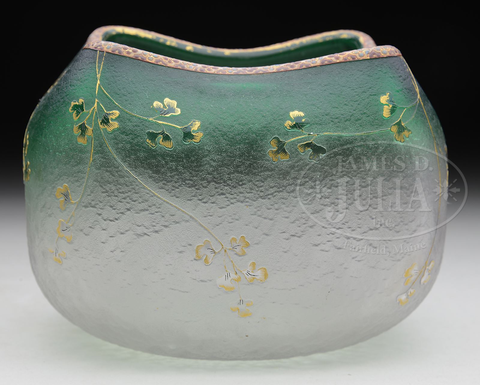DAUM NANCY GILDED AND ENAMELED SCENIC CAMEO VASE.Daum vase has clear shaded to green acid-textured background with cameo leaves, vines and trees with gilded detailing. Vase is further decorated with enameled scene depicting five fisherman at lake shore with trees and town in background, pinched upper rim is decorated with 1/4″ band of blue and purple enameled florets on cream background with gilded interior edge. Signed on the underside “Daum Nancy” with cross of Lorraine. SIZE: 4-1/4″ t. PROVENANCE: From an Unreserved Texas Collection. CONDITION: Minor wear to enamel and gilding, otherwise very good to excellent. 50006-17 (1,200-1,700) – Lot 2373