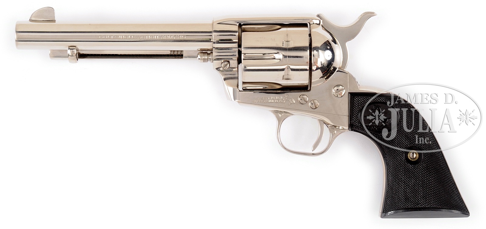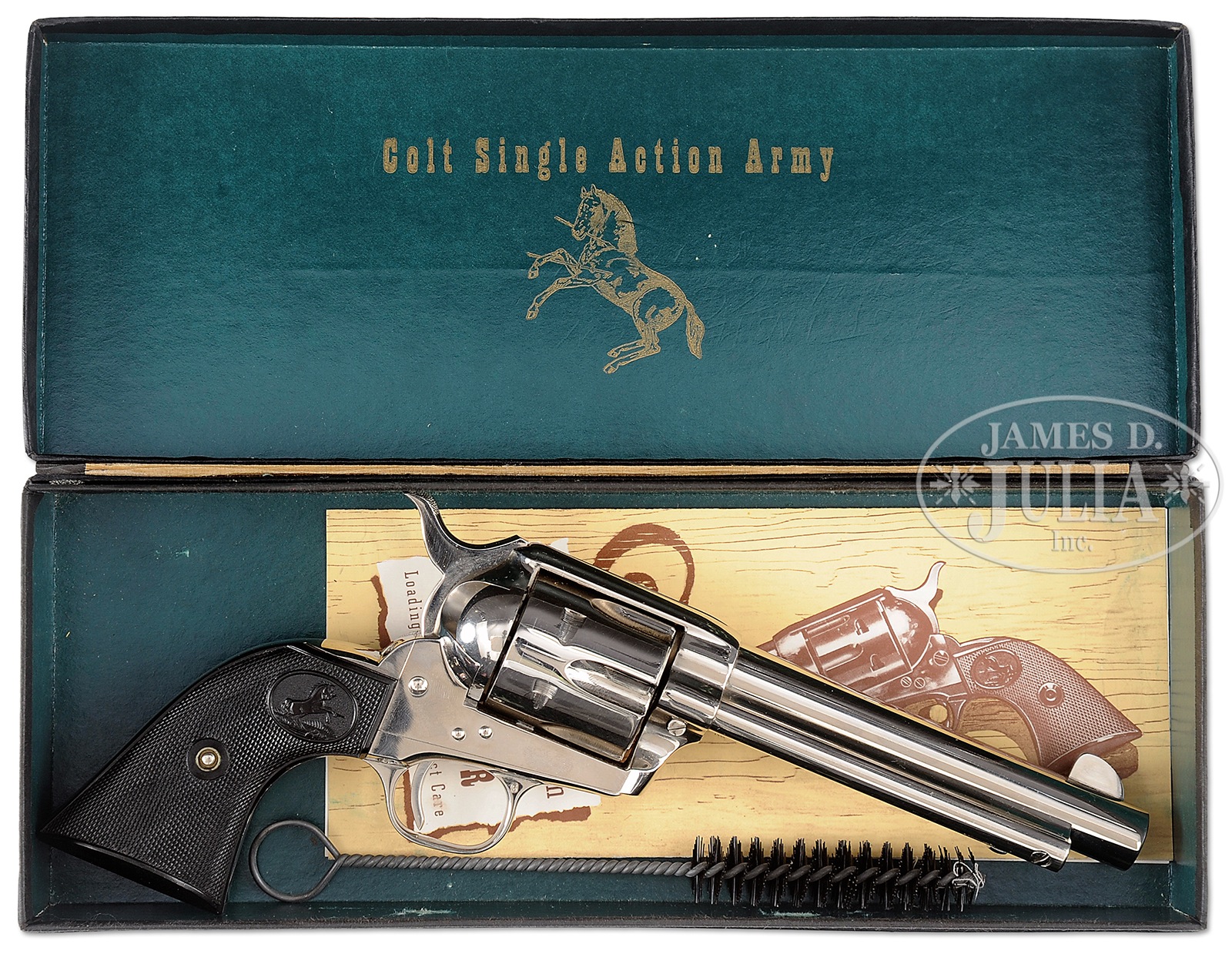 *COLT SECOND GENERATION SINGLE ACTION ARMY REVOLVER IN A COLT BOX NUMBERED TO THE GUN.SN 19171SA. Cal. 45LC. 5-1/2″ bbl. Full nickel finish. Colt hard rubber grips with medallions. Bbl shows a 1-line address on top, with model and cal mark on left side. Right side of frame shows 2-line patent mark with rampant Colt logo, to the rear without a circle. SNs match on frame, trigger guard, backstrap, cyl, and grips. Inside of left grip has “AG Oct-57” scratched inside. Box is correct for this model with cal and bbl length noted on end label and SN written in red wax pencil on bottom. Box contains cleaning brush and 2 instruction sheets. CONDITION: Very fine to excellent. Revolver retains nearly all of orig nickel finish overall, with slight muzzle wear and some scratching on side of hammer. Bore is frosty with strong rifling. Cyl is somewhat stained on front face. All markings are sharp and clear. Grips are fine with sharp checkering. Box is very good, with a crack on top and minor edge wear. A really nice 2nd generation Colt Six Shooter in a desirable full nickle finish. 50994-21 TEP (1,500-2,500) C&R – Lot 2373