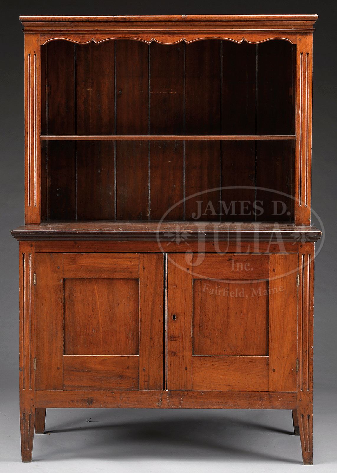 EARLY 19TH CENTURY FRENCH FRUITWOOD OPEN TOP HUTCH. Fine, small fruitwood hutch, pegged construction with two open shelves above and two paneled doors below with fluted corner post and tapering fluted feet. SIZE: 46″ w x 20″ d x 68-1/2″ h. CONDITION: Very good with fine old finish. Replaced interior shelf. 9-25003 (650-950)