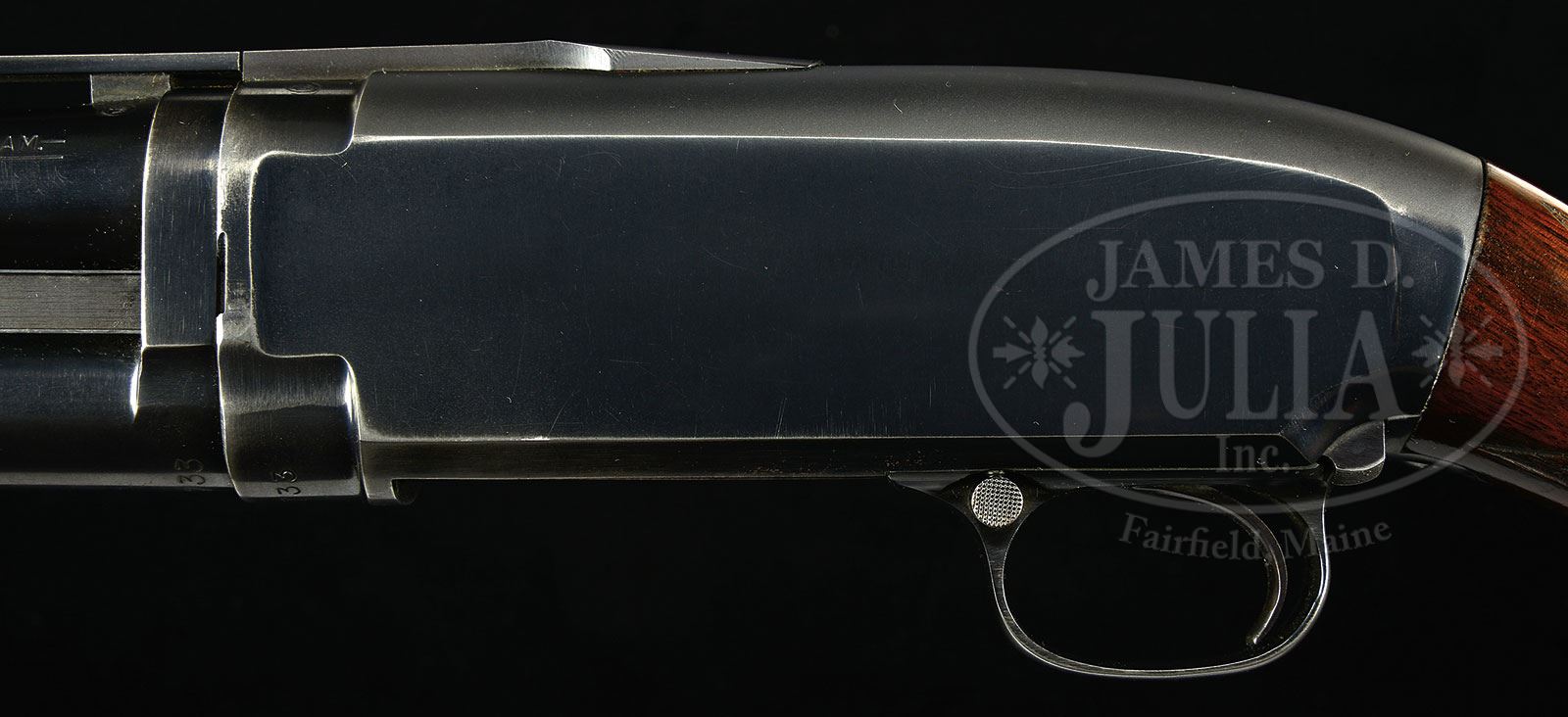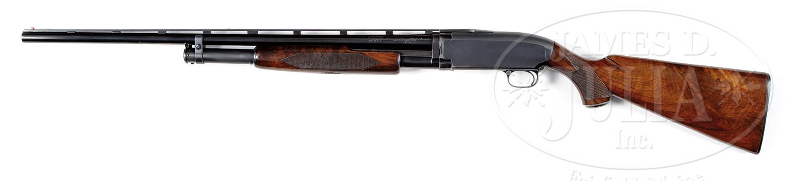 *WINCHESTER MODEL 12 SKEET GRADE PUMP SHOTGUN.SN 1936733. Cal. 20 ga 2-3/4″ chamber. Bbl length is 26″ with Winchester new style 3-pin ventilated rib with “WS-1″ choke marking. Red target style front bead with steel mid-bead. Receiver has smooth matt finish top with duckbill extension. Checkered beavertail forearm & pistol grip stock of fancy walnut with steel grip cap. Standard 14” length of pull to Winchester buttplate. PROVENANCE: Ed Johnston Estate Collection. CONDITION: Receiver has nicks at takedown point with some fading of orig blue on sharp edges. Bbl & magazine tube exhibit light blue wear from normal pump operation. Orig wood finish shows light wear on forearm with scattered scratches & marks. Tight action with headspace ring at its orig point of adjustment. Very good bright bore. 4-51385 DS5 (3,000-5,000) – Lot 2374