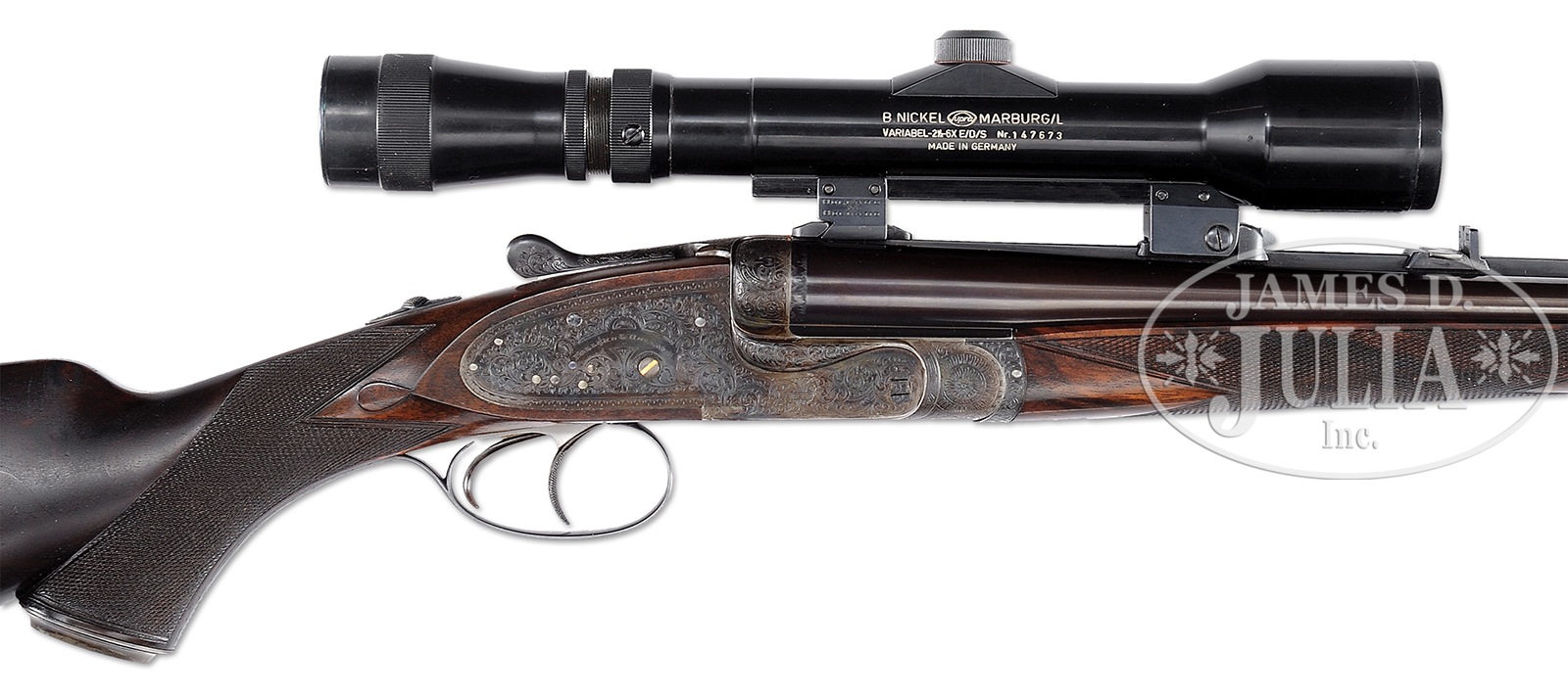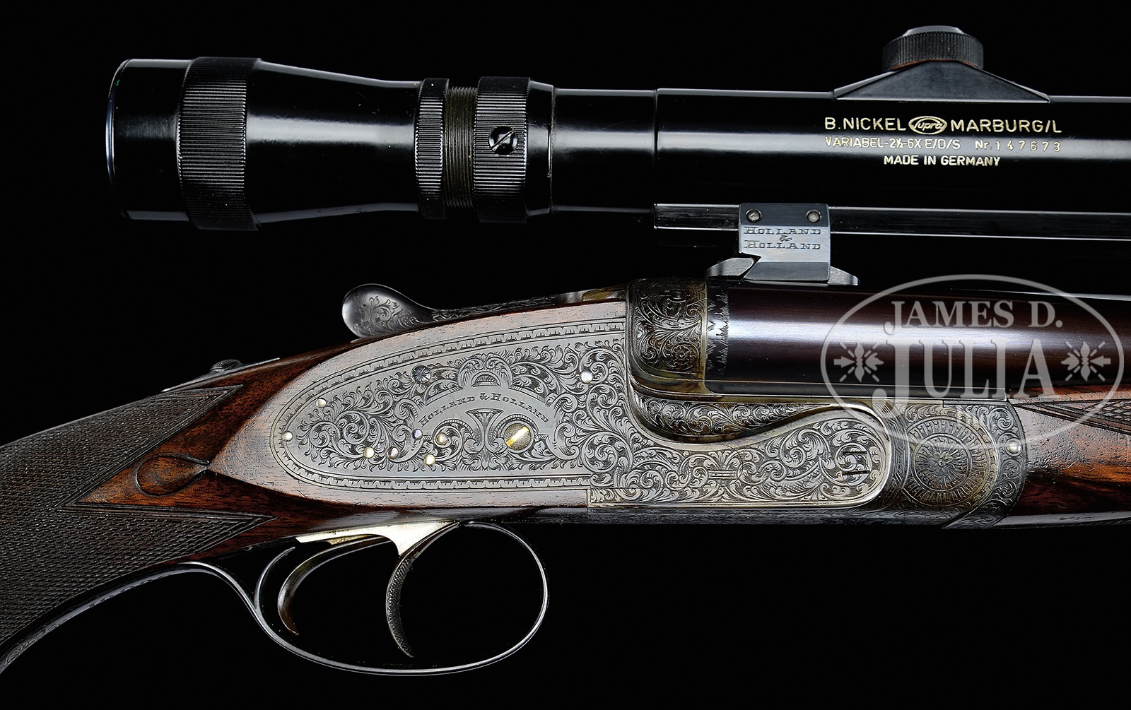 *SUPERB HOLLAND & HOLLAND ROYAL EJECTOR DOUBLE RIFLE IN .240 MAGNUM FLANGED MADE FOR PRINCESS HELEN SHAH OF NEPAL WITH ORIGINAL SCOPE, CASE AND ACCESSORIES.SN 35301. (1958) Cal. .240 Magnum Flanged. 25″ Chopper lump bbls are fitted with file cut quarter rib holding one standing, one folding leaf express rear sight; standing leaf marked for 50 and 200 yards, folding leaf for 350 yards. Holland & Holland scope bases are also installed. Deeply swamped mid rib is engraved “.240 “MAGNUM”” and “Flanged Cartridge”. Muzzles are finished in modern H&H style, and protrude about 3/16″ past regulating blocks. Top portion of which have been hollowed out to receive folding spring loaded “moon” bead which folds over silver bead front sight in ramp. Tops of bbls are engraved “Holland & Holland” and “98, New Bond Street, London.” Bbl flats are stamped with London nitro proofs for .240. SNs are stamped on bottoms of bbls. Bottom rib is engraved “Made in England” where covered by forend, and “Royal” in front of soldered on sling loop. Bbls are considerably tapered for a thin racy look, and good balance. Case hardened Royal sidelock action features reinforcing bolsters, hidden third fastener, bushed strikers, automatic safety (SAFE inlaid in gold), gold band tumbler end cocking indicators, detachable side locks, dbl triggers (front checkered), and top strap which extends over comb in typical Holland style. Action is engraved in classic Holland Royal house style with near full coverage of very well cut various sized open shaded scroll. “Holland & Holland” is in classic arched device on each lockplate. Bottom of action is engraved “Royal” and “Model”. Scroll engraved single beaded trigger guard has SN on tang which extends to case hardened steel grip cap with trap, holding spare front sight. Very dark, figured European walnut pistol grip buttstock measures 14-1/4″ over dark brown leather covered pad, and features typical Holland style shadow line cheekpiece, drop points, and grip checkering which lays below rounded transition of butt to grip. A sling loop matching that on bbl, as well as a gold oval engraved “HS” (Helen Shah), are on toe line. Matching splinter ejector forend has Anson release. Rifle is fitted with its orig Nickel Supra 2-1/2 – 6 X rail scope, with fine crosshair and post reticle, in Holland and Holland marked and SNed mounts. Scope retains its orig lens covers and carrying case. Drop at heel: approx 3-1/8″, drop at comb: approx 1-7/8″. Weight without scope: 8 lbs. 4 oz. LOP: 14-1/4″. Orig makers leather case with brass corners is embossed in gold outlined black ink “HS” on top. Interior is lined in burgundy cloth and has medium gold embossed black leather H&H label in lid, along with charge card for this particular rifle. Case has space for action, bbls, and scope in its case. Case contains horn handled small turnscrew, H&H marked striker key with horn handle, 2-pc vinyl covered steel cleaning rod with brushes, mop and jag in black morocco leather wallet, plated ear trumpet type cleaning funnel, H&H marked round oil bottle, composition striker bottle with spare strikers and replacement lock screw (if desired instead of hand detachable locks), carrying strap for scope case, pair of snap caps, 9 boxes of Kynoch ammunition, along with high quality leather rifle sling. PROVENANCE: Notification from H&H regarding shipping of this rifle, and copies of ledger pages confirming orig specifications. CONDITION: Excellent, mostly original overall. Bbls retain nearly all what appears to be orig factory blue with a few light marks and scratches, with some cleaned light pitting on exterior on mid rib on right bbl 5″ back from muzzle. Action and lockplates retain over 95% case hardening color, silvered on beads and top tang. Stocks retain most of what appears to be their orig hand rubbed oil finish, butt portion very dark, possibly with very light refinish at time of installation of newer pad (orig dimensions retained). Checkering is very lightly worn. Bores are excellent, bright, sharp, and shiny throughout. Action is tight. Bbls have just a hint of looseness, and are a touch off face. Ejectors are in time. Scope is excellent with a few light marks in its exterior lacquer. Optics are clear. Case leather is excellent with a few light marks. Straps and handle are very fine. Interior cloth is very fine with some light mildew and minor rubs. Label is fine, charge card lightly foxed and with some soiling. Accessories are fine. 49958-24 MGM76 (30,000-50,000) – Lot 2376 Click here to view provenance