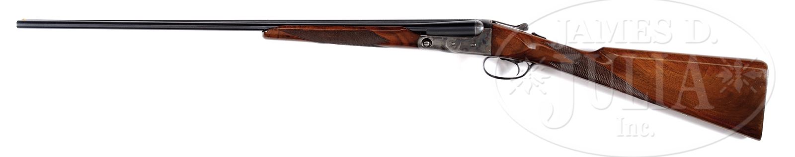 *FINE HIGH ORIGINAL CONDITION .410 PARKER VHE SINGLE TRIGGER SKEET GUN WITH BEAVERTAIL FOREND.SN 241557. Cal. .410 ga. 3″ Chambers. 000 Frame. 26″ Bbls have unmarked concave, matted rib. Bbl flats are stamped with SN, Parker overload proofs, weight, and “Skeet In” “Skeet Out”. Left side of lump is marked “V GRADE 410 GA” “FOR 3″ SHELLS”. Typical Parker action is marked with “MADE IN USA” “ILION, N.Y.”, SN, and “VH” on water table with lightening cuts. Action features non-automatic safety and Parker single selective trigger. Action is engraved in typical “V” style with wiggle borders. “PARKER” is on bottom of action. Trigger guard bow has wiggle borders. SN is at grip. Lightly crotch figured American walnut straight grip buttstock measures 14″ over checkered wood butt. Stock has point pattern checkering with beaded borders at grip. Silver shield on toe line is engraved “J D G”. Matching beavertail ejector forend has typical Parker release. Bore diameter at muzzles: left -.407, right -.407. Wall thickness: left -.040, right -.040. Drop at heel: 2-5/16″, drop at comb: 1-1/2″. Weight: 6 lbs 0 oz. LOP: 14″. This gun is not listed in PARKER GUN IDENTIFICATION AND SERIALIZATION LEDGER. CONDITION: Exceptionally fine, original, as found. Bbls retain over 95% orig blue, with some very light marks, silvered a touch at muzzles. Action retains approx 80% orig case hardening color, vivid on sides, silvering a bit and thinning on bottom, from normal hand wear. Stocks retain 90 – 95% of their orig finish, lightly crazed overall, with several minor marks and pings, a few somewhat deeper, mostly on right side of comb. Checkering is lightly worn. Bores are excellent. Action is tight. Ejectors are strong and in time. Trigger works. A truly exceptional investment quality late Parker small bore skeet gun. 49517-2 MGM446 (30,000-50,000) – Lot 2378