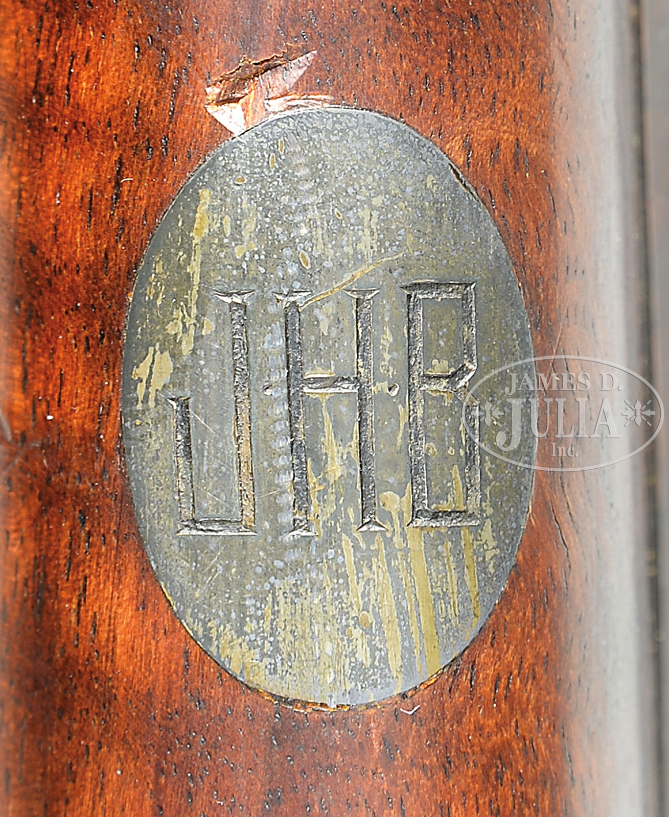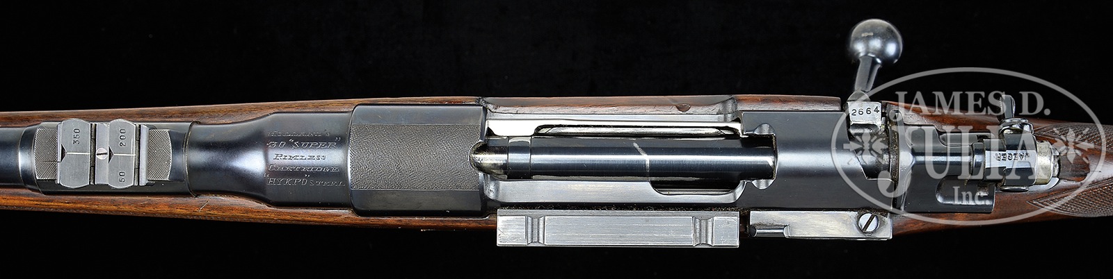 *”.30 SUPER” HOLLAND & HOLLAND MAGAZINE RIFLE WITH SCOPE AND CASE.SN 2664. (ca 1957) Cal. .300 H&H. 25″ Lightweight round bbl is fitted with island base for two folding leaf express rear sight, banded-on sling eye, and banded-on front ramp fitted with silver bead and Holland’s special flip-over sight protector. Top of bbl is engraved with H&H 98 New Bond Street address, and rear portion is engraved “Holland’s .30 “SUPER” Rimless Cartridge “HYKRO” Steel”. Standard length FN action with stippled receiver ring, has been stretched at front and back to accommodate magnum length cartridge. Action is fitted with G&H scope base. Alloy bottom metal with drop box and hinged floorplate with release button in trigger guard bow, is engraved “Made in England” at front of floorplate, and “4 Cartdgs” at center. SN is on trigger guard bow. Action is fitted with Canjar (?) trigger and Jaeger low scope safety. Beautifully fiddle figured European walnut steel trap capped stock measures 14-1/2″ over checkered steel buttplate and features classic H&H styling with point pattern checkering fore and aft, reinforcing bolt, and shadow line right hand cheekpiece. A silver oval on toe line is engraved “J H B”. Redfield 2-3/4 X scope with crosshair reticle is in G&H mount. Drop at heel: approx 2-3/4″, drop at comb: approx 1-11/16″. Weight with scope: 8 lbs. 3 oz. LOP: 14-1/2″. Makers orig green canvas full length case with tan leather trim, is stenciled “JOHN H. BATTEN” “RACINE, WIS.” “U.S.A.” on top, which is also littered with freight and shipping labels. Interior is lined in green cloth and has silver embossed black H&H 98 New Bond Street label in lid, along with charge card with this rifles SN and stating “rifle is regulated with 180 grain Western Silver tip cartridge”. Case contains brown leather front sight protector, and a carrying strap. CONDITION: Excellent. All metal parts retain over 90% of their orig finish with loss due to normal hand wear on sharp edges. Stock retains most of its orig hand rubbed oil finish with a number of light marks and nicks, checkering somewhat worn. Bore is excellent, shiny with sharp rifling throughout. Action is smooth. Trigger pull is very light and sometimes slips (needs adjustment and cleaning). Scope is very fine, optics clear. Case is very fine with numerous scuffs. Straps and handle are good. Interior is very fine with some compressions and marks. Label has a 1-1/2″ rub from side mount, which goes through. Charge card is slightly foxed. 50242-2 MGM276 (8,000-12,000) – Lot 2378