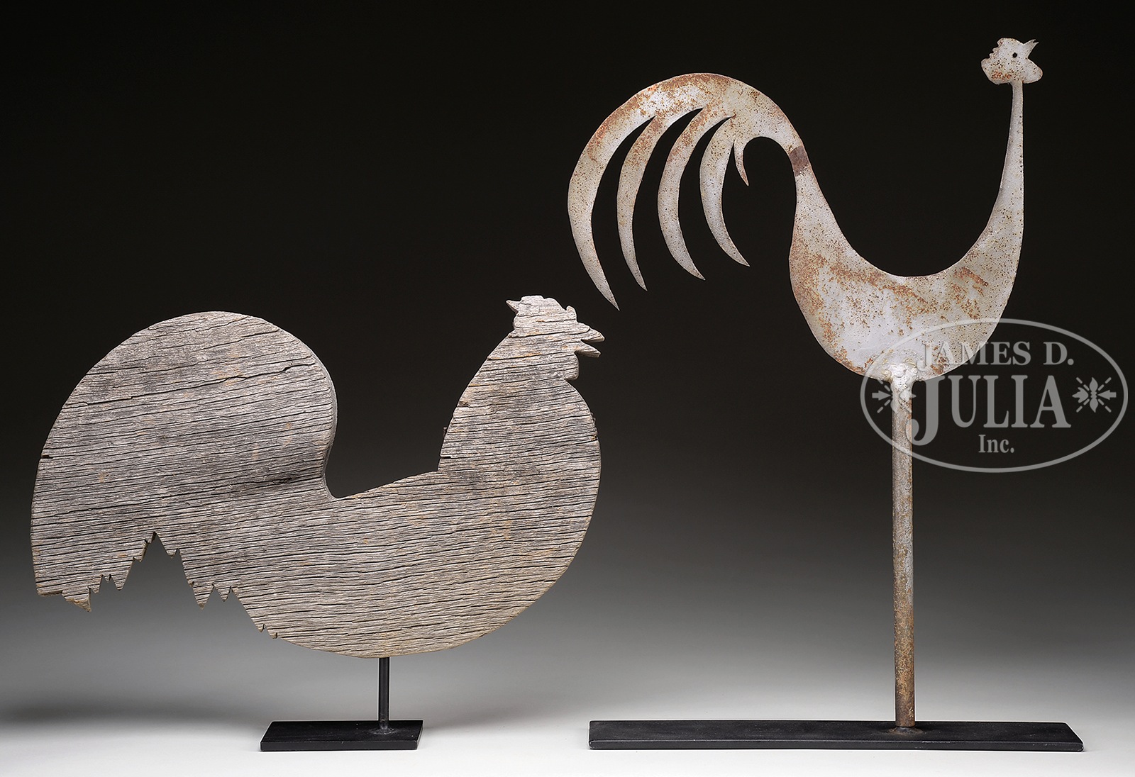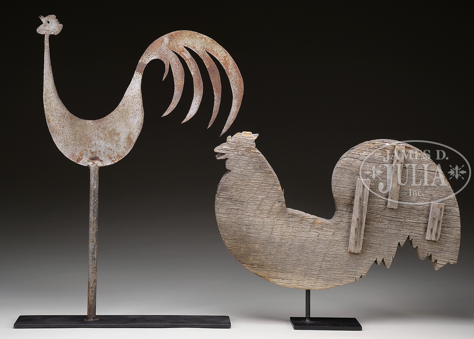 SHEET IRON ROOSTER WEATHERVANE TOGETHER WITH A WOODEN ROOSTER WEATHERVANE.1) American, 20th century. The sheet iron example of folky highly stylized form and old weathered silver paint surface. 2) 20th century. The wooden example less stylized and old weathered wood surface. Both with contemporary steel museum type table stands. SIZE: 1) 20″ t x 15 l. 2) 11″ t x 17-3/4″ l. PROVENANCE: From the private estate collection of John W. Armiger Jr. CONDITION: 1) Weathering with some paint loss and rust. 2) Old repairs with nails and wooden reinforcements to tail area. 49055-131 (600-750) – Lot 2379