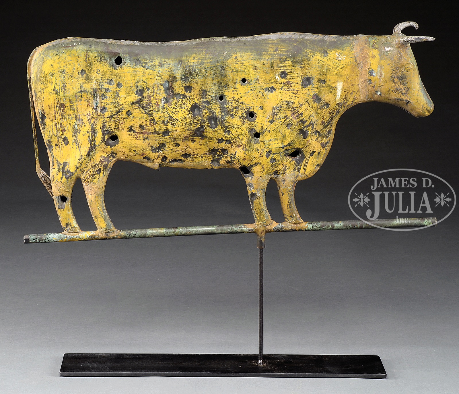 FULL BODY COPPER COW WEATHERVANE.Late 19th early 20th century. Standing cow with cast zinc horns and tail. Surface with yellow sizing and verdigris and with multiple bullet holes in “as found”, undisturbed condition. SIZE: 12-1/2″ h x 25″ l. CONDITION: Untouched as noted, with some seam separations along back and top of head. Yellow sizing overall with small areas of old gilding now with natural verdigris. 50584-2 (3,500-4,000) – Lot 2379