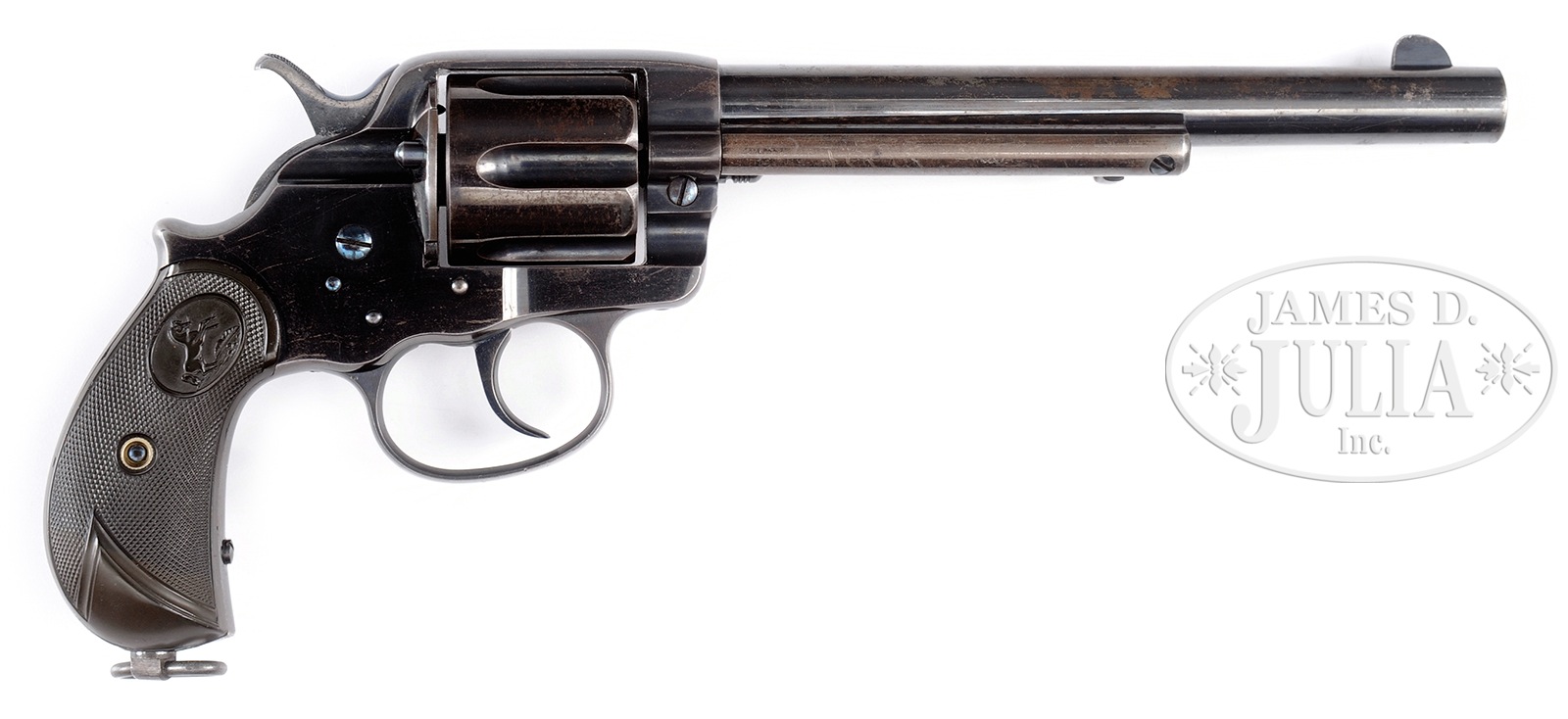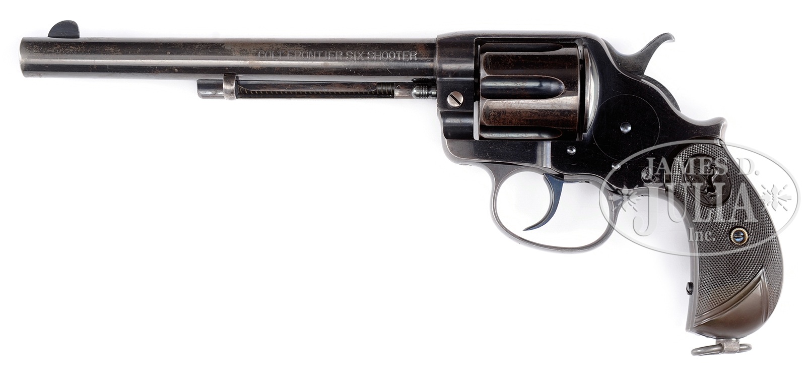 COLT MODEL 1878 DOUBLE ACTION REVOLVER WITH COLT FRONTIER SIX SHOOTER ROLL DIED BARREL.SN 32984. Cal. 44-40. 7-1/2″ bbl. Full blue finish. 2-pc hard rubber grips with Colt medallion. Bbl shows a 1-line address on top with “Colt Frontier Six Shooter” roll die mark on left side. Bbl is otherwise unmarked. Frame has a rampant Colt logo in a circle on left rear side, and is otherwise unmarked. Assembly no. “125” is stamped on loading gate and on lower left side of grip strap. SN is stamped on toe of butt in front of lanyard loop. Cyl has the last 3-digits of SN stamped on rear face between chambers, along with a “W” inspector mark. Left grip has last 3-digits of SN written in pencil. Right grip is not marked. Left grip also has “KS” scratched on inside. CONDITION: Very good to fine. Bbl retains 50-60% of orig blue finish that has flaked on top into a plumb-brown patina. Bbl address is sharp. Roll die mark on left side is sharp. Front sight is full-sized. Bore is frosty with strong rifling. Ejector rod housing shows 20-30% blue finish, with some light scratching and a few dents on outer edge. Frame retains 80% bright-blue finish drifting somewhat to a plumb-brown patina, especially on back and fore-strap of grip. Rampant Colt logo is sharp. Cyl retains 60-70% of blue finish drifting to a plumb-brown patina. Blueberry color is evident in flutes. Hammer shows a considerable amount of fire-blue on top and back, with polished sides. Trigger also shows a considerable amount of fire-blue. Grips are very good with sharp checkering, clear logo, and no brakes. A very nice example of a Colt Model 1878 Double Action Frontier Six Shooter made in 1893. 51007-1 (6,000-8,000) – Lot 2379