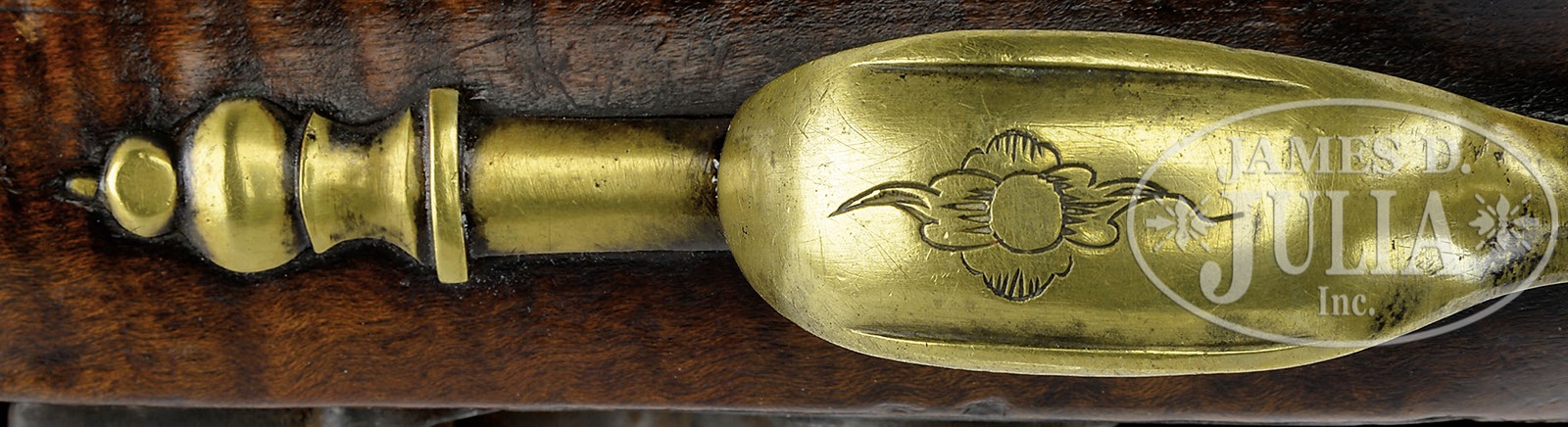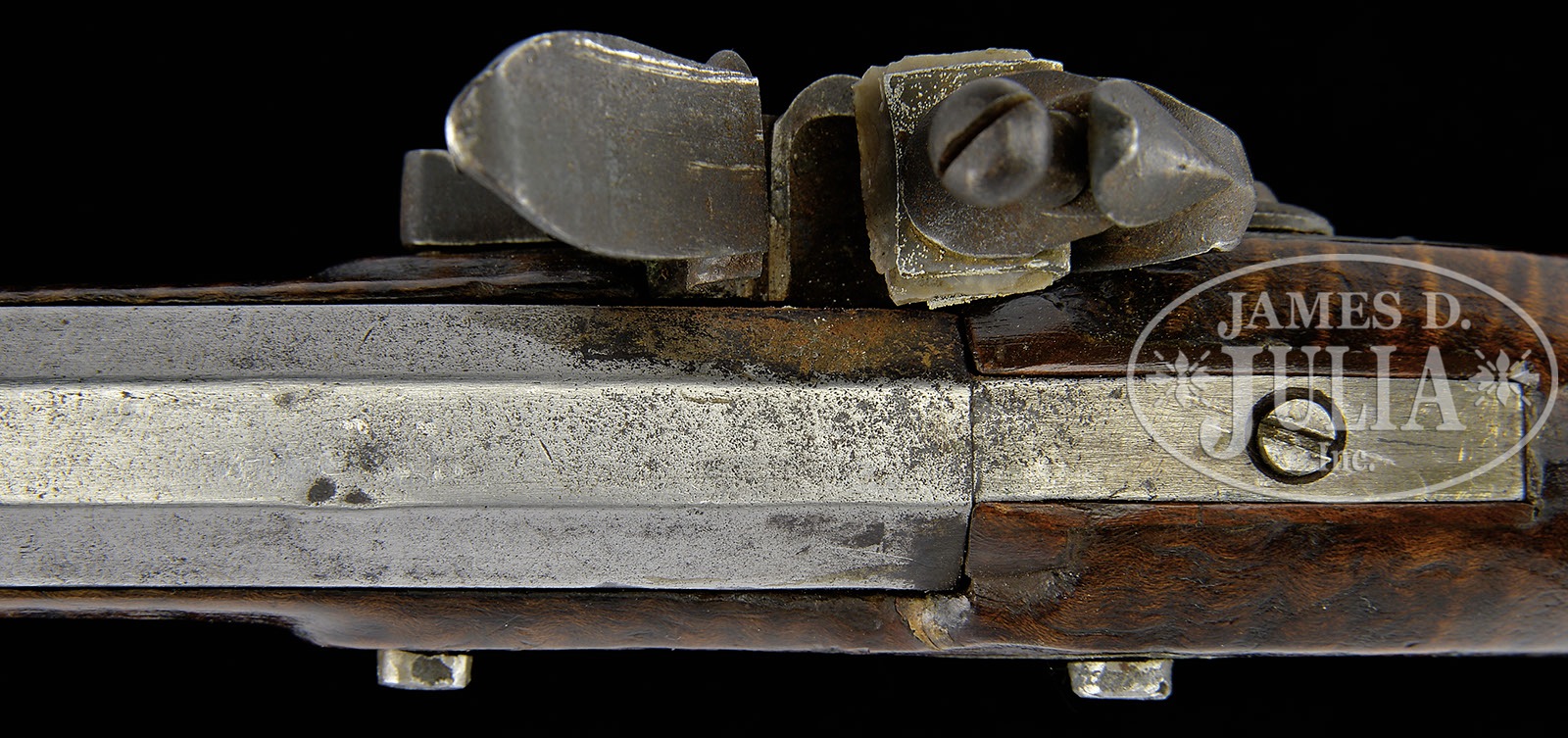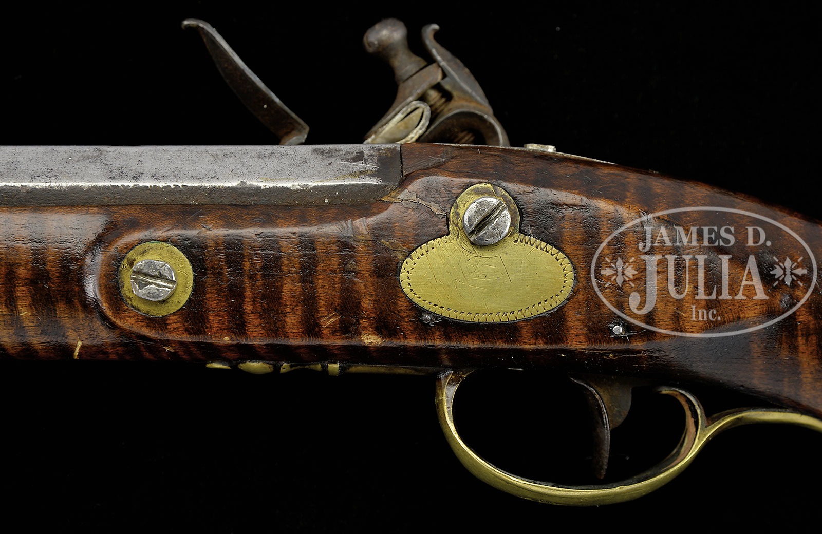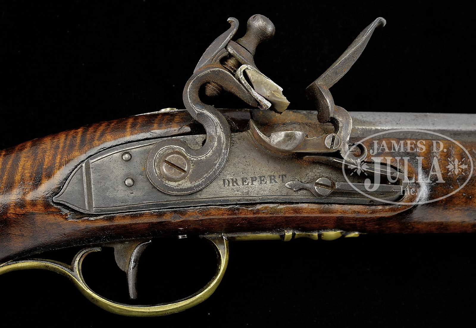 EARLY CURLY MAPLE FLINTLOCK KENTUCKY PISTOL WITH DREPERT LOCK.SN NSN. 9-1/8″ full oct .45 Cal smooth unmarked bbl. Overall 15″. Flintlock is marked “DREPERT”. Bbl is held to stock with one bbl wedge surrounded on each side by silver inlay. Brass furniture is of an early design with bow of trigger guard being engraved with a flower. Lock screws are held in place by brass washers. Drepert is a well known Lancaster gunmaker which could suggest this gun was made rather early in the Lancaster, PA area. A nice early attractive Kentucky pistol circa 1800-1812. PROVENANCE: Frank Sujansky Collection. CONDITION: Good. Nosecap appears to be a replacement. Bbl may have been shortened from muzzle. 4-49464 RG6 (8,000-12,000) – Lot 2380