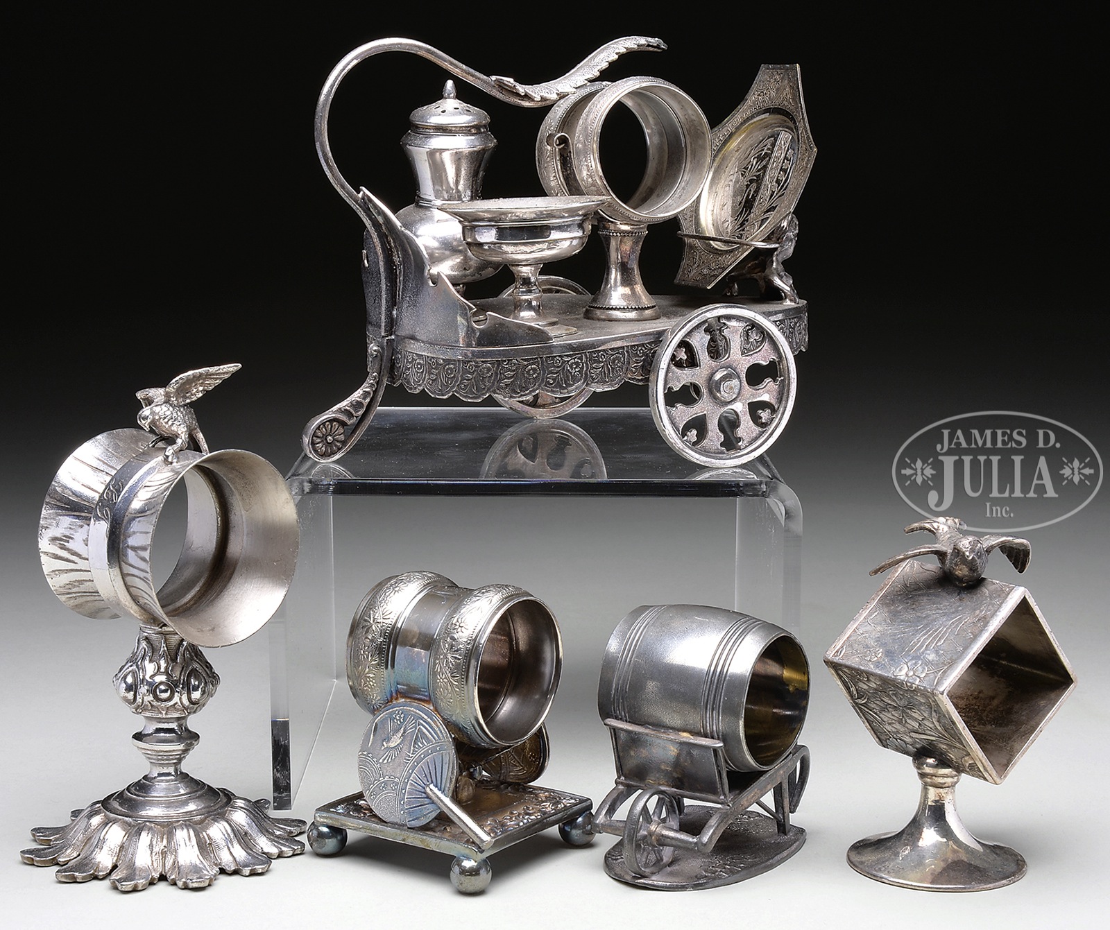 LOT OF 5 FIGURAL NAPKIN RINGS.1) Napkin ring combination set on wheels. The bust of a woman decorates one end of the set while it holds an open salt, pepper shaker, butter plate and a removable napkin holder. A handle ending in a leaf goes from the decorative piece that balances the set in the front over the napkin holder. Very pretty and unusual wheels on this set. Marked “Racine Silver Plate Co.”, no numbers. Plate 423. CONDITION: Silver is good. 2) A small bird sits on a square napkin holder angled on a pedestaled base. No makers mark; but the numbered “64”. Plate 202. CONDITION: Silver is good. 3) A small eagle perches on top of the napkin holder, which is elevated by a tall pedestal that rests on a domed base formed by draped petals. Marked “Meriden B. Company #167”. Plate 249. CONDITION: Silver is good. 4) Two Oriental fans support the napkin holder, under which is a butterfly – all mounted on a square, ball-footed base. Engraved “Nellie”. Marked “Meriden B. Company, #208”. Plate 487 right. CONDITION: Silver is good. 5) A barrel napkin holder rests on a wheelbarrow, which is on a shield-shaped base. Marked “James W. Tufts #1535”. CONDITION: Silver is fair. CONDITION: As noted. 49090-39 (500-700) – Lot 2380 Auction: Advertising, Toy & Doll - Spring 2015 Please Note: All prices include the hammer price plus the buyer’s premium, which is paid by the buyer as part of the purchase price. The prices noted here after the auction are considered unofficial and do not become official until after the 46th day. |