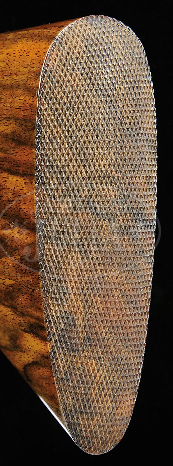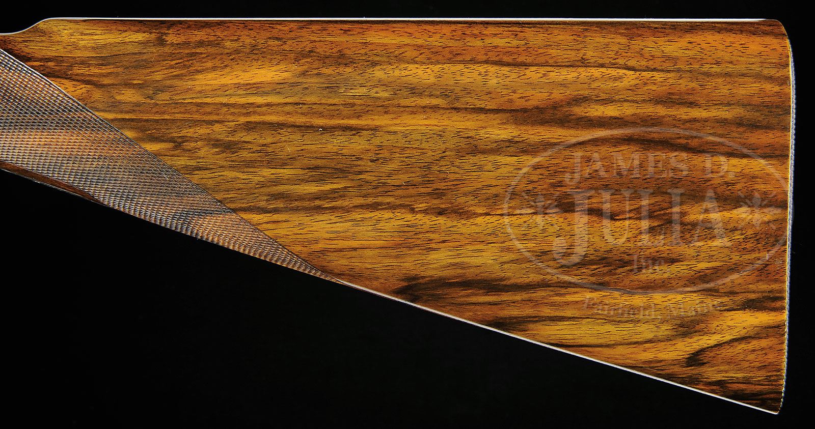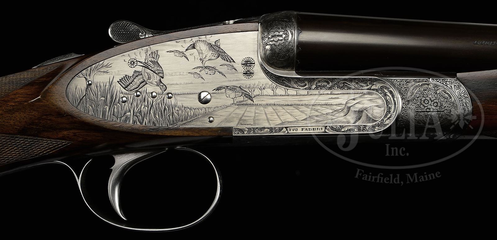 *VERY FINE TOMASONI ENGRAVED IVO FABBRI SELF-OPENING SIDELOCK GAME GUN WITH CASE.SN E497. (1978) Cal. 20 ga. 2-3/4″ Chambers. Finely struck 27″ chopper lump bbls with semi-raised, flat, matted rib are engraved “BOEHLER SUPER BLITZ STEEL” on side of right bbl, and “IVO FABBRI BRESCIA ITALY” on side of left bbl. Bbl flats are stamped with 1978 Italian nitro proofs for 2-3/4″ chambers. Bbls are fitted with Holland & Holland type self-opening assist spring. Coin finished sidelock action features non-automatic safety (SAFE engraved), line engraved tumbler end cocking indicators, and single non-selective trigger. Action is engraved with well done, shaded small scroll as background for larger scrolled acanthus and floral highlights, framing oval vignette of three snipe diving over marsh on bottom. “IVO FABBRI” is on bottom of each side under lockplates. Lockplates are fully engraved to the edge in a style originated by Harry Kell, with Bulino game scenes in finely detailed backgrounds; a flock of mallards wing across open marsh with low woods and buildings in background on left lockplate; and on the right, a flock of Hungarian partridge attempt escape over open cropland with two hapless individuals falling from sky, with feathers flying, obviously hit. This fine work is by noted engraver Claudio Tomasoni, whose signature appears at the bottom of each lockplate scene and on trigger plate. Single beaded trigger guard is engraved in style matching action, with SN at grip. Finely marbled European walnut straight grip buttstock measures 13-3/4″ over fully checkered wood butt. Well cut, borderless, point pattern checkering is at grip and on matching small beavertail ejector forend with Anson release. Bore diameter: left-.621, right -.621. Bore restrictions: left -.025 (IM), right -.025 (IM). Minimum wall thickness: left -.042, right -.042. Drop at heel: 1-5/8″, drop at comb: 1-7/16″. Weight: 6 lbs. 12 oz. LOP: 13-3/4″. High quality black leather case with stitched leather corners is lined in scarlet velvet. Case contains straps for exterior, and engravers certificate. CONDITION: Excellent, near new, possibly unfired since proof, with only a hint of case wear, and a few light marks on wood and metal. Bright polish on lumps, bbl flats, and ends of bbls, toning. Case leather is excellent, as is interior. 4-50398 (45,000-65,000) – Lot 2381