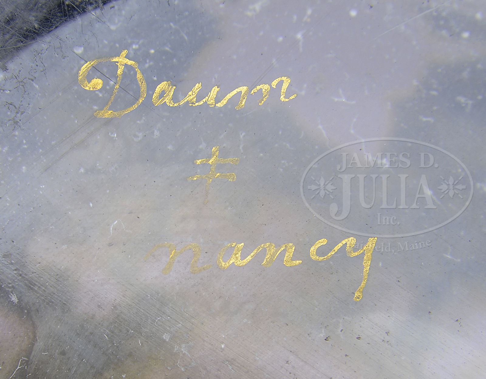 DAUM NANCY CAMEO FLORAL COVERED JAR.Daum jar has deeply acid-cut decoration of lavender flower branches, flowers and cameo quotation “mon doux Penser” while lid has deeply acid-cut lavender flower and butterfly, all on a clear background. Jar and lid are further decorated with gilded detailing on flowers, leaves and butterfly as well as traces of gilding at rim and in acid-textured background. Jar is signed on underside in gold “Daum Nancy” with cross of Lorraine. SIZE: 3-3/4″ t. PROVENANCE: From an Unreserved Texas Collection. CONDITION: Minor wear to gilding, otherwise very good to excellent. 50006-66 (800-1,200) – Lot 2381