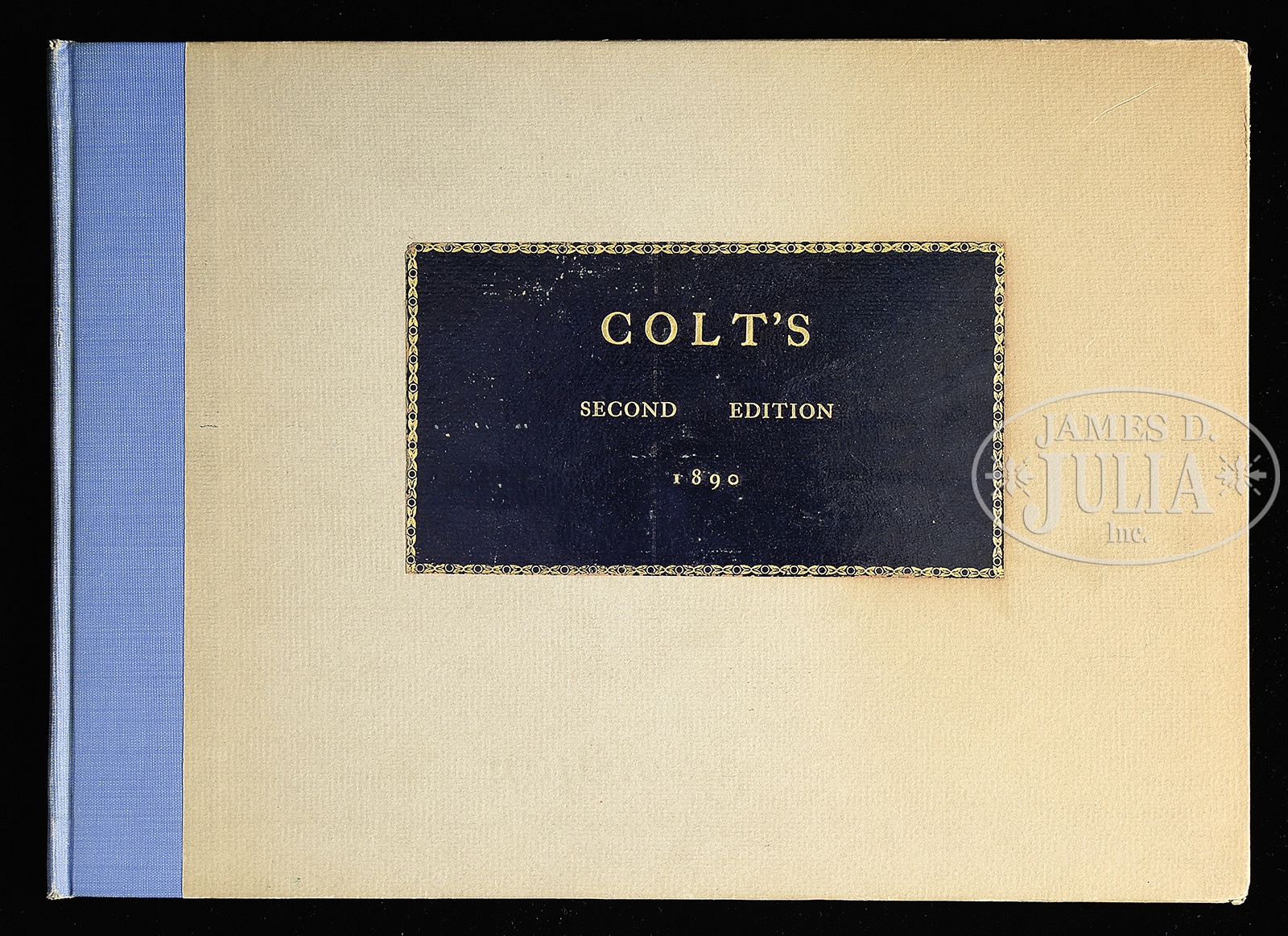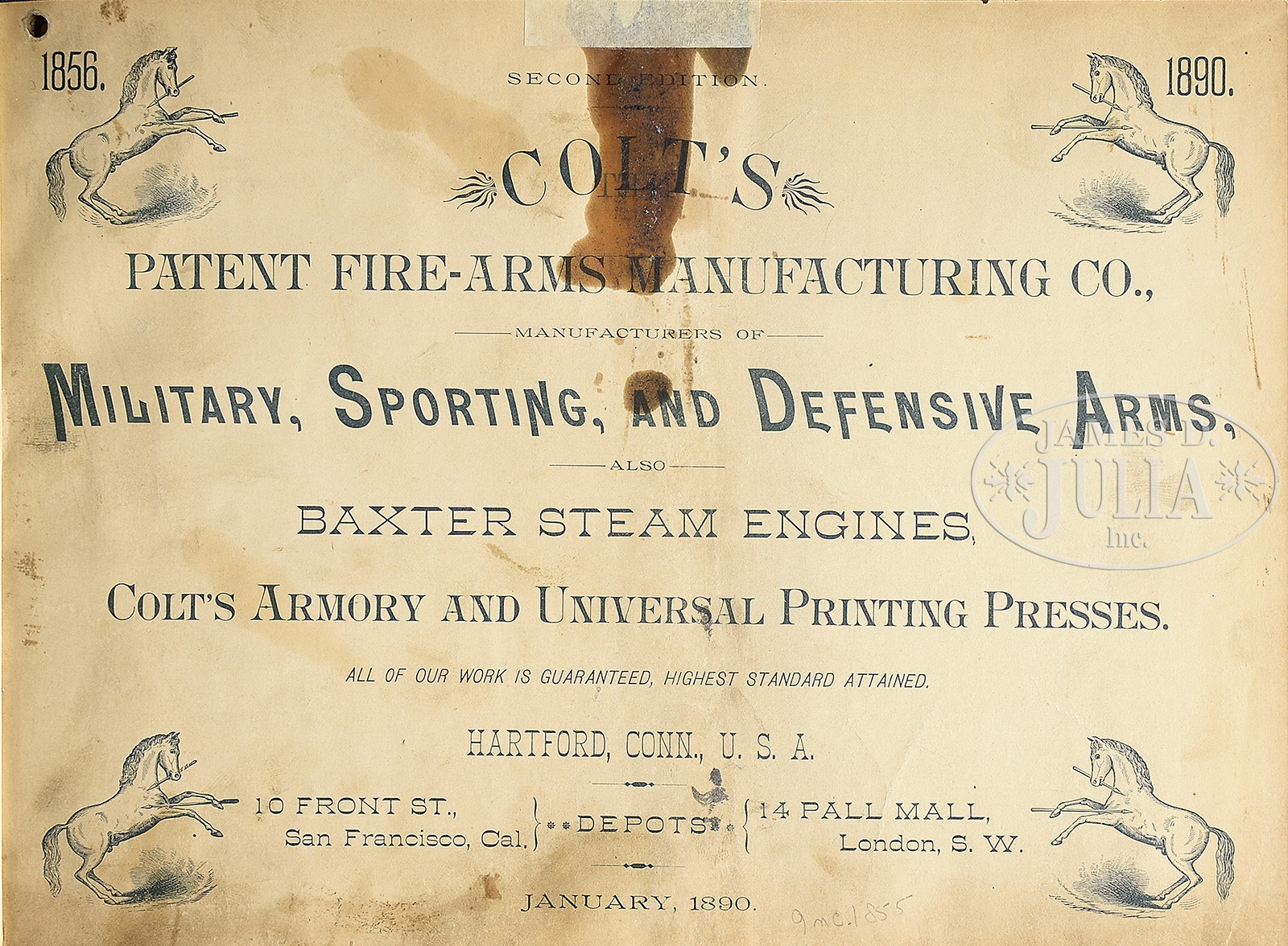 RARE ORIGINAL 1890 COLT FIREARMS DEALERS CATALOG.Wonderful illustrated catalog measuring 11-1/2″ x 8-1/2″, wraps, showing all of the Colt arms and parts available, along with re-loading tools, rear sights and some other components by other manufacturers for Colts in 1890. Great companion piece to collector of especially Lightning pistols and rifles as so much of this catalog is dedicated to the various Lightning models. Book has 37 numbered pgs overall; 38th pg is the blank back wrap. PROVENANCE: The Charles Copeland, Jr. Collection. CONDITION: Bound over wraps orig 38-pg. Text is very good with large stain bleeding through from cover to pg 8, paper taped repair to top edge of front decorated wrap. There is a whole punched through all pages in the upper left hand corner, probably for the orig spindle it was kept on. 50823-35 JS (500-1,000) – Lot 2381 Click here to view provenance
