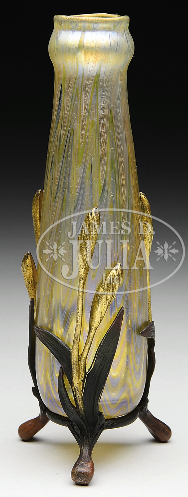 LOETZ DECORATED VASE.Loetz vase has clear glass body and gold iridescent dragged loops surrounding entire body. Iridescence shows strong purple, blue and platinum highlights. Vase is housed in a bronze holder with three feet leading to sculptural leaves, stems and stylized flowers extending up the vase. Holder is finished in dark brown and gold patina. Unsigned. SIZE: 8-1/4″ t. CONDITION: Very good to excellent. Bronze has some minor wear to patina; otherwise very good to excellent. 5-69008 (1,500-1,800) – Lot 2382