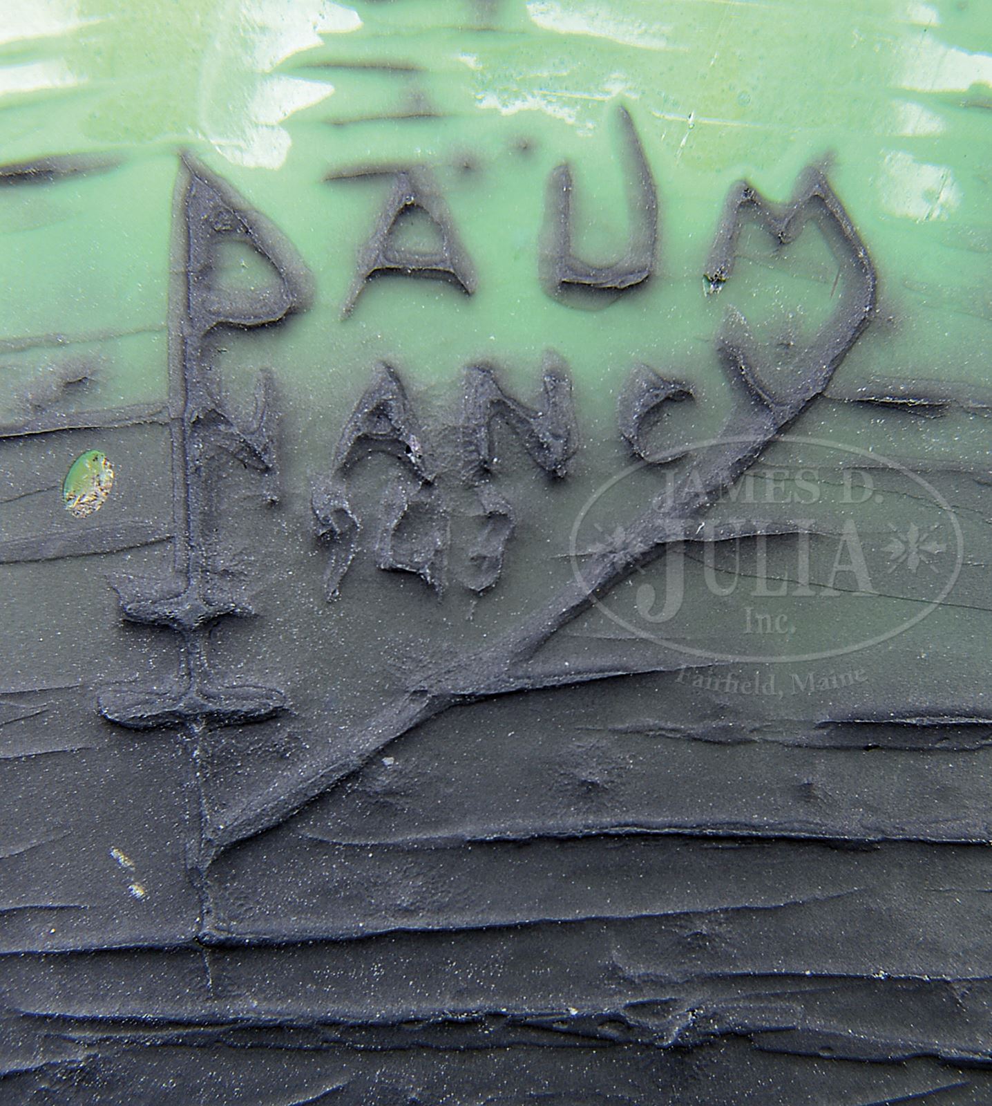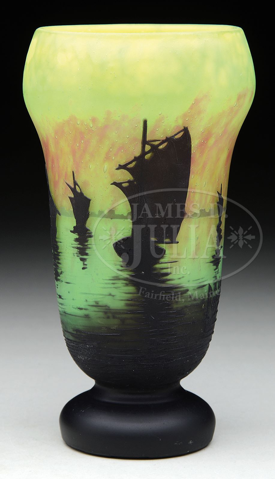 DAUM NANCY HARBOR SCENE VASE.Daum vase has black pedestal foot leading to black cameo sailing vessels in harbor against a background of bright yellow, green and orange mottled glass. Signed in cameo on side of vase “Daum Nancy” with cross of Lorraine. SIZE: 6-1/2″ t. PROVENANCE: From an Unreserved Texas Collection. CONDITION: Vase has been ground near rim above largest boat sail, otherwise very good. 50006-62 (800-1,200) – Lot 2382