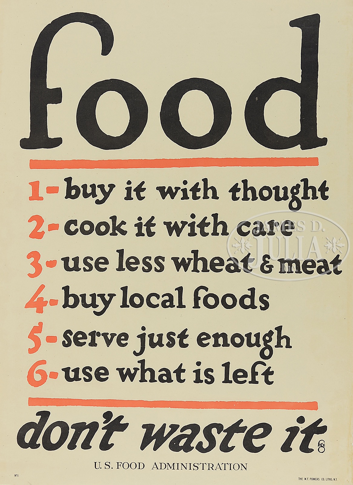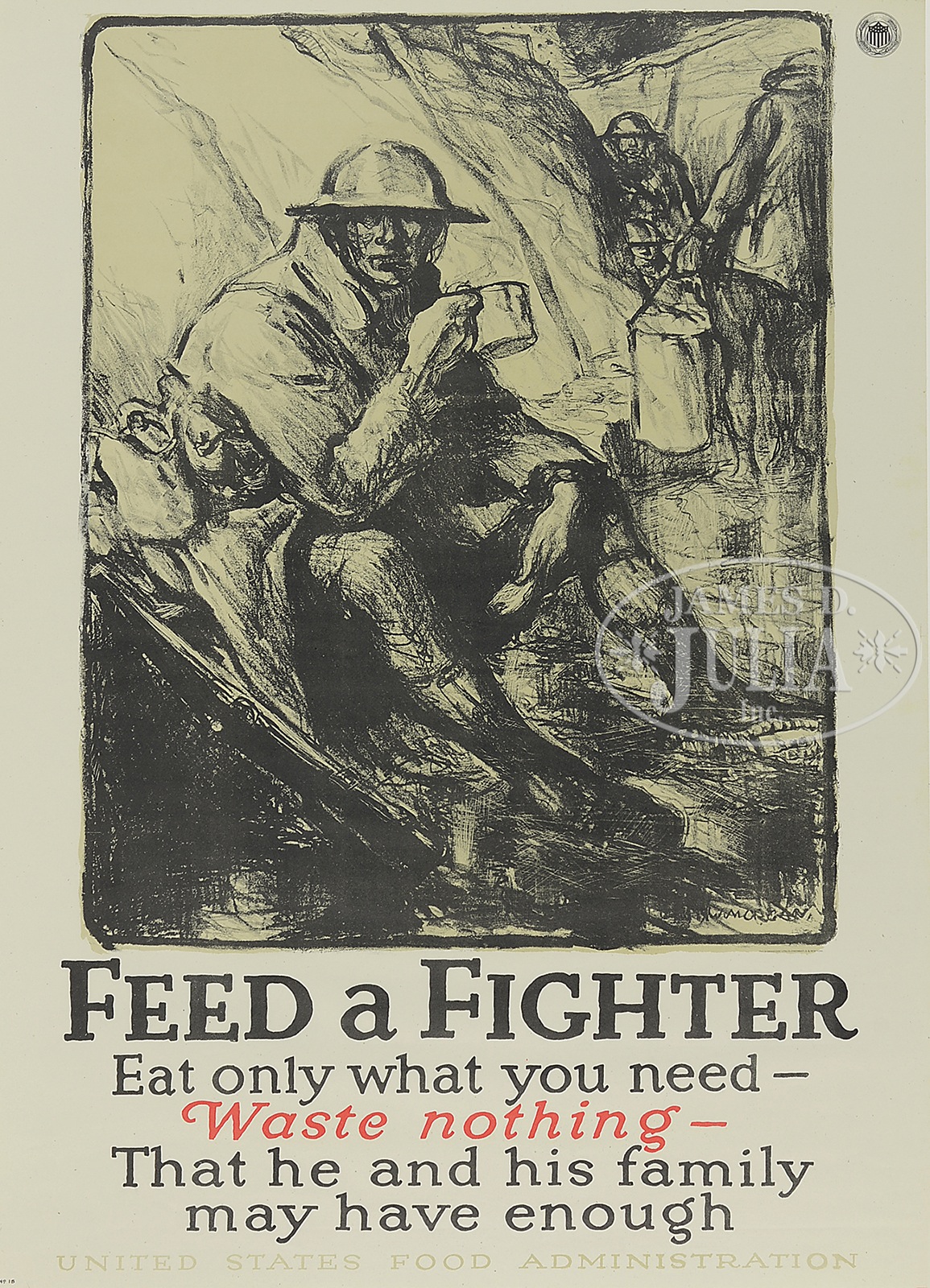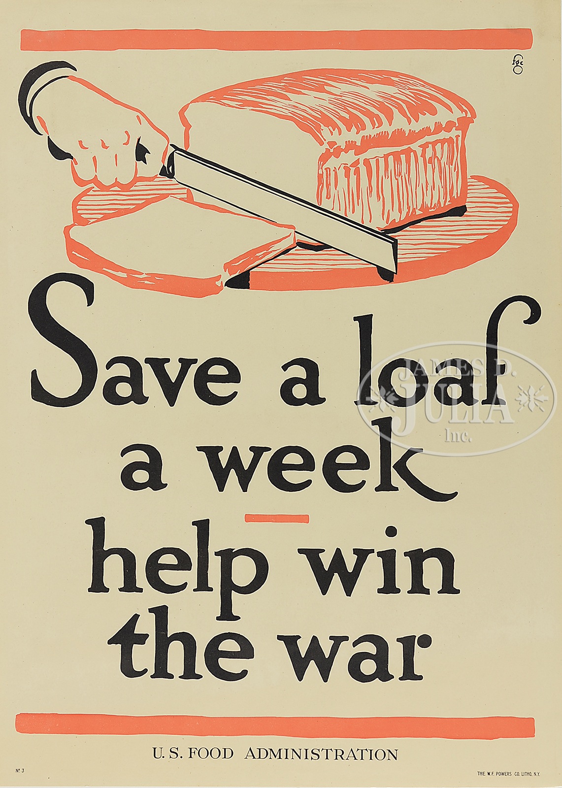 SIX WWI UNITED STATES FOOD ADMINISTRATION POSTERS.1) “Sir Don’t Waste While Your Wife Saves”, published by W.F. Powers Co. Litho N.Y., artist William Crawford Young, featuring cartoon image of a wasteful gentleman. 2) “Feed a Fighter”, by the artist Wallace Morgan, published by the Strobridge Lith. Co., Cincinnati, featuring the image of a dough boy with coffee. 3) “Save a Loaf a Week”, published by the W.F. Powers Co. Litho, N.Y., featuring the image of a loaf of bread. 4) “Food”, published by the W.F. Powers Co. Litho, N.Y. 5) “Save”, published by the W.F. Powers Co. Litho, N.Y. 6) “Keep it Coming”, artist signature Illian, published by the W.F. Powers Co. Litho, N.Y., featuring an image of a food convoy. All 6 posters shrink wrapped on a foam core. SIZE: 1) 29″ x 21″. 2) 29″ x 21″. 3) 29″ x 21″. 4) 29″ x 21″. 5) 29″ x 21″. 6) 29″ x 21″. CONDITION: 1) Very good, with minor folds in margins. 2) Very good. 3) Very good, minor fold upper left corner, minor stain upper right corner. 4) Very good, two very short tears on right margin. 5) Very good. 6) Very good, minor folds and stains, 4 tack holes. 9-96469 (800-1,200) – Lot 2383