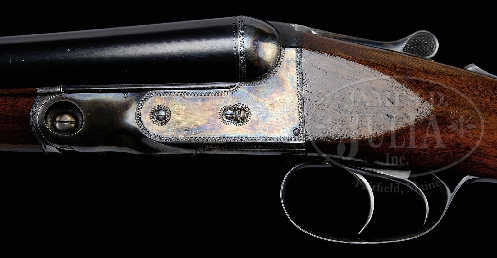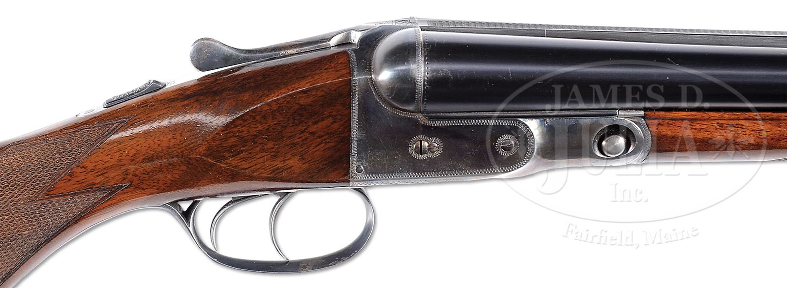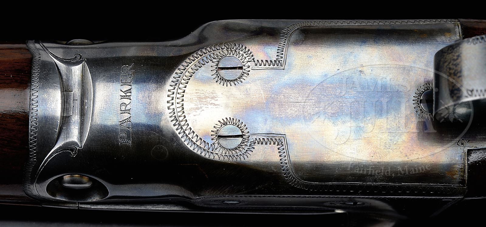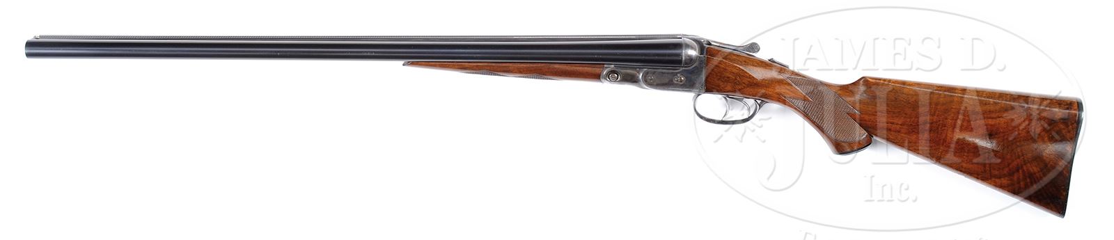 *TRULY EXCEPTIONAL, HIGH ORIGINAL CONDITION PARKER VHE.SN 238583. Cal. 12 ga. 2-3/4″ Chambers. 1-1/2 Frame. 26″ Bbls have concave, matted rib marked with Parker’s Meriden CT address and “VULCAN STEEL”. Bbl flats are stamped with steel type, Parker proofs, and weight. Left side of lump is stamped with SN. Typical Parker action has all correct numbers and marks on water table. Action features automatic safety and dbl triggers. Action is engraved in typical “V” style with wiggle borders. “PARKER” is on bottom. Trigger guard bow has wiggle borders. SN is at grip. Nicely stump figured American walnut Parker capped pistol grip buttstock measures 14″ over Parker dogs head buttplate without spur. Stock has point pattern checkering with mullered borders at grip. Vacant silver shield is on toe line. Matching splinter ejector forend has flat steel tip and typical Parker release. Bore diameter: left -.730, right -.730. Bore restrictions: left -.038 (full), right -.027 (Imod). Wall thickness: left -.032, right -.030. Drop at heel: 2-1/2″, drop at comb: 1-5/8″. Weight: 7 lbs 0 oz. LOP: 14″. All specifications match those listed in the PARKER GUN IDENTIFICATION AND SERIALIZATION LEDGER. CONDITION: Exceptionally fine, with only a few light marks in orig blue of bbls. Case color on action is exceptionally vivid, with just a hint of silvering on forend iron and sharp edges. Trigger guard retains most of its orig blue, most loss due to flaking, with grip area relatively brown. Color on forend latch and tip is vivid. Stocks retain essentially all of their orig finish, with some light marks and scratches, mostly on bottom left of butt. Bores are excellent. Action is tight. Ejectors are in time. THE PARKER STORY estimates that 2293 12 ga VH guns were made with 26″ Vulcan steel bbls. An exceptional benchmark gun useful in determining orig condition in others. 49006-1 MGM319 (5,000-8,000) – Lot 2383