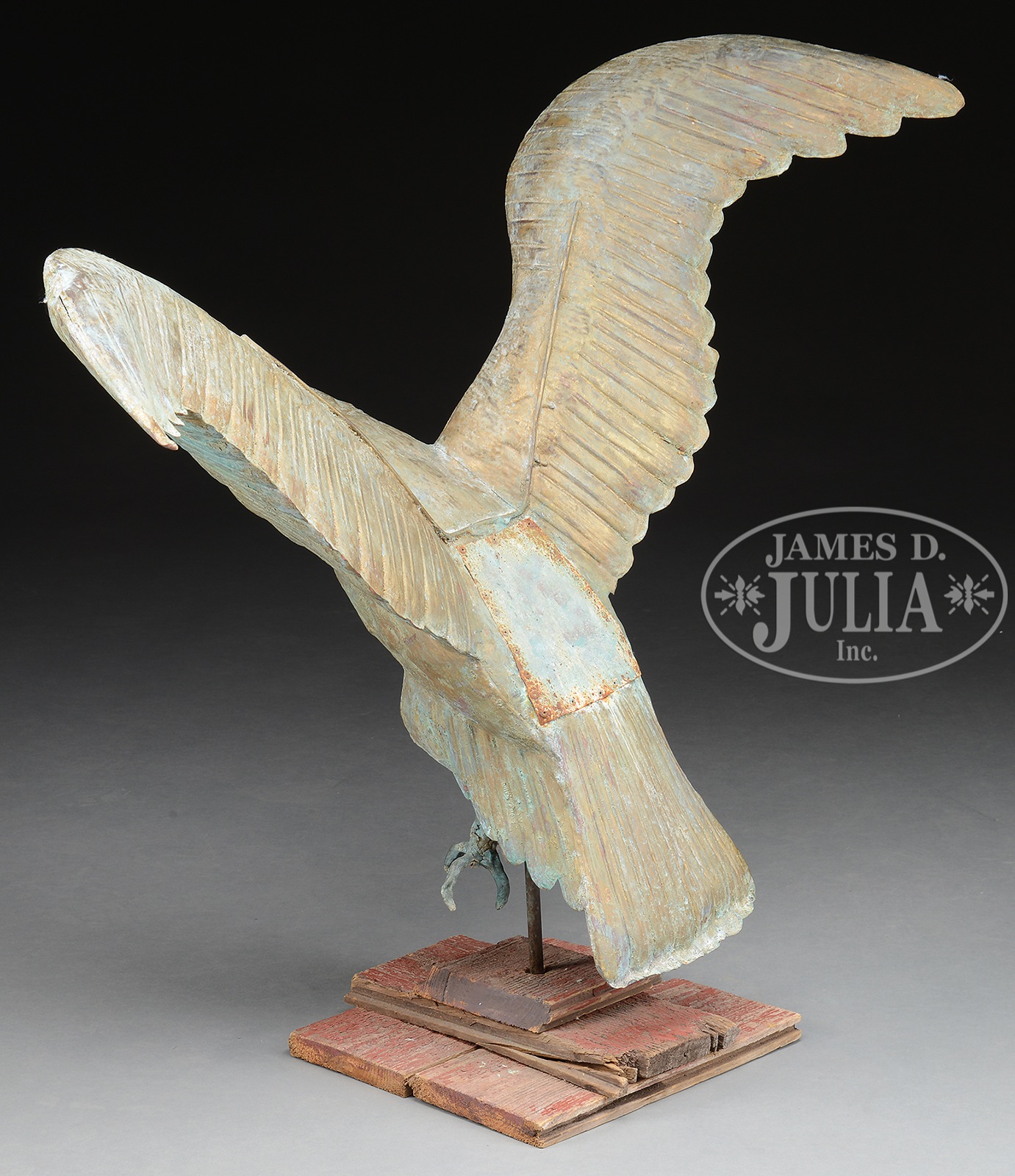 FULL BODIED SPREAD WING EAGLE WEATHERVANE.American, circa 1900. A bold example constructed of repousse sheet copper with a very weathered gilt and verdigris surface. Mounted on a weathered red painted barn wood table mount. SIZE: 30-1/2″ t x 3′ wingspan. PROVENANCE: From the private estate collection of John W. Armiger Jr. CONDITION: Repairs to back between wings, age cracks and separations to talons. Mounting tube replaced, with re-soldering on underside between talons. Some dents and loss to surface. 50099-10 (800-1,200) – Lot 2383