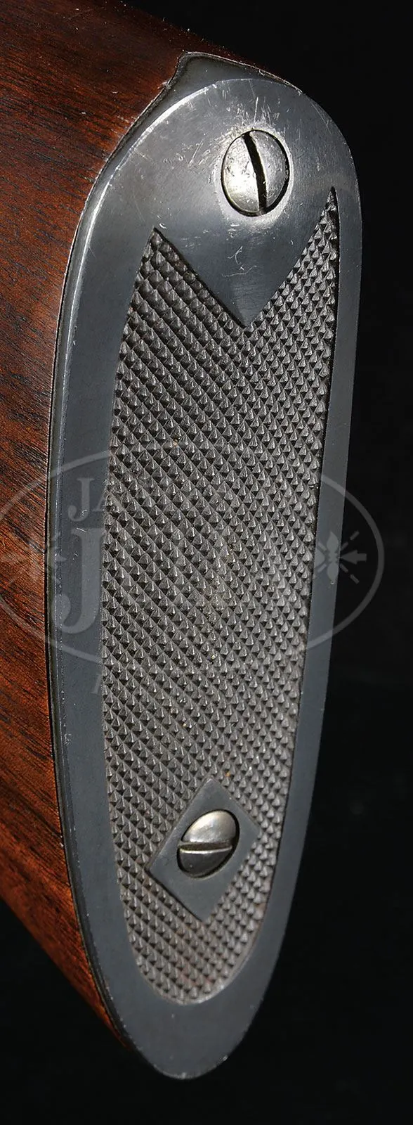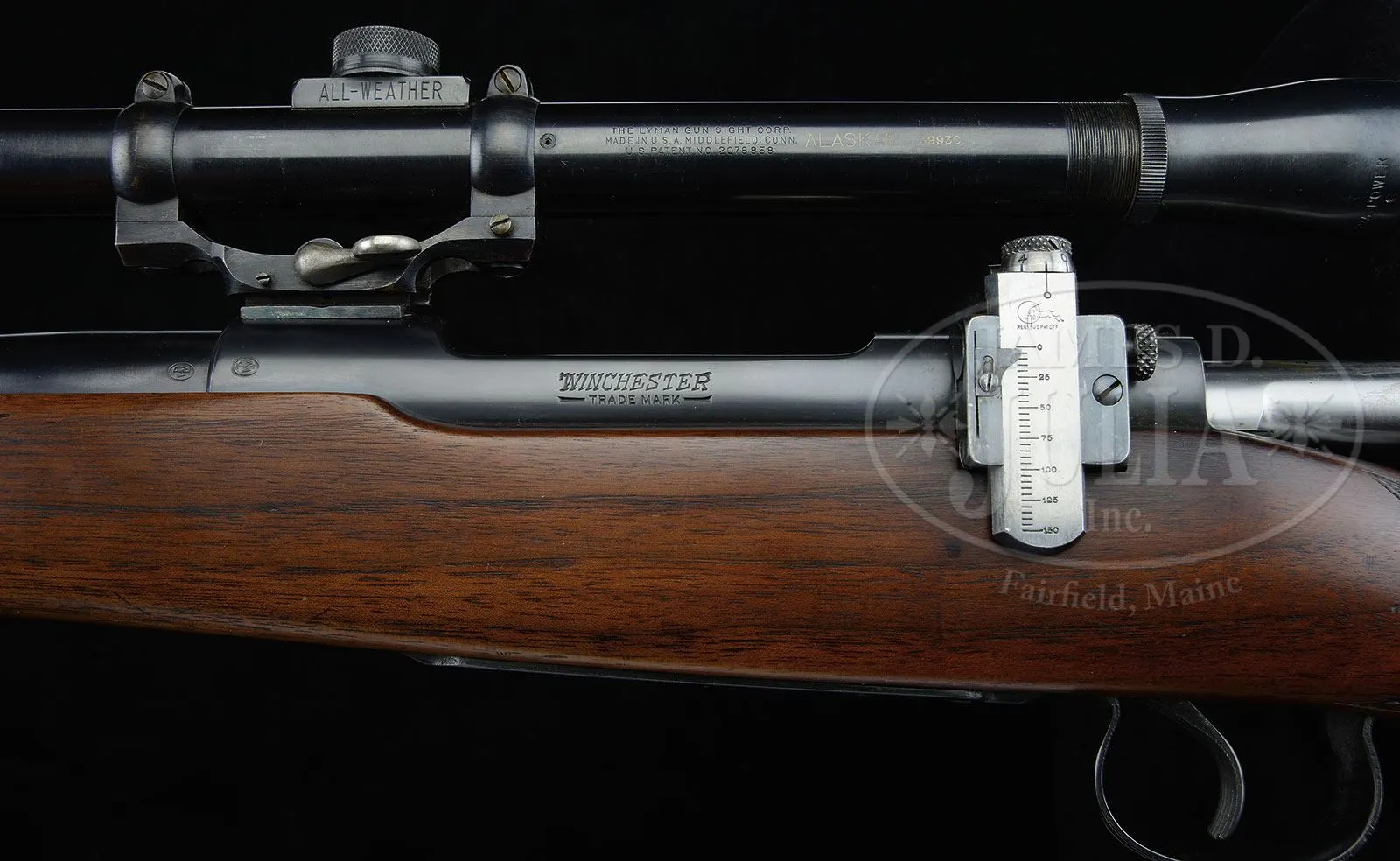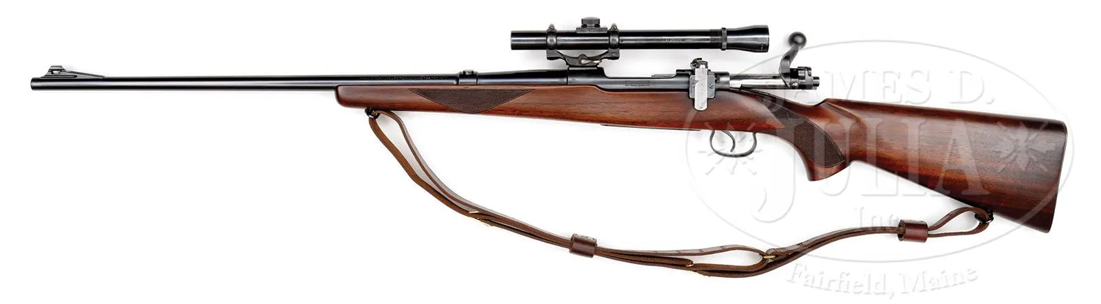 *HIGH ORIGINAL CONDITION WINCHESTER MODEL 54 WITH SCOPE.SN 41324A. Cal. 22 Hornet. Standard configuration and markings with 24″ standard weight bbl. Rear sight slot is filled with blank. Typical action is fitted with Lyman 48 receiver sight, and a scope block is in orig tapped holes on receiver ring, which mount a Lyman All Weather 2-1/2 X scope in well made QD rings/ base. Pistol grip stock features standard checkering, sling swivels, and checkered steel buttplate. Rifle also comes with Winchester marked sling. CONDITION: Exceptionally fine. All metal parts retain nearly all of their orig blue with only a few light handling marks, (even trigger guard/ floorplate, which is almost always heavily flaked). There are a few minor pings and light marks on stock. Buttplate retains nearly all of its blue with only a few light marks at heel. Bore is excellent, bright, sharp, and shiny throughout. Scope is excellent, with a few light marks in blue. Optics slightly clouded. As fine an example of this pre-war classic as one could hope to find. 4-50458 MGM93 (1,500-2,500) – Lot 2383a