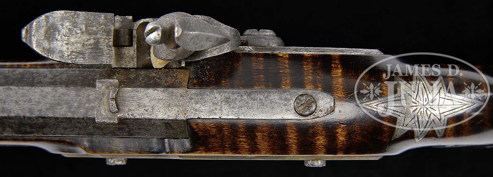 Please Note: We can not guarantee the period of origin. SOUTHERN FLINTLOCK CURLY MAPLE HIGHLY INLAID KENTUCKY PISTOL.SN NSN. 8-1/4″ full oct 41 Cal. unmarked rifled bbl. Nicely curled red finished maple stock with 9 silver inlays which include a bird on left side, a snake on right side an engraved 8 pointed star behind bbl tang and 3 crosses on left side of grip. Cap box in butt. Large full brass sideplate is not engraved. This pistol appears to be of southern manufacture, perhaps Tennessee. PROVENANCE: Frank Sujansky Collection. CONDITION: Fine. Two silver tacks appear to be missing, one for the eye of snake and one for eye of a fish inlay near muzzle. 4-49471 RG33 (4,000-8,000) – Lot 2384