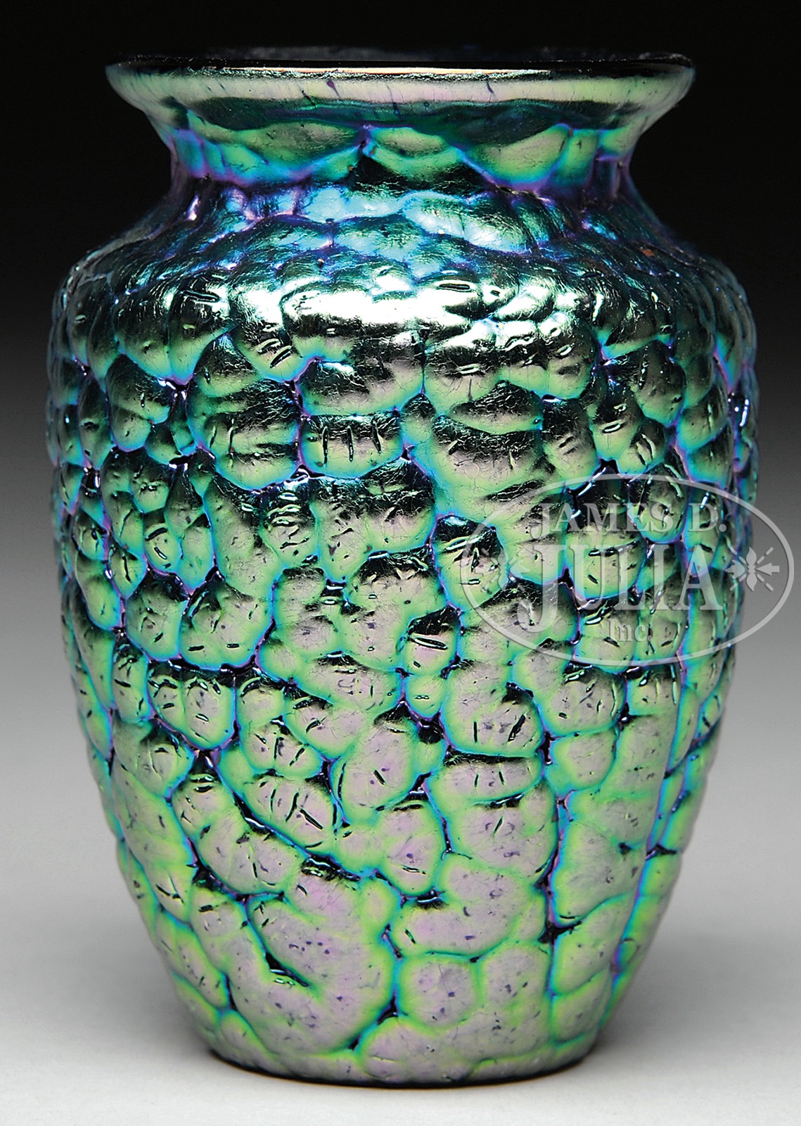 LOETZ LAVA VASE.This spectacular little Loetz cabinet vase is decorated with a highly textured surface to replicate lava. It is finished with a bright green iridescence with flashes of blue and purple highlights. Interior of the vase is finished with a bronze iridescence with subtle purple highlights. Unsigned. SIZE: 4″ t. PROVENANCE: Linda Southworth Collection. CONDITION: Very good to excellent. 5-68272 (1,000-1,500) – Lot 2384