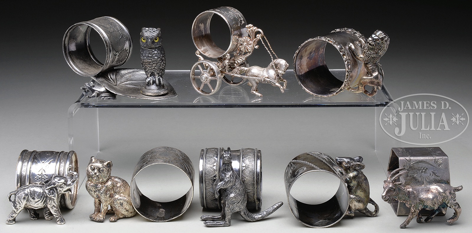 LOT OF 8 FIGURAL NAPKIN RINGS.1) A small frog supports a leaf, which holds a removable pepper shaker in the form of an owl with glass eyes. The napkin holder is attached to the stem of the leaf. Marked “Meriden B. Company #35”. Plate 377. CONDITION: Silver is good. 2) A small, bucking horse pulls a napkin holder on wheels. This is a child-sized napkin holder. Marked “Meriden B. Company #213”. Page 80. CONDITION: Silver is good. 3) Cat sits next to napkin holder. Marked “Knickerbocker Silver Co.” on a button. No numbers. CONDITION: Silver is fair to good. 4) A goat walks alongside a hexagonal-shaped napkin holder. No makers mark or numbers. Plate 81. CONDITION: Silver is fair to good. 5) A lion rampant holds a plain napkin holder with scrollwork edges. No makers mark or numbers. Plate 123. CONDITION: Silver is good. 6) A cute mouse climbs the side of a napkin holder, its tail serving as a stabilizer. No makers mark or numbers. Plate 129. CONDITION: Silver is fair to good. 7) A kangaroo on its hind legs and tail sits next to napkin holder. No makers mark or numbers. Plate 168. CONDITION: Silver is fair to good. 8) An elephant with upraised trunk stands next to napkin holder. No makers mark or numbers. CONDITION: Silver is very good. CONDITION: As noted. 49090-30 (500-700) – Lot 2385 Auction: Advertising, Toy & Doll - Spring 2015 Please Note: All prices include the hammer price plus the buyer’s premium, which is paid by the buyer as part of the purchase price. The prices noted here after the auction are considered unofficial and do not become official until after the 46th day. |