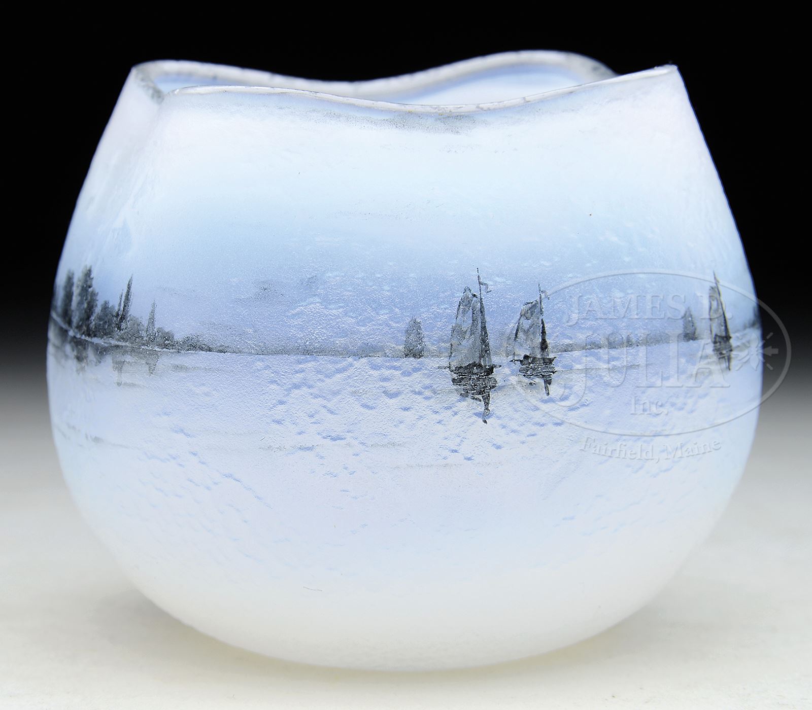 Daum vase with pinched upper rim has enameled Dutch shore scene with windmill, buildings and trees near a lake with sailboats, all set against an opalescent acid-textured background. Signed “Daum Nancy” with cross of Lorraine in gold on underside . SIZE: 2-3/4″ t. PROVENANCE: From an Unreserved Texas Collection. CONDITION: Very good to excellent. 50006-63 (500-700) – Lot 2385