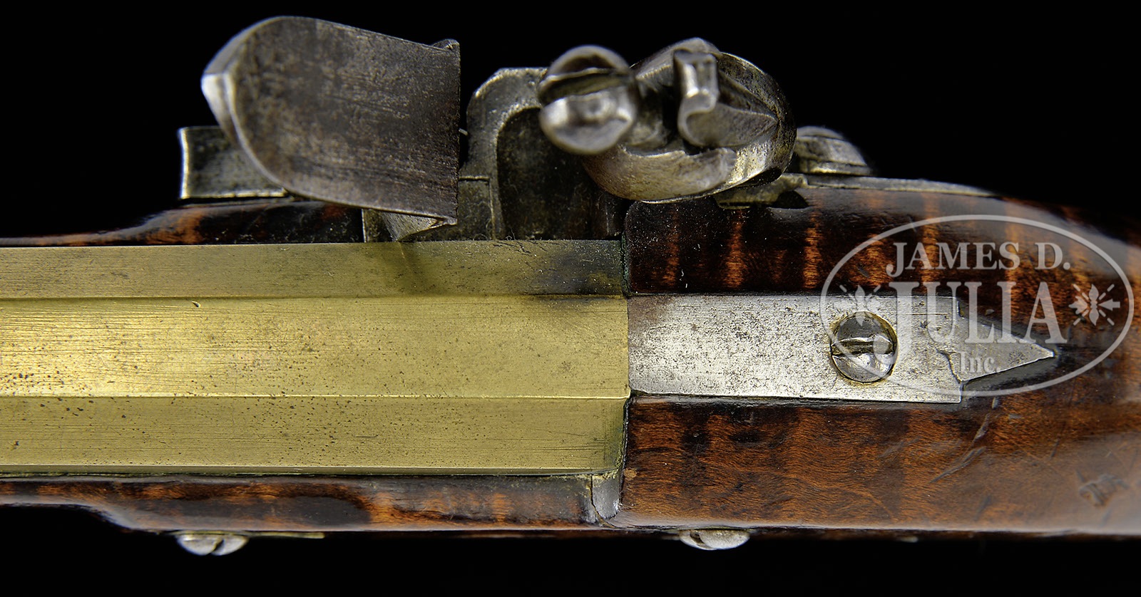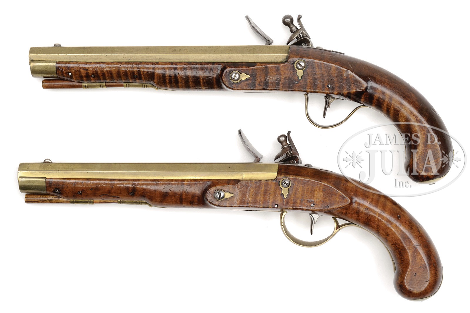 PAIR OF FLINTLOCK CURLY MAPLE UNMARKED BRASS BARREL PISTOLS.SN NSN. 8-1/4″ full oct 41 Cal. smooth unmarked brass bbls with pointed iron bbl tangs. Stocks are nicely figured curly maple with brass buttcaps. Each brass trigger guard is a different shape with its own unique finial. Flintlocks have no markings. There is nothing on either pistol to indicate its area of manufacture. PROVENANCE: Frank Sujansky Collection. CONDITION: Excellent. Not a matched pair. 4-49455 RG34 (6,000-14,000) – Lot 2387
