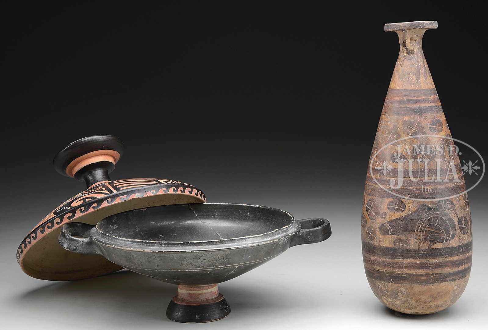 TWO POTTERY ANTIQUITY ITEMS.1) 10-1/2″ h, round bottom vase with rope hole at neck. Tapered shape with flat rim, 2 bands of pictographs of birds, separated with 3 red lines. Unknown age, probably Mediterranean. 2) 7-1/2″ h x 8″ dia., covered 2 handled bowl. Cover having red and black decoration with a cream ground, the base with a black finish. Unknown age. SIZE: As noted above. PROVENANCE: From the personal estate collection of John W. Armiger Jr. CONDITION: Both pieces have surface dirt and wear, the bowl has cracks in both pieces. 49055-57 (2,000-4,000) – Lot 2387