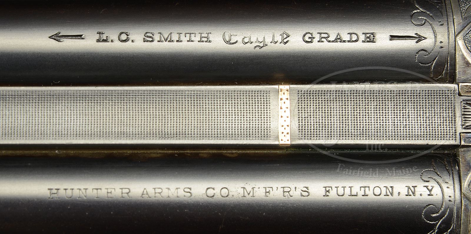 *RARE 20 GAUGE L.C. SMITH EAGLE GRADE.SN 8089E. Cal. 20 ga. 2-3/4″ Chambers. 26″ Bbls with slightly raised matted rib are marked “L. C. SMITH Eagle GRADE” and “HUNTER ARMS CO. M’F’R’S FULTON N.Y.” on tops. Bbl flats are stamped with SN and “E”. Bottoms of bbls are stamped with nitro steel logos. Typical featherweight action features automatic safety and double triggers, and is engraved with large scroll surrounding unique “Eagle” grade, semi-relief flying birds in stippled backgrounds on lockplates; a pheasant on left, a mallard on right, and top lever with relief eagle. SN is on tang of scroll engraved trigger guard. “L. C. Smith” is on front of each lockplate. Lightly streaked European walnut capped pistol grip buttstock measures 14″ over Silver pad. Point pattern checkering with line border is at grip. Splinter ejector forend has inset ebony tip, as well as secondary release in guitar shaped escutcheon. Bore diameter: left-.615, right -.613. Bore restrictions: left -.021 (full), right -.009 (Lt. mod). Minimum wall thickness: left -.023, right -.025. Drop at heel: 2-3/8″, drop at comb: 1-1/2″. Weight: 5 lbs. 7 oz. LOP: 14″. CONDITION: Very fine. Bbls retain over 80% orig blue, thinned and browned above forend from normal hand wear. Action and lockplates retain 70 – 80% orig case hardening color, silvering on bottom from normal wear. Trigger guard retains approx 10 – 20% orig blue, silvered at grip and nearly all of the bow. (Wear pattern suggests owner of this gun normally carried it over the crook of his arm.) Stocks retain most of what appears to be their orig finish with light marks and dings, with added oil, as maintenance. Checkering is slightly worn and filled. There are stress cracks and chips behind lockplates. Bores are excellent. Action is tight. Ejectors are in time. Only 111 20 bore Eagle grades were made; This is a rare bird. 4-51324 MGM132 (15,000-20,000) – Lot 2388