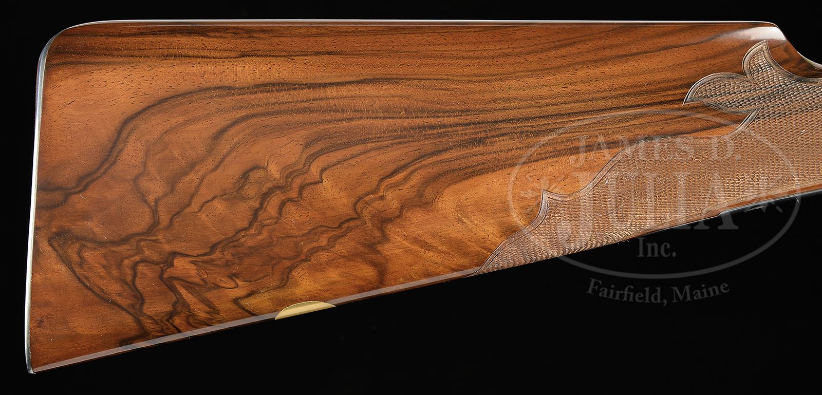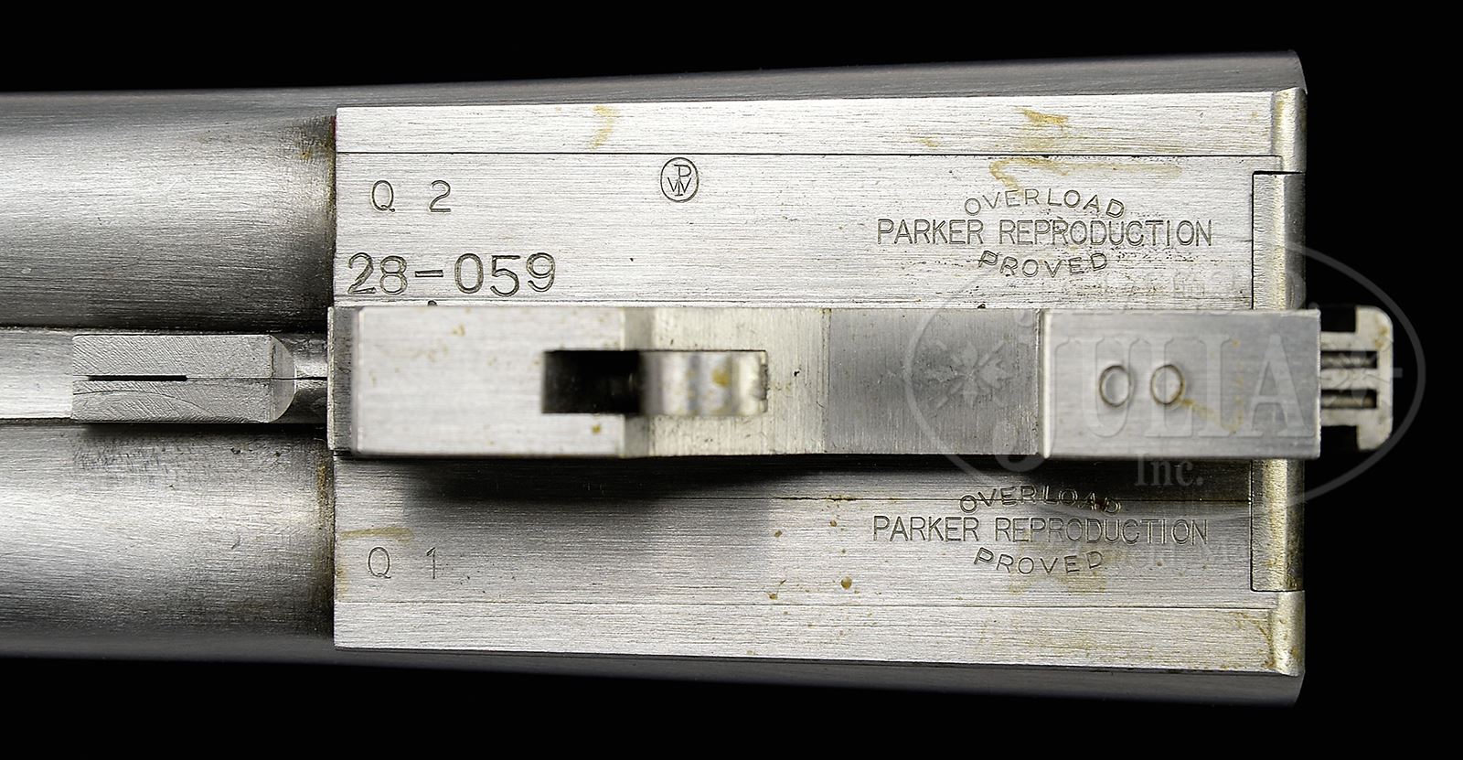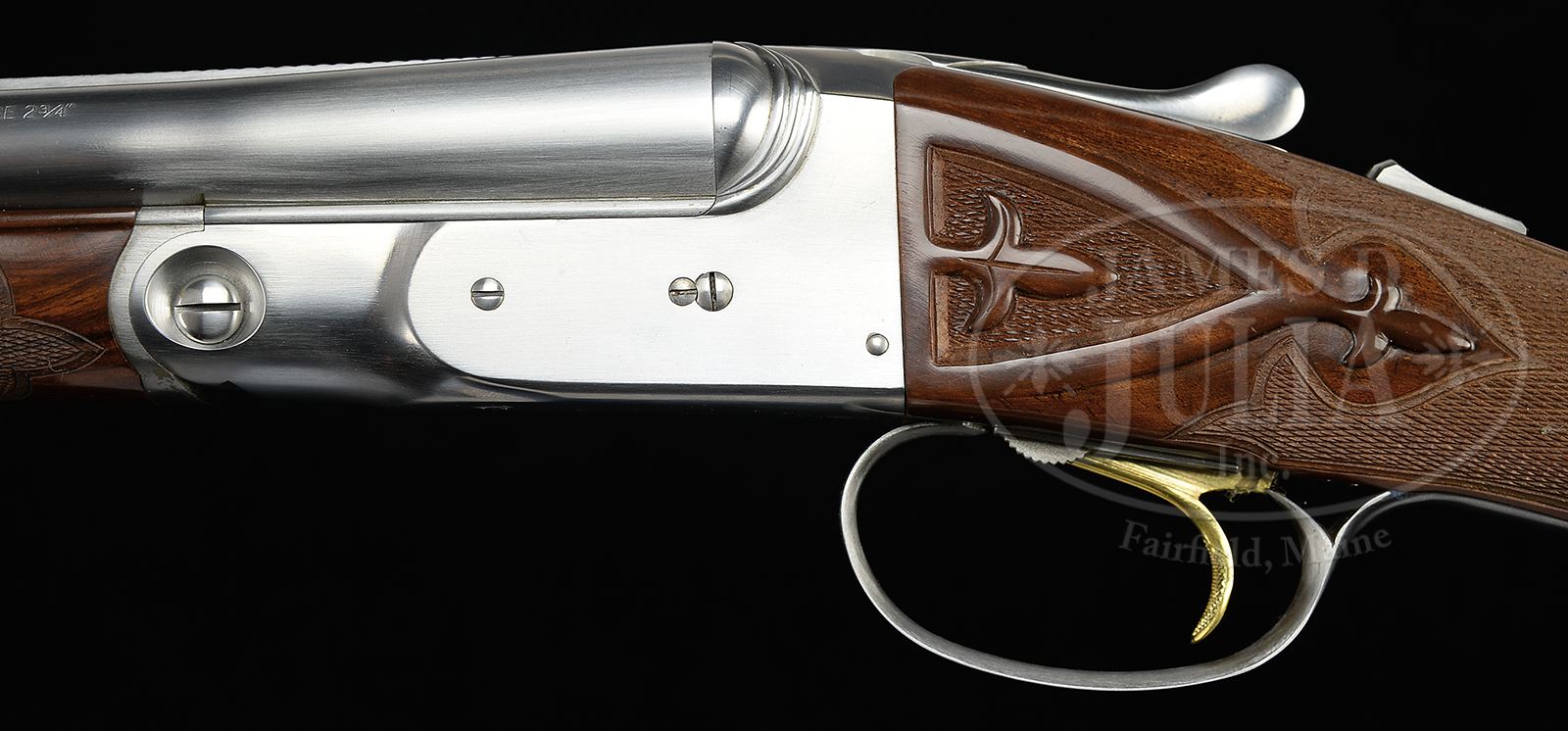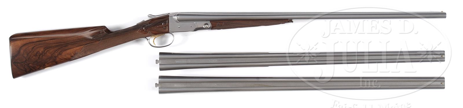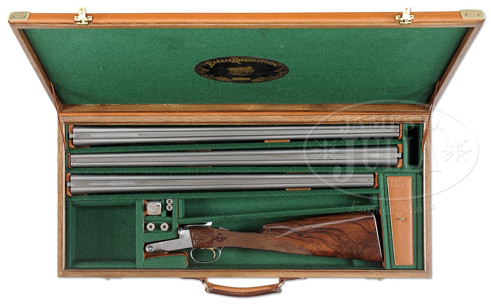 SN 28-059. Cal. 28 ga/ 28 ga/ .410. Consignors notes state “28 ga. 28″, M & F 26″ Q1 & Q 2, and 28″ .410 3″ M & F. It is believed that only 14 of these three barrel sets were made, and I was told that this set is the only one that left the factory ‘in the white’ for custom engraving.” All sets of bbls with matted game ribs have Parker Reproduction By Winchester information, and “Made in Japan” marked on ribs. Calibers and chambers are marked on left sides. SNs and Parker reproduction proofs are on bbls flats. Loops are stamped “1”, “2”, and “3”. Two forends are furnished, one for both 28 ga. sets, and another for .410. .410 rear lumps are stamped for frame size “0000”. 28 ga. Bbls are both stamped for frame size “00”. Action is filed with three beads behind fences, and is fitted with automatic safety and gold-plated Parker sgl selective trigger with finger blade checkered. Finely marbled and nicely flame figured European walnut straight grip buttstock measures 14-1/4″ over skeleton steel buttplate with checkering with fleur-di-lis intrusion. Stock is carved and checkered in “A-1” Special style with raised fleur-di-lis in sunken side panels, as drop points, and theme carries into very fancy checkering pattern. Matching splinter ejector forends have nicely filed steel tips, and typical Parker releases. BBL set “1” 28″ 28 ga.: Bore diameter: left -.555, right -.555. Bore restrictions: left -.040 (full), right -.020 (mod). Drop at heel: 2″, drop at comb: 1-1/4″. Weight: 5 lbs 12 oz. LOP: 14-1/4″. Bbl set “2” 28 ga. 26″: Bore diameter: left -.556, right -.555. Bore restrictions: left -.012 (Lt mod), right -.011 (IC). BBL set “3” .410: Bore diameter at muzzles: left -.390, right -.401. Gun and all three sets of bbls are housed in nice quality oak and leather case with brass corners and tan canvas outer cover, with tan leather trim. Case is lined in green felt, and has Parker Reproduction Winchester black leather label in lid. Case contains pair of Parker marked snap caps and oil bottle, with a pair of unmarked .410 snap caps, and some associated paperwork and keys. PROVENANCE: Larry Baer Estate Collection. CONDITION: Excellent, essentially as new, appears unfired, with only a few of the lightest of handling marks on wood and metal. Case is excellent. An unusual opportunity to acquire one of these exceptionally well made sets. 49427-2 MGM388 (20,000-30,000) – Lot 2388