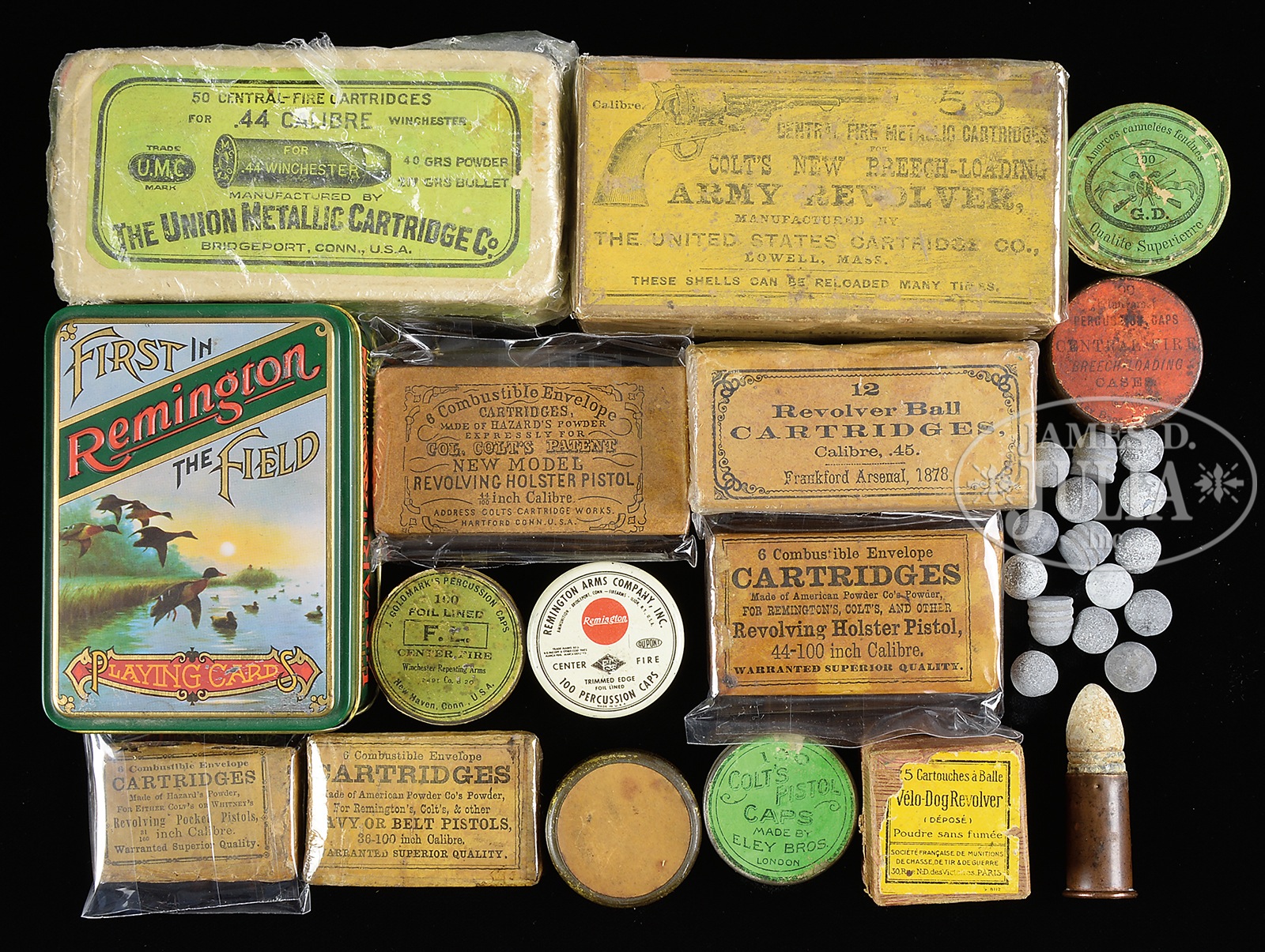 LOT OF COLLECTORS AMMO.Lot consists of: 1 box 44cal UMC cartridges; 1 partial box of 44cal central fire cartridges; 6 tins of percussion caps; 1 partial box of Velo-Dog cartridges; 2 small bags of 44 and 36 cal balls; 1 box of 45cal cartridges from Frankford Arsenal 1878; 2 packets of 44cal combustible envelope cartridges; 1 box of 36cal combustible envelope cartridges; 1 box of 31cal combustible envelope cartridges; 1 52cal rim-fire cartridge; 1 tin box of assorted rim-fire and early center-fire cartridges. PROVENANCE: The Estate of G.W. “Bill” Stewart of Sonora, Texas. CONDITION: Very good overall. A chance to purchase Bill Stewart’s stash of cartridges that may very well come in handy to someone someday. 49973-391 TEP (600-800) – Lot 2388