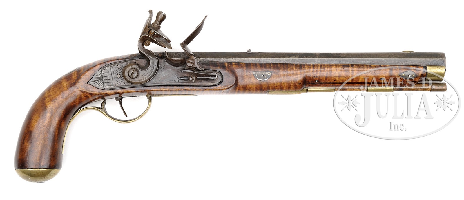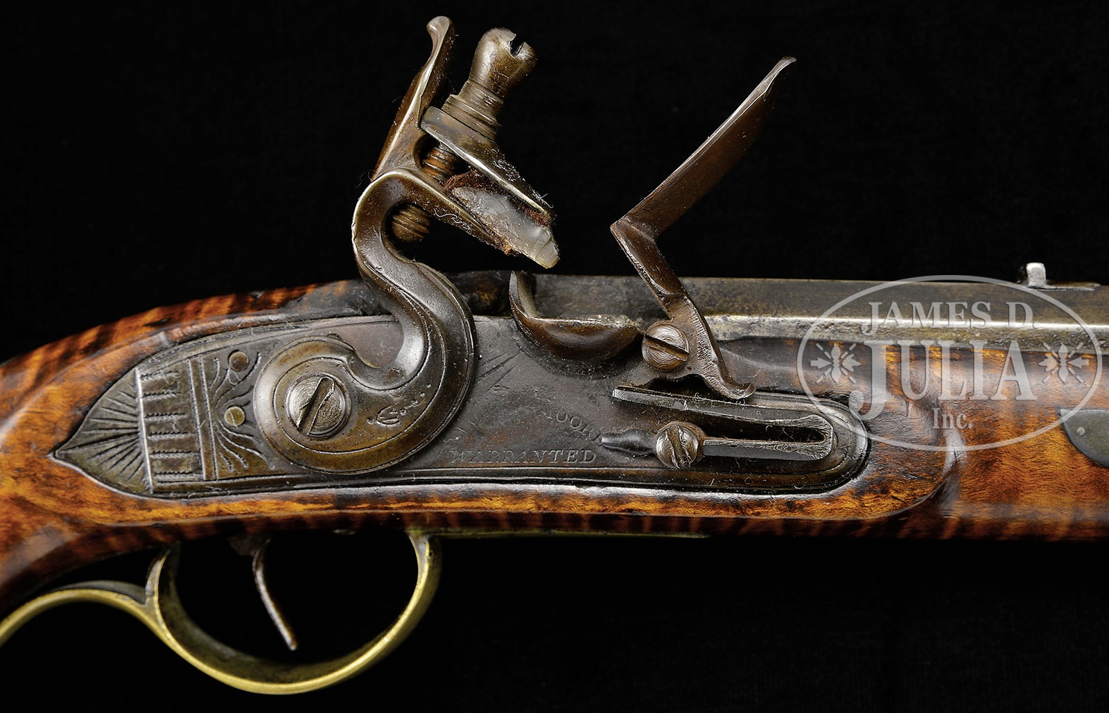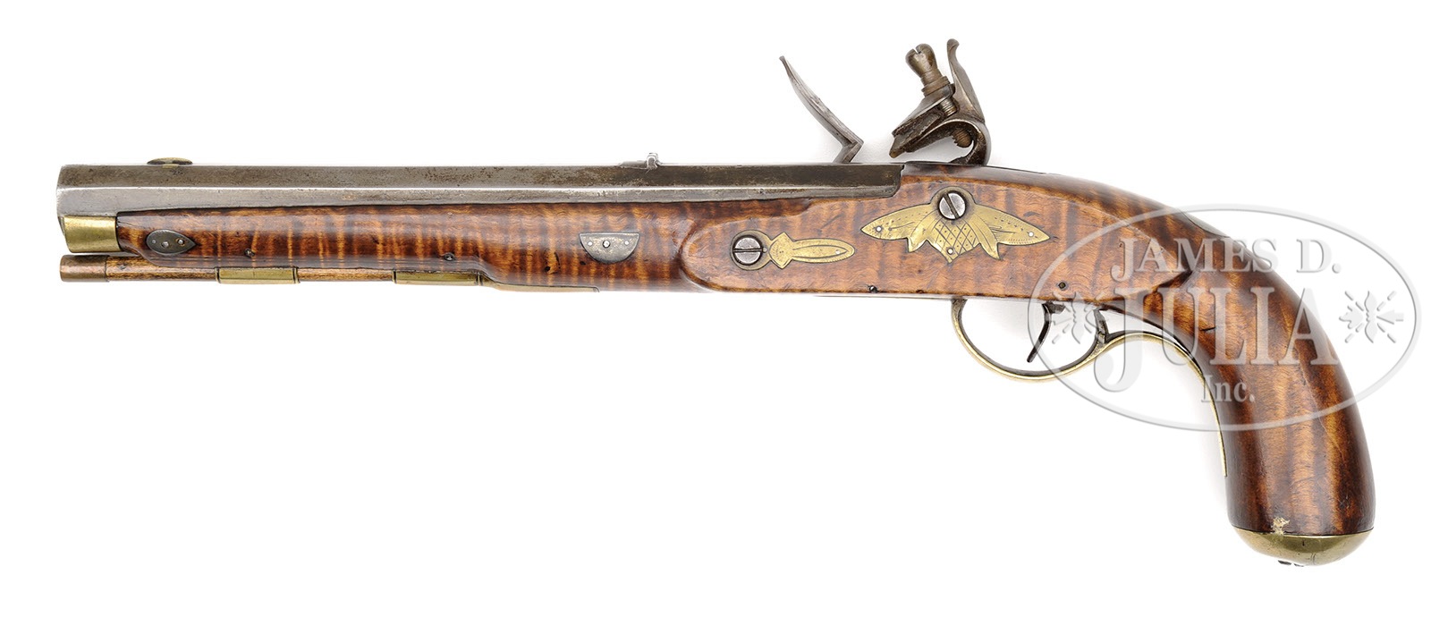 VERY ATTRACTIVE CURLY MAPLE UNIDENTIFIED FLINTLOCK KENTUCKY PISTOL.SN NSN. 9-1/2″ full oct 45 Cal. unmarked rifled bbl held to stock with bbl pins surrounded by silver inlays. Overall 15-1/4″. Engraved flintlock is marked “…MOORE WARRANTED”. Brass sideplates are engraved, other brass furniture is not. Very short 5/8″ closed brass nosecap. Forend wood has 2 scribe lines running above ramrod channel on each side. Silver oval inlay on wrist behind bbl tang. PROVENANCE: Frank Sujansky Collection. CONDITION: Excellent. Flintlock is reconverted. Lock maker name is incomplete. 4-49479 RG37 (3,500-8,500) – Lot 2391
