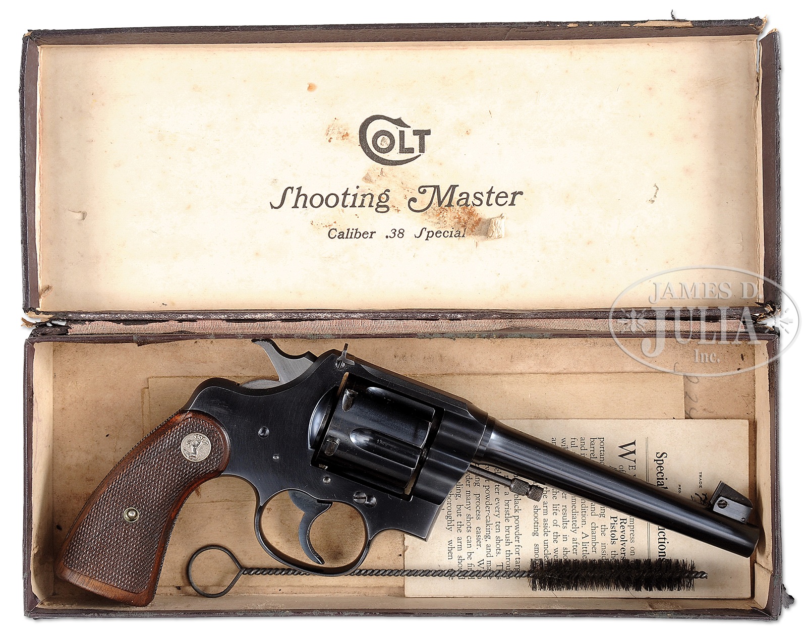 *SUPERB COLT SHOOTING MASTER .38 WITH BOX.SN 334173. Cal. 38 SPL. 6″ bbl. Commercial blue finish overall with exceptional checkered walnut grips with rampant Colt medallions. Standard Shooting Master with adjustable front and rear sight. Accompanied with numbers matching box and test target. Also included is sight adjustment tool and cleaning brush. Manufactured 1932. PROVENANCE: The Charles Copeland, Jr. Collection. CONDITION: Very fine orig condition with only the slightest amount of finish loss on bottom of butt and leading edge of muzzle. Grips are exceptional with slight traces of wear at base only. Bore and mechanics are excellent. Box is very good but missing label. 50823-7 TDW (3,000-5,000) C&R – Lot 2391