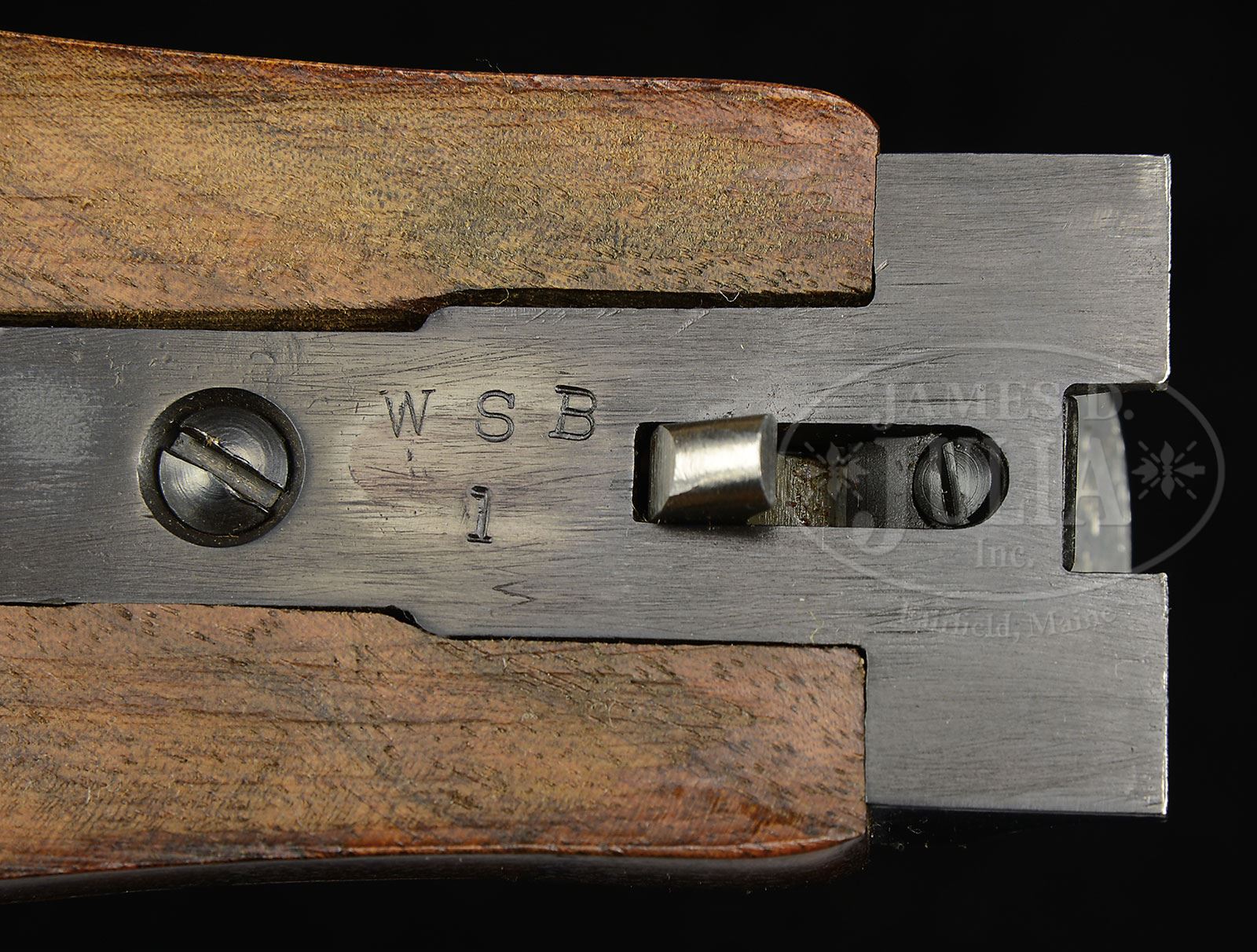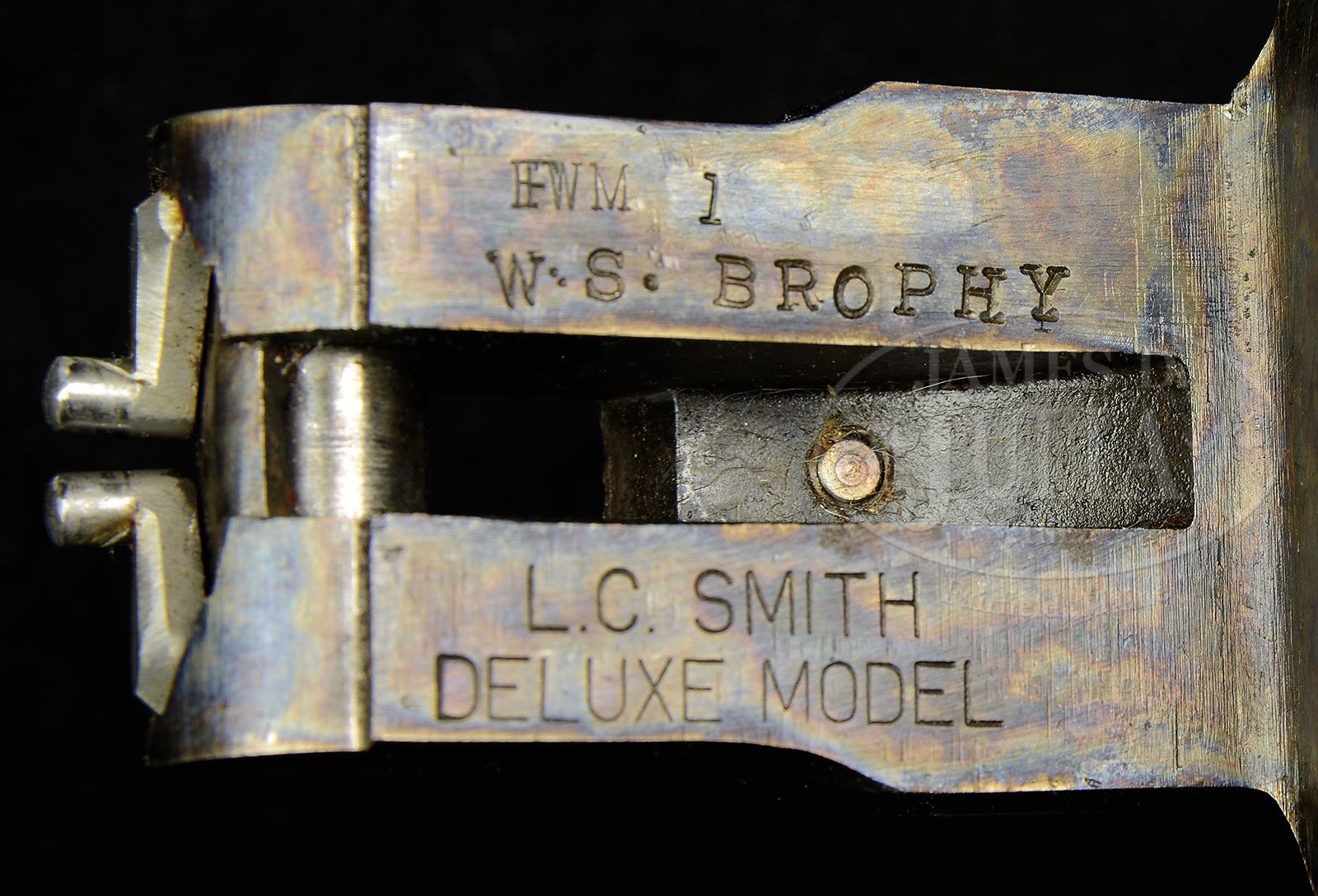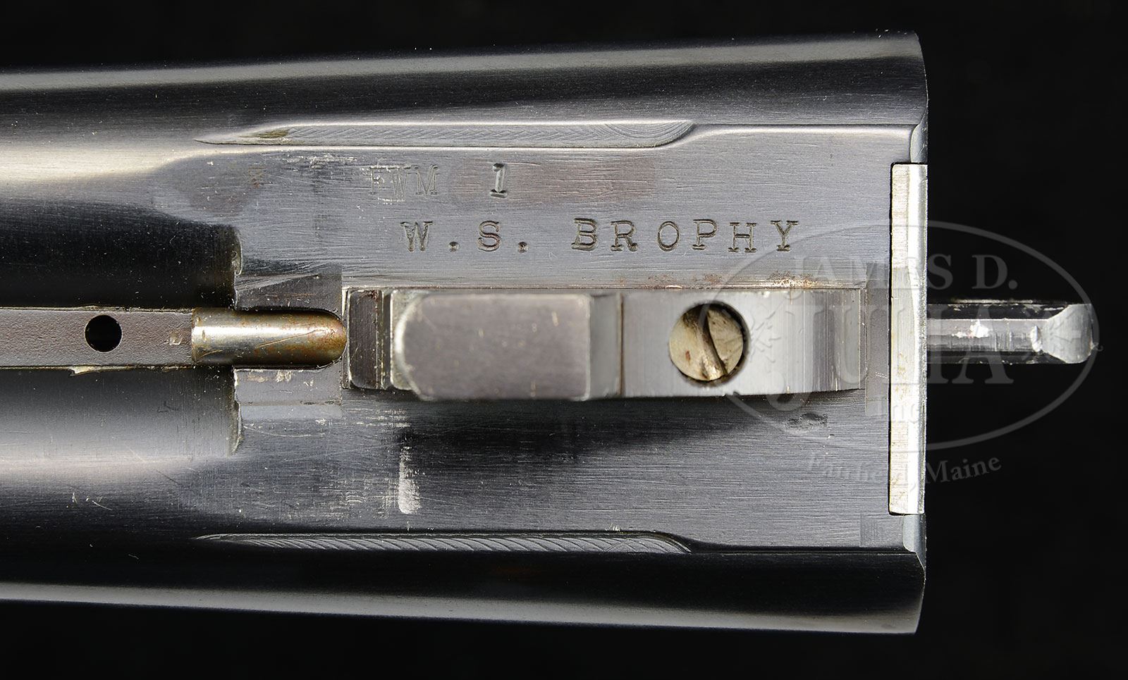 Please note: Our catalog description correctly states that this gun is with a Huey case, not “original Huey case that came with the gun”. Indeed, as most gun officionados know, almost all Huey cases are after market additions. Also, please note that we have the original cardboard and styrofoam box the gun came in, not previously stated. *THE FIRST MARLIN MADE L.C. SMITH DELUXE GRADE PRESENTED TO WILLIAM BROPHY WITH HUEY CASE.SN FWM1. Cal. 12 ga. 2-3/4″ Chambers. 28″ Bbls with Simmons ventilated rib, are marked “L. C. Smith 12 Ga” at rear portion of rib. Bbl flats are stamped with SN “FWM1” and “W.S. Brophy” (production range SN for the deluxe grade were FWM100,000 – 100,188). This gun was specially selected and marked for Mr. Brophy, senior technical manager to Marlin Firearms Co., and author of L.C. SMITH SHOTGUNS. Case hardened action features automatic safety and double triggers. Water table is also stamped “FWM1” and “W. S. Brophy”, along with “L. C. Smith Deluxe Model”. Trigger plate is marked “THE MARLIN FIREARMS CO” “NORTH HAVEN, CONN.” Nicely figured American walnut capped pistol grip buttstock measures 14″ over checkered composition buttplate. Point pattern checkering with beaded border is at grip. Late style swept beavertail forend is stamped “WSB1″ on inside of iron, and has J-spring release. Drop at heel: 2-3/4″, drop at comb: 1-3/4″. Weight: 7 lbs. 8 oz. LOP: 14”. Gun is housed in excellent quality oak and leather case with stitched leather corners by Huey (brass Huey label is numbered 780). A brass oval on top is engraved “W. S. Brophy”. Interior is lined in burgundy suede, and has black leather gold embossed L. C. Smith label in lid. Interior is semi-French fitted for gun and accessories including 2-pc ebony and brass cleaning rod with mop, jag, and brush under covered compartment, ebony handled cleaning brush, an ebony and brass chamber brush, a pair of brass snap caps, and a round brass oil bottle. Carrying handle has been disassembled from exterior of case and is now in an interior compartment with hardware in plastic bag. PROVENANCE: Letter from William S. Brophy stating that “This deluxe field grade with SN 1 was assembled and SNed especially for me. It was presented to me by the head of the L.C. Smith shotgun department, Mr. William Backus, in appreciation for the help I gave him during the 1969 – 1971 period when the L. C. Smith shotgun was in production at the plants at both New Haven and North Haven CT” “Only 186 of the deluxe field grade guns were manufactured”. Consignors notes. CONDITION: Excellent, essentially as new, appears unfired, with only a few minor assembly and handling marks. Case leather has a few slight scuffs. Interior shows slight rubs from contact with gun. Accessories are near new. 4-53765 MGM263 (8,000-12,000) – Lot 2392 Click here to view provenance