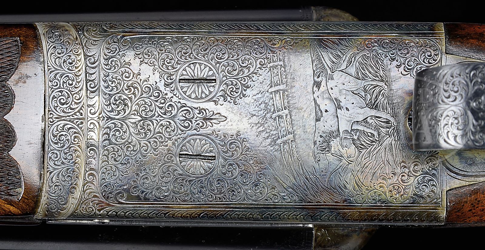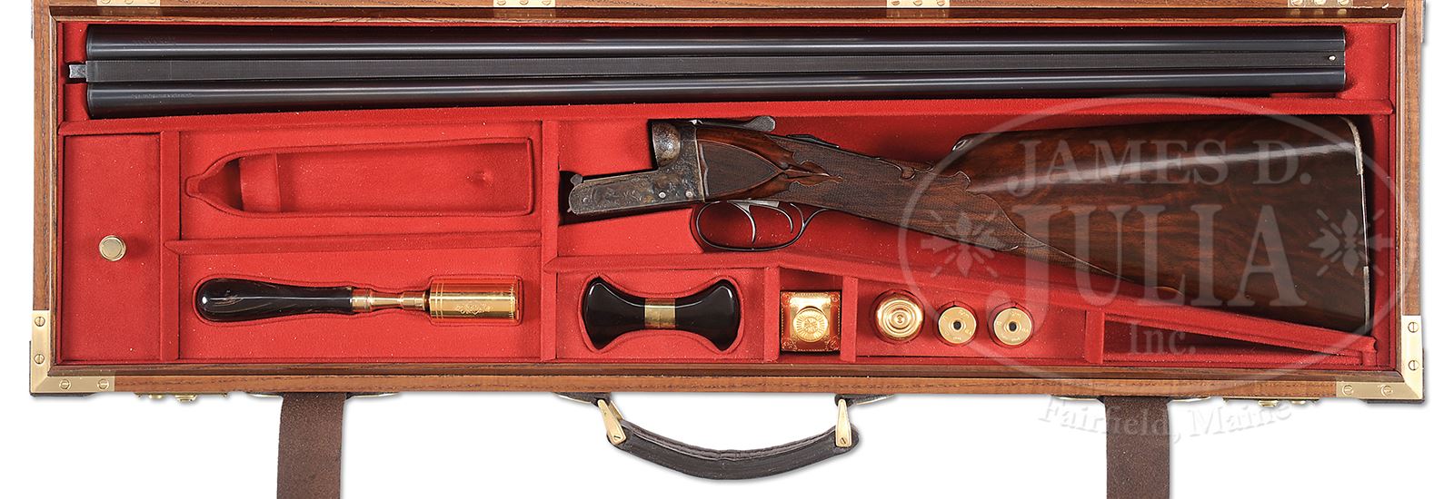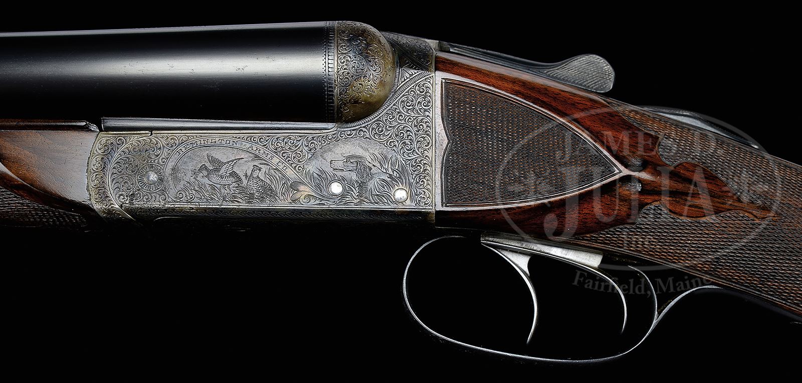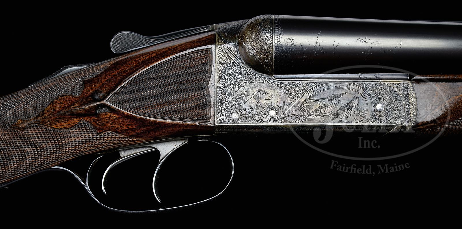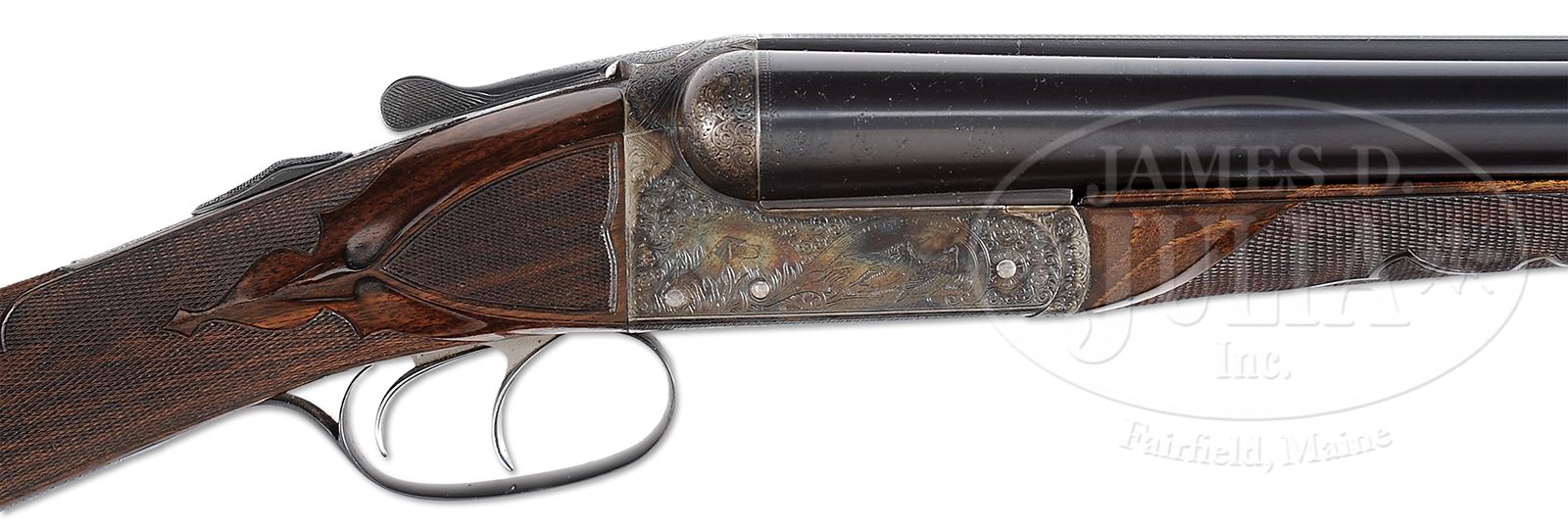 *FINELY RESTORED REMINGTON EEO MODEL 1894 TRAP GUN WITH CASE.SN 132270. Cal. 12 GA(1905). This scarce gun with a total production estimate of 50 in this grade, has 30″ Ordnance Steel bbls fitted with slightly raised, matted, flat rib. Tops of bbls are engraved “Remington Arms Co” “Ilion, N.Y. U.S.A.” and “ORDNANCE”. Bbl flats are stamped with SN and grade, and bottoms of bbls with “OEX”. Pattern count numbers “330” and “309” are on rear lump. Case hardened boxlock action features automatic safety, Remington’s third fastener, and dbl triggers. Water table is stamped with SN, grade, patent info, and “F”. Action is engraved in typical “E” style with near full coverage very well cut small scroll with vestigial scroll borders surrounding vignettes of dogs and game; front portion of left side shows a pair of partridge, one sitting, the other taking wing. Fine portrait of spaniel looks on from rear. A pair of woodcock are on right side with attentive pointer at rear. “REMINGTON ARMS CO” is in arched band over each bird scene. Trigger plate has more scroll surrounding fine scene of pointer and pointing setter in foreground, with rail fence and foliage in background. Scroll engraving is on trigger guard bow. SN is at grip. Nicely figured and lightly marbled European walnut straight grip buttstock measures 15-5/8″ over checkered wood butt with engraved and case hardened heel and toe plates, mounted on nearly invisible 1-3/4″ extension. Side panels are checkered and have arrowhead drop points. Very fancy bordered checkering has ribbons through pattern separating closer spaced checkering at rear, and on top. A gold oval on toe line is engraved “H F E From G P”. Matching splinter ejector forend has Remington’s Anson type release. Bore diameter: left -.729, right -.729. Bore restrictions: left -.010 (Lt mod), right -.005 (IC). Wall thickness: left -.025, right -.031. Drop at heel: 2-1/2″, drop at comb: 1-9/16″. Weight: 7 lbs 15 oz. LOP: 15-5/8″. Exceptionally high quality oak and dark brown leather by Huey (?) has stitched leather corners and central brass lozenge on top. It comes with khaki canvas outer cover with brown leather trim. Case is lined in red cloth, with gold embossed Remington label in lid, which is semi-french fitted for gun, and french fitted for a number of gold-plated accessories including 2-pc brass and ebony cleaning rod, chamber brush with horn handle, gold-plated oil bottle with scroll engraving and initials “BEA” and Remington logo, striker bottle, and pair of snap caps with horn ends marked “Rem” and “Mod 1894”. Also included is horn handled bow-tie set of turnscrews. PROVENANCE: Double Gun Journal Winter 1999, with article by Charles Semmer on this particular gun entitled “Remington Grade EEO From GP to HFE”, picturing and describing this fine gun with hand written inscription signed by Charles Semmer. The Estate of B. E. “Andy” Anderson. CONDITION: Excellent, as restored, retaining nearly all of its fine restoration refinish on wood and metal, with a number of pits on breech area of bbls that did not polish out, and with some other deep pitting on front left of action. Lengthening piece very expertly painted in, is very nearly invisible. Bores are very fine with light frosting toward breech ends. Action is tight. Ejectors are strong and in time. Case leather is excellent, as protected by its outer cover, which is also near new, with some light marks. Zipper is operable. Interior has some light compressions from contact with gun and bbls. Accessories are excellent. 49530-2 MGM297 (12,500-22,500) – Lot 2392 Click here to view provenance