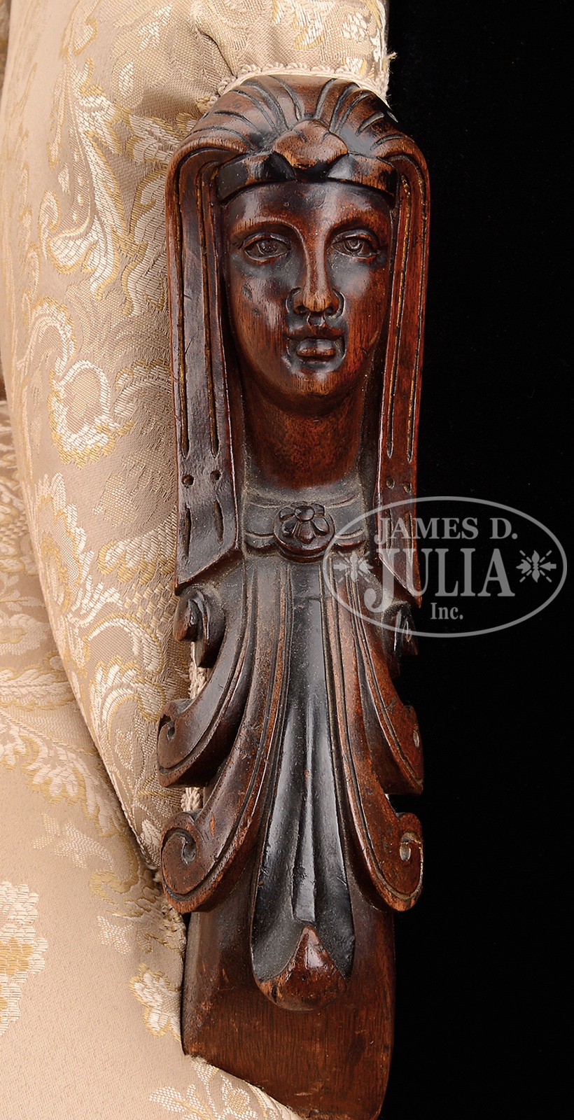 FINE RENAISSANCE REVIVAL WALNUT ARMCHAIR ATTRIBUTED TO JOHN JELLIFF TOGETHER WITH A WALNUT FOOTSTOOL.3rd quarter 19th century, New York. The elaborate carved crest centering an Elizabethan bust within molded roundel continuing to foliate carved ears with pendant urn on in-curved supports volutes centering an over-upholstered tufted back joined to down sloping arms on carved supports of classical Egyptian female busts centering the trapezoidal upholstered seat, the frontal crestrail bowed with burl panel inserts centering a rosette raised on dish-and ring-turned cylindrical frontal legs raised on casters. All upholstered in a cream and gold floral silk fabric. The accompanying square footstool, similarly covered, the burl frieze with central rosette and pendant finial flanked by angular supports on block disk and ring-turned cylindrical legs raised on brass casters. SIZE: Armchair: 42″ h x 28″ w. 14″ seat h. Footstool: 14-1/2″ h x 17″ square. PROVENANCE: Southampton Antiques to the current owner. CONDITION: Armchair with original surface and dark patina. Old stress cracks in crestrail at juncture of stile now professionally stabilized. Frame is tight and in good order. Footstool retains original surface, clean break on one support with loss to strut at juncture to leg. A second support strut with clean break. Three pendant finials absent. 49710-11 (500-600) – Lot 2392
